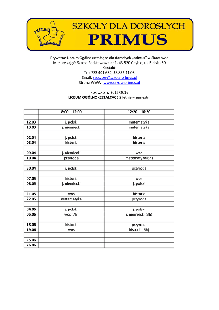 Prywatne Liceum Ogólnokształcące dla dorosłych „primus” w Skoczowie Miejsce zajęć: Szkoła Podstawowa nr 1, 43-520 Chybie, ul. Bielska 80 Kontakt: Tel: 733 401 684, 33 856 11 08 Email: [email protected] Strona WWW: www.szkola-primus.pl Rok szkolny 2015/2016 LICEUM OGÓLNOKSZTAŁCĄCE 2 letnie – semestr I 8:00 – 12:00 12:20 – 16:20 12.03 13.03 j. polski j. niemiecki matematyka matematyka 02.04 03.04 j. polski historia historia historia 09.04 10.04 j. niemiecki przyroda wos matematyka(6h) 30.04 j. polski przyroda 07.05 08.05 historia j. niemiecki wos j. polski 21.05 22.05 wos matematyka historia przyroda 04.06 05.06 j. polski wos (7h) j. polski j. niemiecki (3h) 18.06 19.06 historia wos przyroda historia (6h) 25.06 26.06
