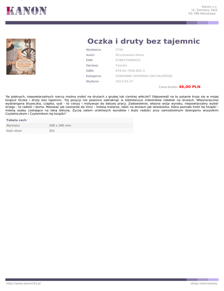 Kanon s.c. Ul. Zamiany 16/2 02-786 Warszawa Oczka i druty bez tajemnic Wydawca: ZYSK Autor: Strzykowska Maria EAN: 9788375068023 Oprawa: Twarda ISBN: 978-83-7506-802-3 Kategoria: PORADNIKI ŚPIEWNIKI ENCYKLOPEDIE Wydano: 2013-02-27 Cena brutto: 46,00 PLN 'Ile pięknych, niepowtarzalnych rzeczy można zrobić na drutach z grubej lub cienkiej włóczki? Odpowiedź na to pytanie kryje się w mojej książce Oczka i druty bez tajemnic. Tej pozycji nie powinno zabraknąć w biblioteczce miłośników robótek na drutach. Własnoręcznie wydziergana bluzeczka, czapka, szal - to cieszy i motywuje do dalszej pracy. Zadowolenie, własna wizja wyrobu, niepowtarzalny wybór ściegu - to radość i duma. Malować jak Leonardo da Vinci - mówią malarze, robić na drutach jak dziewiarka, która poznała treść tej książki mówią osoby czekające na taką lekturę. Życzę zatem urokliwych wyrobów i dużo radości przy samodzielnym dzierganiu wszystkim Czytelniczkom i Czytelnikom tej książki!' Tabela cech Wymiary 208 x 280 mm Ilość stron 352 http://www.kanon24.pl sklep internetowy
