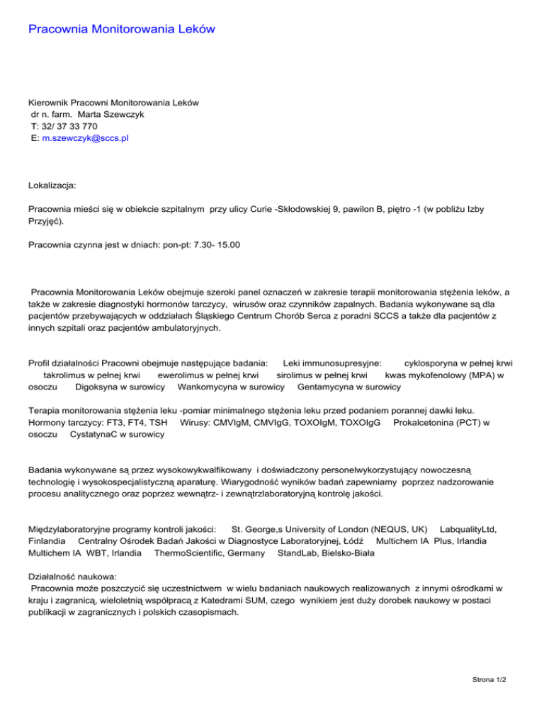 Pracownia Monitorowania Leków - Śląskie Centrum Chorób Serca