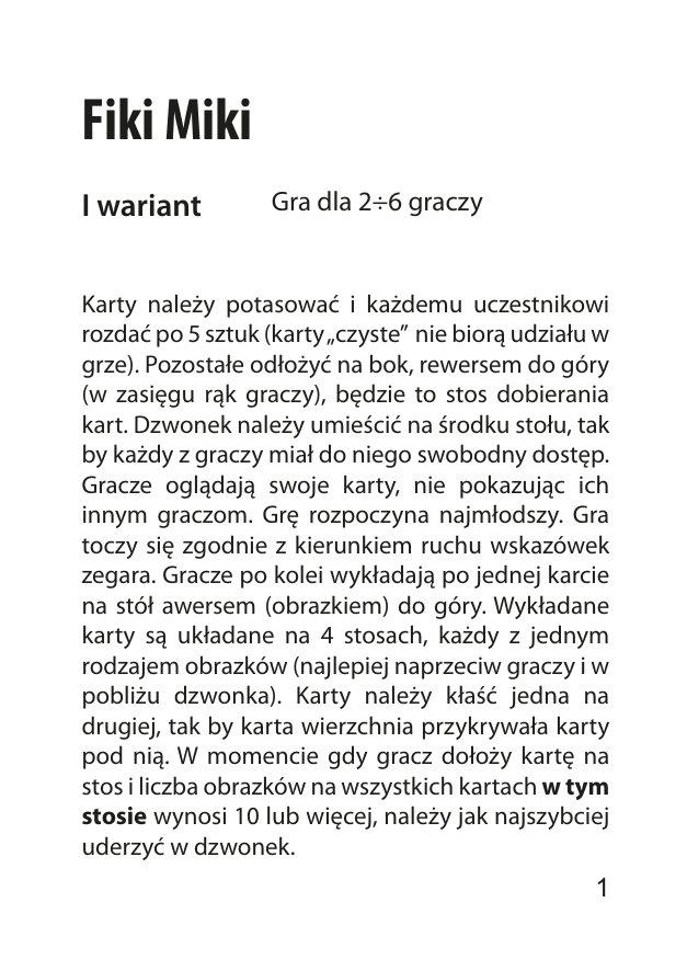 Fiki Miki I wariant Gra dla 2÷6 graczy Karty należy potasować i każdemu uczestnikowi rozdać po 5 sztuk (karty „czyste” nie biorą udziału w grze). Pozostałe odłożyć na bok, rewersem do góry (w zasięgu rąk graczy), będzie to stos dobierania kart. Dzwonek należy umieścić na środku stołu, tak by każdy z graczy miał do niego swobodny dostęp. Gracze oglądają swoje karty, nie pokazując ich innym graczom. Grę rozpoczyna najmłodszy. Gra toczy się zgodnie z kierunkiem ruchu wskazówek zegara. Gracze po kolei wykładają po jednej karcie na stół awersem (obrazkiem) do góry. Wykładane karty są układane na 4 stosach, każdy z jednym rodzajem obrazków (najlepiej naprzeciw graczy i w pobliżu dzwonka). Karty należy kłaść jedna na drugiej, tak by karta wierzchnia przykrywała karty pod nią. W momencie gdy gracz dołoży kartę na stos i liczba obrazków na wszystkich kartach w tym stosie wynosi 10 lub więcej, należy jak najszybciej uderzyć w dzwonek. 1 Ten, kto uderzy pierwszy, zabiera ten stos i odkłada go obok siebie (rewersem do góry) - są to zdobyte przez niego punkty. Jeżeli gracz się pomyli i we wskazanym stosie jest mniejsza liczba obrazków, to nie zdobywa stosu kart, traci kolejkę i prawo do przyciskania dzwonka przez następną kolejkę. Gracz zawsze po wyłożeniu karty dobiera kolejną kartę ze stosu dobierania kart. Gra kończy się, gdy gracze pozbędą się wszystkich kart z ręki. Wygrywa ten, kto ma najwięcej zebranych kart. 2 II wariant Gra dla 2÷4 graczy Wariant A Każdy gracz otrzymuje po 8 kart. Karty należy trzymać w ręku tak, by inni gracze ich nie widzieli. Grę rozpoczyna najstarszy gracz. Zaczyna on od wyłożenia karty na stół. Pozostali gracze dokładają kolejno po jednej karcie z takim samym obrazkiem jak na karcie wyłożonej. Jeżeli gracz nie ma wśród swoich kart pasującej, to dokłada kartę czystą (jeśli ją posiada). Jeżeli gracz nie ma ani karty z pasującymi obrazkami, ani karty czystej, to musi jedną ze swoich kart odłożyć na bok - jest ona usunięta z gry. Gracz, który wykładał kartę, zabiera ją oraz wszystkie karty dołożone przez pozostałych graczy i odkłada je rewersem do góry obok siebie. Następnie każdy z graczy dobiera jedną kartę ze stosu i kolejny, po rozpoczynającym, gracz wykłada swoją kartę. Gra toczy się do momentu gdy wszyscy gracze pozbędą się swoich kart. Wygrywa ten, kto w swoich zebranych kartach ma największą liczbę obrazków. 3 * Jeśli gracz zostanie na koniec z białą kartą (którą powinien wyłożyć) to nie może jej użyć, traci swoją kolejkę i kończy grę. Wariant B (z dzwonkiem). Po wyłożeniu karty przez gracza pozostali mogą nacisnąć dzwonek - jeżeli nie posiadają pasującej karty. Gracz, który zrobi to jako pierwszy - nie musi odrzucać karty. Jeżeli gracz się pomyli i okaże się, że ma taką kartę, to za karę musi odrzucić 2 karty. Gra kończy się, gdy któryś z graczy nie ma już kart. Wówczas obrazki z kart, które zostały na ręce graczy są doliczane przez nich do obrazków ze zdobytych kart. Wygrywa ten, kto w sumie ma największą liczbę obrazków. * Jeśli gracz zostanie na koniec z białą kartą (którą powinien wyłożyć) to nie może jej użyć, traci swoją kolejkę i kończy grę. 4