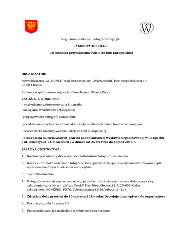 Regulamin Konkursu Fotograficznego pt.: ,,Z EUROPY DO KIELC” 10 rocznica przystąpienia Polski do Unii Europejskiej ORGANIZATOR: Stowarzyszenie ,,WIZJONER” z siedzibą w galerii ,,Wieża sztuki” Plac Niepodległości 1 A; 25-001 Kielce Konkurs współfinansowany ze środków Urzędu Miasta Kielce ZAŁOŻENIA KONKURSU: - rozbudzanie zainteresowania fotografią - rozwijanie wrażliwości artystycznej - propagowanie fotografii amatorskiej -przedstawienie w kadrze zmian jakie zaszły w Kielcach dzięki funduszom unijnym - uczczenie 10 rocznicy wejścia Polski do Unii Europejskiej - prezentacja najciekawszych prac na pokonkursowej wystawie organizowanej w Geoparku / ul. Daleszycka 21 w Kielcach /w dniach od 25 czerwca do 4 lipca 2014 r. ZASADY UCZESTNICTWA: 1. Konkurs jest otwarty dla wszystkich miłośników fotografii- amatorów 2. Każdy autor może nadesłać 3 fotografie Kielc przedstawiające obiekty zmodernizowane bądź wybudowane dzięki funduszom europejskim 3. Technika dowolna 4. Fotografie w wersji papierowej należy przesłać lub dostarczyć wraz z dołączoną kartą zgłoszeniową na adres: ,,Wieża Sztuki” Plac Niepodległości 1 A, 25-001 Kielce z dopiskiem: KONKURS- FOTO. Galeria czynna 11-18/sobota 11- 14/ 5. Zdjęcia należy przesłać do 10 czerwca 2014 roku. Decyduje data wpływu do organizatora 6. Format prac: do formatu A-3 7. Prace zrolowane lub nadesłane w tubie nie będą oceniane 8. Fotografie, na których znajdować się będą jakiekolwiek znaki, cyfry /np. daty/ będą dyskwalifikowane 9. W treści karty zgłoszenia należy podać: imię i nazwisko, adres autora, telefon kontaktowy, adres mailowy, wiek autora, tytuł pracy, miejsce dokonania zdjęcia, komentarz do zdjęcia oraz oświadczenie o posiadaniu praw autorskich do zdjęć oraz zgodę na przetwarzanie danych osobowych, zgodnie z załącznikiem do niniejszego regulaminu 10. Prace nadesłane na Konkurs przechodzą na własność organizatora i nie będą zwracane KOMISJA OCENIAJĄCA: 11. Organizator powoła Radę Artystyczną, która dokona oceny prac oraz wyłoni laureatów w dwóch kategoriach wiekowych : - do 18 lat - powyżej 18 lat Decyzja Jury jest ostateczna 12. Organizator przewiduje przyznanie: I, II i III miejsce oraz wyróżnienie w każdej kategorii wiekowej. Nagrody rzeczowe nie podlegają zamianie na ekwiwalent pieniężny 13. Rozstrzygnięcie konkursu nastąpi 12 czerwca 2014 r. 14. Wszyscy laureaci zostaną powiadomieni o werdykcie komisji 15. Wręczenie nagród przez Prezydenta Miasta Kielce nastąpi na wystawie pokonkursowej w środę 25 czerwca 2014 r. o godzinie 18.00 w Geoparku / ulica Daleszycka 21/ w Kielcach 16. Nadesłanie prac oznacza akceptację regulaminu. Żadne odwołania nie zostaną uwzględnione 17. Udział w konkursie jest jednoznaczny z bezpłatnym udzieleniem prawa do nieodpłatnego wykorzystywania prac w następujących polach eksploatacji: druku w dowolnej liczbie publikacji i w dowolnym nakładzie, używania ich w internecie oraz w innych formach utrwaleń, nadających się do rozpowszechniania w ramach działań Stowarzyszenia ,,WIZJONER” 18. Udział w konkursie jest równoznaczny z wyrażeniem zgody na przetwarzanie przez organizatora danych osobowych na potrzeby konkursu oraz w celach marketingowych organizatora/ustawa o ochronie danych osobowych z dn.29.08.1997 r. Dz.U. Nr 133 poz.833 z póz. zm./. Osoby uczestniczące w konkursie wyrażają zgodę na przesłanie do organizatora oświadczenia zgodnie z załącznikiem do niniejszego regulaminu 19. Wszelkich informacji udziela Tomasz Irski nr tel. 609 82 85 18; e-mail: [email protected] KARTA ZGŁOSZENIA UCZESTNICTWA W KONKURSIE FOTOGRAFICZNYM ,, Z EUROPY DO KIELC” 10 ROCZNICA PRZYSTĄPIENIA POLSKI DO UNII EUROPEJSKIEJ 1. Imię i nazwisko autora …………………………………………………………………………………………………………………………………… 2. Adres autora ……………………………………………………………………………………………………………………………………. 3. Nr telefonu ………………………………………..e-mail: ……………………………………………………………… 4. Wiek autora: …………………………… Nr TYTUŁ PARCY MIEJSCE FOTOGRAFOWANIA KOMENTARZ Oświadczenia: 1* - Oświadczam, że zapoznałam/ łem się z Regulaminem Konkursu Fotograficznego pt.: ,,Z EUROPY DO KIELC” i akceptuję jego treść w całości. Wyrażam zgodę na przetwarzanie moich danych osobowych w celach wynikających z Regulaminu Konkursu, zgodnie z ustawą z dnia 29VIII 1997 roku o ochronie danych osobowych /Dz.U. z 2002, Nr 101,poz. 926 z póź. zm./ ………………………………………………………. data i podpis 2*-Wyrażam zgodę na udział mojego dziecka /imię i nazwisko/ …………………………………................................................................................................................................................................ w Konkursie Fotograficznym pt.: ,, Z EUROPY DO KIELC”. Wyrażam zgodę na przetwarzanie danych osobowych mojego dziecka w celach wynikających z Regulaminu Konkursu, zgodnie z ustawą z dnia 29 VIII1997 r. o ochronie danych osobowych / Dz. U. z 2002, Nr 101,poz. 926 z póź. zm./ ………………………………………………………. data i podpis *- oświadczenie Nr 1 wypełniają osoby pełnoletnie biorące udział w konkursie. **-oświadczenie Nr 2 wypełniają rodzice lub opiekunowie osób niepełnoletnich biorących udział w konkursie. KARTĘ ZGŁOSZENIOWĄ PROSIMY WYPEŁNIĆ CZYTELNIE, DRUKOWANYMI LITERAMI I ODRĘCZNIE PODPISAĆ.