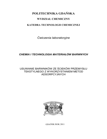 POLITECHNIKA GDAŃSKA WYDZIAŁ CHEMICZNY KATEDRA TECHNOLOGII CHEMICZNEJ Ćwiczenia laboratoryjne CHEMIA I TECHNOLOGIA MATERIAŁÓW BARWNYCH USUWANIE BARWNIKÓW ZE ŚCIEKÓW PRZEMYSŁU TEKSTYLNEGO Z WYKORZYSTANIEM METOD ADSORPCYJNYCH GDAŃSK ROK 2011 1. Cel ćwiczenia Celem ćwiczenia jest zapoznanie studentów z nowymi, bardziej przyjaznymi środowisku metodami oczyszczania ścieków. Alternatywą dla metod adsorpcyjnych, w których wykorzystuje się tradycyjne adsorbenty, takie jak np. węgiel aktywny, są metody w których wykorzystuje się biodegradowalne adsorbenty. Stanowią one często odpad poprodukcyjny, a zastosowanie ich np. do oczyszczania ścieków pozwala na ich zagospodarowanie. 2. Wprowadzenie 2.1. Adsorpcja Adsorpcja to zjawisko, które określa się jako gromadzenie się substancji rozpuszczonych w cieczy lub obecnych w fazie gazowej na powierzchni ciała stałego albo cieczy. Pierwsze badania nad procesami adsorpcji zostały przeprowadzone przez szwedzkiego aptekarza Carla Scheele, który zajmował się m.in. badaniami adsorpcji gazów na węglu drzewnym. Substancja ulegająca adsorpcji (adsorbat) najczęściej znajduje się praktycznie tylko w jednej z faz objętościowych (w fazie ciekłej lub gazowej) i dlatego proces adsorpcji opisuje się jako podział danej substancji pomiędzy fazę objętościową a fazę powierzchniową. W zależności od natury sił powodujących proces adsorpcji wyróżnia się adsorpcję fizyczną i chemiczną (chemisorpcja). Adsorpcja fizyczna zachodzi wskutek niespecyficznych oddziaływań typu van der Waalsa. Szybkość tego procesu zależy przede wszystkim od szybkości dyfuzji adsorbatu ku powierzchni, a efekt energetyczny (ciepło adsorpcji) jest niewielki – rzędu kilku kilodżuli na mol adsorbatu. W przypadku chemisorpcji wiązanie adsorbatu następuje za sprawą oddziaływania chemicznego. Ze względu na charakter zjawiska chemisorpcja jest zjawiskiem specyficznym występującym na niektórych adsorbentach i wobec określonych cząsteczek. Na powierzchni adsorbentu ulega chemisorpcji tylko taka ilość adsorbatu, jaka wystarcza do jej pokrycia monowarstwą. Adsorpcja tylko w wyjątkowych przypadkach przebiega na całej powierzchni adsorbentu; z reguły czynna jest tylko cześć powierzchni, tzw. centra aktywne. Niekiedy stwierdza się istnienie kilku centrów zdolnych do selektywnego oddziaływania z określonymi indywiduami chemicznymi. Zjawiska tego typu odgrywają kluczową rolę w procesach katalizy kontaktowej. 2 Adsorpcja zachodzi prawie zawsze w przypadku zetknięcia się gazów lub cieczy z fazą stałą. Równowaga ustalająca się w procesie adsorpcji zależy od kilku czynników. Dla układu ciało stałe – gaz: f(a, p, T) = 0, zaś dla przypadku adsorpcji z roztworu: f(a, c, T) = 0, gdzie: a- ilość substancji zaadsorbowanej na powierzchni adsorbentu o masie jednostkowej; p- prężność równowagowa gazu w fazie objętościowej; c- stężenie równowagowe substancji adsorbowanej w fazie objętościowej; T- temperatura bezwzględna. Badając proces adsorpcji w warunkach stałej temperatury (T = const) uzyskuje się izotermę. Gdy p = const otrzymaną zależność określa się jako izobarę, pomiary w warunkach a = const dają zaś izosterę. Najczęściej stosowaną zależnością w badaniu adsorpcji jest izoterma adsorpcji. Wynika to nie tylko z faktu, że taki model jest najlepiej opracowany teoretycznie, ale również z tego powodu, że stanowi ona najdogodniejszą formę przedstawiania danych doświadczalnych. Do opisu procesu adsorpcji stosuje się kilka modeli. Jednym z nich jest izoterma Langmuira, dobrze opisująca procesy chemisorpcji, głównie w układzie ciało stałegaz. Równowaga adsorpcyjna w układzie ciało stałe – ciecz może zostać opisana także empirycznym równaniem określanym jako izoterma Freundlicha. a= kcn gdzie: a – liczba moli substancji zaadsorbowanej przez 1 g adsorbentu c – stężenie molowe roztworu w stanie równowagi adsorpcyjnej k, n - stałe (n<1). Równanie Freundlicha jest obecnie stosowane rzadko, częściej korzysta się z modeli bazujących na gruncie termodynamiki. 2.2. Adsorbenty Adsorbenty można podzielić wg kilku kryteriów. Jednym z nich jest podział ze względu na porowatość. Wyróżnia się adsorbenty nieporowate (sadza grafitowana) o niewielkiej powierzchni właściwej oraz adsorbenty porowate o powierzchni właściwej od setek do tysiąca m2/g. Do tej ostatniej grupy zalicza się m.in. węgle aktywne, żele krzemionkowe, zeolity. Rodzaj adsorbentu dobiera się w zależności od właściwości substancji adsorbowanej. Na przykład na węglu aktywnym bardzo dobrze adsorbują się rozpuszczalniki aromatyczne, słabo zaś alkohole. Alkohole są z kolei dobrze adsorbowane np. przez złoża zeolitowe (sita molekularne typu 4A). Węgiel aktywny 3 jest adsorbentem otrzymywanym syntetycznie, zeolity zaś są substancjami naturalnymi. Istotną grupę adsorbentów stanowią bioadsorbenty np. algi czy grzyby wykazujące zdolność kumulowania metali ciężkich. Procesy adsorpcji mają ogromne znaczenie praktyczne. Adsorpcję stosuje się nie tylko w tradycyjnych procesach oczyszczania i rozdzielania mieszanin gazowych i ciekłych (np. metody chromatograficzne). Proces ten może być także wykorzystany np. do adsorpcyjnego magazynowania paliw. Jakkolwiek w każdym procesie adsorpcji istnieje konieczność regeneracji adsorbentu, czyli przywrócenia mu właściwości porównywalnych z wyjściowymi. Etap regeneracji (desorpcji) może być prowadzony kilkoma metodami w zależności od rodzaju substancji zaadsorbowanej i rodzaju adsorbentu. Na przykład przez poddanie działaniu podwyższonej temperatury pod zmniejszonym ciśnieniem czy wymianę adsorpcyjną. Żadna jednak z zastosowanych metod nie przywraca pierwotnych właściwości adsorbentu w 100 procentach, a ekonomicznych, każda z metod energetycznych regeneracji czy wymaga materiałowych. nakładów Ostateczn