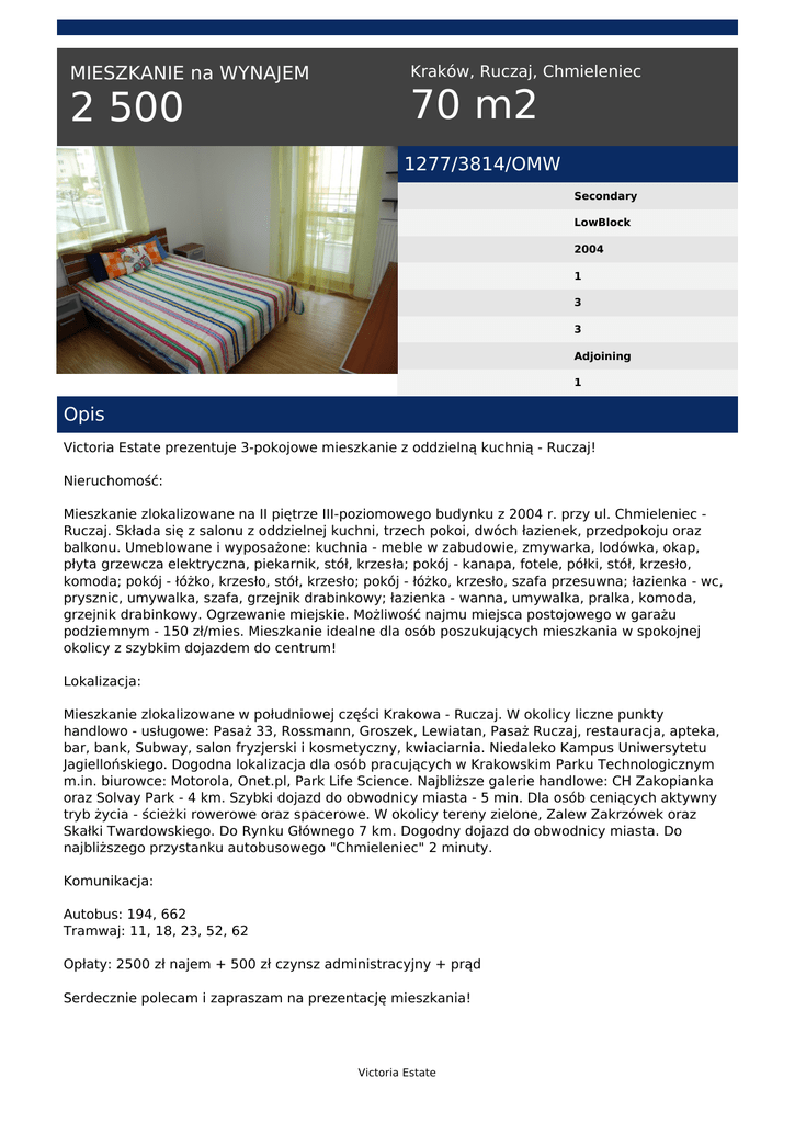 MIESZKANIE na WYNAJEM 2 500 Kraków, Ruczaj, Chmieleniec 70 m2 1277/3814/OMW Secondary LowBlock 2004 1 3 3 Adjoining 1 Opis Victoria Estate prezentuje 3-pokojowe mieszkanie z oddzielną kuchnią - Ruczaj! Nieruchomość: Mieszkanie zlokalizowane na II piętrze III-poziomowego budynku z 2004 r. przy ul. Chmieleniec Ruczaj. Składa się z salonu z oddzielnej kuchni, trzech pokoi, dwóch łazienek, przedpokoju oraz balkonu. Umeblowane i wyposażone: kuchnia - meble w zabudowie, zmywarka, lodówka, okap, płyta grzewcza elektryczna, piekarnik, stół, krzesła; pokój - kanapa, fotele, półki, stół, krzesło, komoda; pokój - łóżko, krzesło, stół, krzesło; pokój - łóżko, krzesło, szafa przesuwna; łazienka - wc, prysznic, umywalka, szafa, grzejnik drabinkowy; łazienka - wanna, umywalka, pralka, komoda, grzejnik drabinkowy. Ogrzewanie miejskie. Możliwość najmu miejsca postojowego w garażu podziemnym - 150 zł/mies. Mieszkanie idealne dla osób poszukujących mieszkania w spokojnej okolicy z szybkim dojazdem do centrum! Lokalizacja: Mieszkanie zlokalizowane w południowej części Krakowa - Ruczaj. W okolicy liczne punkty handlowo - usługowe: Pasaż 33, Rossmann, Groszek, Lewiatan, Pasaż Ruczaj, restauracja, apteka, bar, bank, Subway, salon fryzjerski i kosmetyczny, kwiaciarnia. Niedaleko Kampus Uniwersytetu Jagiellońskiego. Dogodna lokalizacja dla osób pracujących w Krakowskim Parku Technologicznym m.in. biurowce: Motorola, Onet.pl, Park Life Science. Najbliższe galerie handlowe: CH Zakopianka oraz Solvay Park - 4 km. Szybki dojazd do obwodnicy miasta - 5 min. Dla osób ceniących aktywny tryb życia - ścieżki rowerowe oraz spacerowe. W okolicy tereny zielone, Zalew Zakrzówek oraz Skałki Twardowskiego. Do Rynku Głównego 7 km. Dogodny dojazd do obwodnicy miasta. Do najbliższego przystanku autobusowego "Chmieleniec" 2 minuty. Komunikacja: Autobus: 194, 662 Tramwaj: 11, 18, 23, 52, 62 Opłaty: 2500 zł najem + 500 zł czynsz administracyjny + prąd Serdecznie polecam i zapraszam na prezentację mieszkania! Victoria Estate Natalia Sujdak tel. +48 516 547 102 email: [email protected] Victoria Estate Powered by TCPDF (www.tcpdf.org)