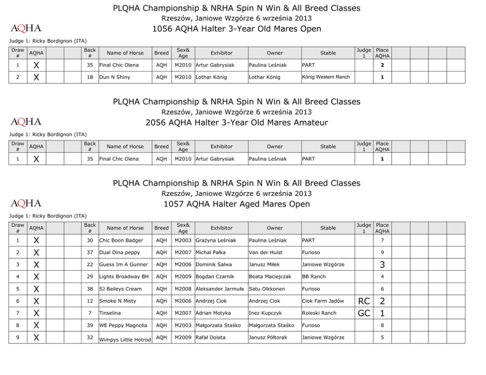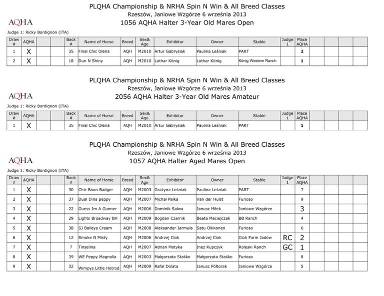 PLQHA Championship & NRHA Spin N Win & All Breed Classes Rzeszów, Janiowe Wzgórze 6 września 2013 1056 AQHA Halter 3-Year Old Mares Open Judge 1: Ricky Bordignon (ITA) Draw # 1 2 AQHA X X Back # Name of Horse Breed Sex& Age Exhibitor Owner Stable Judge Place 1 AQHA 35 Final Chic Olena AQH M2010 Artur Gabrysiak Paulina Leśniak PART 2 18 Dun N Shiny AQH M2010 Lothar König Lothar König König Western Ranch 1 PLQHA Championship & NRHA Spin N Win & All Breed Classes Rzeszów, Janiowe Wzgórze 6 września 2013 2056 AQHA Halter 3-Year Old Mares Amateur Judge 1: Ricky Bordignon (ITA) Draw # AQHA Back # 1 X 35 Name of Horse Final Chic Olena Breed AQH Sex& Age Exhibitor M2010 Artur Gabrysiak Owner Paulina Leśniak Stable Judge Place 1 AQHA PART 1 PLQHA Championship & NRHA Spin N Win & All Breed Classes Rzeszów, Janiowe Wzgórze 6 września 2013 1057 AQHA Halter Aged Mares Open Judge 1: Ricky Bordignon (ITA) Draw # 1 2 3 4 5 6 7 8 9 AQHA X X X X X X X X X Back # Name of Horse Breed Sex& Age Exhibitor Owner Stable Judge Place 1 AQHA 30 Chic Boon Badger AQH M2003 Grażyna Leśniak Paulina Leśniak PART 7 37 Dual Dina peppy AQH M2007 Michał Pałka Van der Hulst Furioso 9 22 Guess Im A Gunner AQH M2006 Dominik Salwa Janusz Miłek Janiowe Wzgórze 3 29 Lights Broadway BH AQH M2009 Bogdan Czarnik Beata Maciejczak BB Ranch 4 38 SJ Baileys Cream AQH M2008 Aleksander Jarmuła Satu Olkkonen Furioso 6 12 Smoke N Misty AQH M2006 Andrzej Ciok Andrzej Ciok Ciok Farm Jadów Tinselina AQH M2007 Adrian Motyka Inez Kupczyk Roleski Ranch WE Peppy Magnolia AQH M2003 Małgorzata Staśko Małgorzata Staśko Furioso 8 AQH M2009 Rafał Dolata Janusz Półtorak Janiowe Wzgórze 5 7 39 32 Wimpys Little Hotrod RC GC 2 1 PLQHA Championship & NRHA Spin N Win & All Breed Classes Rzeszów, Janiowe Wzgórze 6 września 2013 2057 AQHA Halter Aged Mares Amateur Judge 1: Ricky Bordignon (ITA) Draw # 1 2 3 4 AQHA X X X X Back # Name of Horse Breed Sex& Age Exhibitor Owner Stable 39 WE Peppy Magnolia AQH M2003 Małgorzata Staśko Małgorzata Staśko Furioso 12 Smoke N Misty AQH M2006 Andrzej Ciok Andrzej Ciok Ciok Farm Jadów 30 Chic Boon Badger AQH M2003 Paulina Leśniak Paulina Leśniak PART 29 Lights Broadway BH AQH M2009 Beata Maciejczak Beata Maciejczak BB Ranch Judge Place 1 AQHA 4 GC RC 1 3 2 PLQHA Championship & NRHA Spin N Win & All Breed Classes Rzeszów, Janiowe Wzgórze 6 września 2013 4057 AQHA Halter Aged Mares Youth Judge 1: Ricky Bordignon (ITA) Draw # AQHA Back # 1 X 20 Name of Horse Arcletic Zanitari Breed AQH Sex& Age Exhibitor M2007 Patrycja Jurasz Owner Stable Judge Place 1 AQHA 1 Anna Jurasz PLQHA Championship & NRHA Spin N Win & All Breed Classes Rzeszów, Janiowe Wzgórze 6 września 2013 1077 AQHA Halter Aged Geldings Open Judge 1: Ricky Bordignon (ITA) Draw # 1 2 3 4 5 6 7 8 9 AQHA X X X X X X X X X Back # Name of Horse Breed Sex& Age Exhibitor Owner Stable Judge Place 1 AQHA 36 Whizard In Chrome AQH G2008 Rafał Dolata Heike Rosener Janiowe Wzgórze 5 19 Spook Dun It All AQH G2008 Andrzej Ciok Andrzej Ciok Ciok Farm Jadów 23 Smoking Rickochet 023 AQH G2004 Kate Szumańska Kate Szumańska Janiowe Wzgórze 3 1 17 Red River Fifty AQH G2005 Kamila Sobkowiak Dariusz Sobkowiak 33 JM Step By Step AQH G2009 Dominik Salwa Janusz Miłek Janiowe Wzgórze 25 JM Mega Matti AQH G2009 Piotr Pietryka Janusz Miłek Janiowe Wzgórze 14 Jac Dun Jac AQH G2009 40 Dual Dun It AQH G2009 Michał Pałka Janusz Wantuch Furioso 9 27 Broady Chic AQH G2004 Artur Gabrysiak Artur Gabrysiak PART 7 Gerrit van Wijngaarden GC 4 Gerrit van Wijngaarden RC 2 8 6 PLQHA Championship & NRHA Spin N Win & All Breed Classes Rzeszów, Janiowe Wzgórze 6 września 2013 2077 AQHA Halter Aged Geldings Amateur Judge 1: Ricky Bordignon (ITA) Draw # 1 2 3 4 5 6 AQHA X X X X X X Back # Name of Horse Breed Sex& Age Exhibitor Owner Stable Judge Place 1 AQHA RC GC 2 1 19 Spook Dun It All AQH G2008 Andrzej Ciok Andrzej Ciok Ciok Farm Jadów 23 Smoking Rickochet 023 AQH G2004 Kate Szumańska Kate Szumańska Janiowe Wzgórze 26 Smartin Doc Bar AQH G2006 Dominika Dubowik Dominika Dubowik Janiowe Wzgórze 6 2 Jacs Golden Slide AQH G2006 Izabella Żarnawska Izabella Żarnawska WRC Bronco 3 Gerrit van Wijngaarden Artur Gabrysiak 14 Jac Dun Jac AQH Gerrit van G2009 Wijngaarden 27 Broady Chic AQH G2004 Artur Gabrysiak 5 PART 4 PLQHA Championship & NRHA Spin N Win & All Breed Classes Rzeszów, Janiowe Wzgórze 6 września 2013 4077 AQHA Halter Aged Geldings Youth Judge 1: Ricky Bordignon (ITA) Draw # 1 2 3 4 AQHA X X X X Back # 17 14 2 46 Name of Horse Red River Fifty Breed Sex& Age Exhibitor Owner AQH G2005 Kamila Sobkowiak Dariusz Sobkowiak Jac Dun Jac AQH Viktor van G2009 Wijngaarden Gerrit van Wijngaarden Jacs Golden Slide AQH G2006 Michalina Żarnawska Izabella Żarnawska Winning Roleski Jac AQH G2007 Anna Stachura Stable Judge Place 1 AQHA RC WRC Bronco GC Edyta Jafernik Stachura 2 3 1 4 PLQHA Championship & NRHA Spin N Win & All Breed Classes Rzeszów, Janiowe Wzgórze 6 września 2013 1033 AQHA 3-Year-Old Stallions Open Judge 1: Ricky Bordignon (ITA) Draw # AQHA Back # 1 X 21 Name of Horse Ruf Star Cayetan Breed AQH Sex& Age Exhibitor S2010 Lothar König Owner Lothar König Stable König Western Ranch Judge Place 1 AQHA 1 PLQHA Championship & NRHA Spin N Win & All Breed Classes Rzeszów, Janiowe Wzgórze 6 września 2013 1034 AQHA Aged Stallions Open Judge 1: Ricky Bordignon (ITA) Draw # 1 2 3 4 5 AQHA X X X X X Back # Name of Horse Breed Sex& Age Exhibitor Owner Stable Judge Place 1 AQHA 41 Flames O Rima AQH S2004 Michał Pałka Aleksander Jarmuła Furioso 5 15 JM Wimpys Blackboy AQH S2009 Rafał Dolata Borys Pardus Janiowe Wzgórze 3 Lean With Hollywood AQH S2002 Adrian Motyka Katarzyna Roleska Roleski Ranch Major N Smart AQH S2004 Aleksander Jarmuła Leszek Stawicki Furioso 3 1 2 AQH Gerrit van S2000 Wijngaarden Gerrit van Wijngaarden 42 11 MR Sparkle Joe GC RC 4 PLQHA Championship & NRHA Spin N Win & All Breed Classes Rzeszów, Janiowe Wzgórze 6 wrz