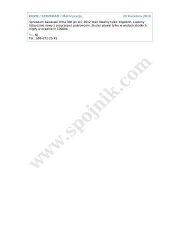 KUPIĘ / SPRZEDAM | Motoryzacja 20 Kwietnia 2016 Sprzedam Kawasaki Ultra 300 jet ski, 2012 Stan idealny tylko 34godzin, kupiony fabrycznie nowy z przyczepa I pokrowcem. Skuter plywal tylko w wodach slodkich nigdy w oceanie!!! 13000$ w w w .s po jn ik .c o m Mc, NJ Tel.: 609-672-25-45