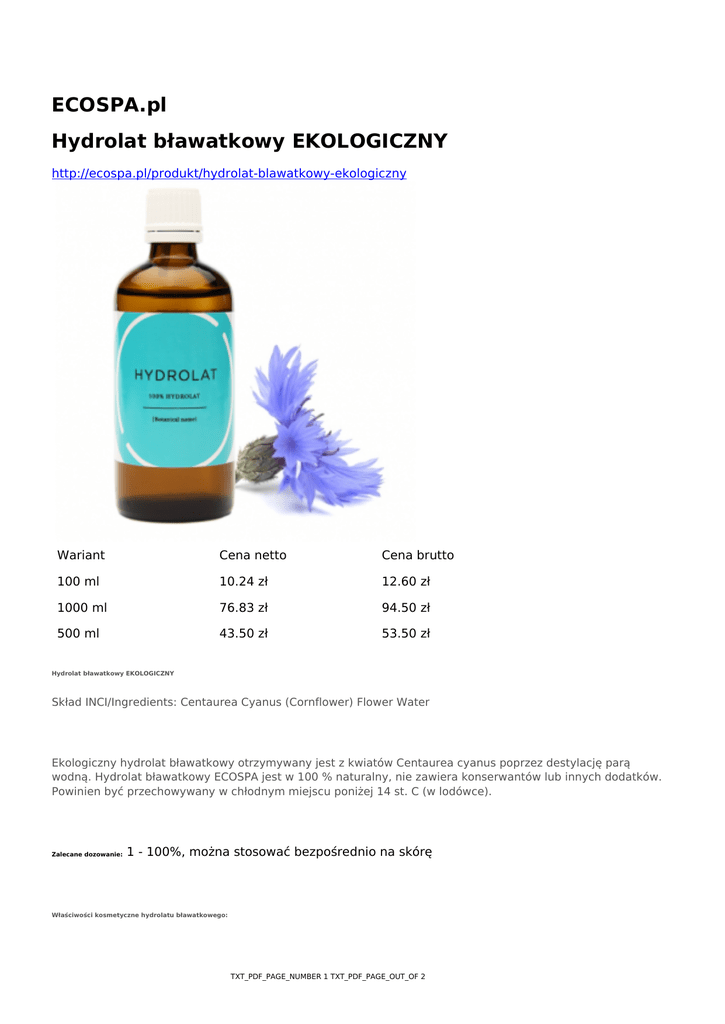 ECOSPA.pl Hydrolat bławatkowy EKOLOGICZNY http://ecospa.pl/produkt/hydrolat-blawatkowy-ekologiczny Wariant Cena netto Cena brutto 100 ml 10.24 zł 12.60 zł 1000 ml 76.83 zł 94.50 zł 500 ml 43.50 zł 53.50 zł Hydrolat bławatkowy EKOLOGICZNY Skład INCI/Ingredients: Centaurea Cyanus (Cornflower) Flower Water Ekologiczny hydrolat bławatkowy otrzymywany jest z kwiatów Centaurea cyanus poprzez destylację parą wodną. Hydrolat bławatkowy ECOSPA jest w 100 % naturalny, nie zawiera konserwantów lub innych dodatków. Powinien być przechowywany w chłodnym miejscu poniżej 14 st. C (w lodówce). 1 - 100%, można stosować bezpośrednio na skórę Zalecane dozowanie: Właściwości kosmetyczne hydrolatu bławatkowego: TXT_PDF_PAGE_NUMBER 1 TXT_PDF_PAGE_OUT_OF 2 Hydrolat bławatkowy usuwa obrzęki, działa przeciwzapalnie, łagodząco i chłodząco. Jako jeden z nielicznych, polecany jest do pielęgnacji oczu (minimalizuje zaczerwienienie i obrzęk spowodowany m.in. wielogodzinną pracą przy komputerze). Ma on właściwości przeciwłupieżowe, jak również wspomagające leczenie grzybicy skóry głowy. Polecany do delikatnej skóry twarzy, szyi i dekoltu, jak również do codziennej pielęgnacji cery naczyniowej, wrażliwej, podrażnionej i suchej. Zastosowanie: Znajduje on zastosowanie w kosmetykach do pielęgnacji skóry wokół oczu (kremy i nawilżająco-łagodzące żele pod oczy, kompresy, płyny do usuwania makijażu). Może być stosowany jako składnik masek, kremów, lotionów do skory wrażliwej, podrażnionej, naczyniowej i suchej. Może być stosowany samodzielnie jako tonik. Ze względu na swój zbawienny wpływ na włosy, używany jest również w recepturach szamponów, odżywek, masek i płukanek do włosów z łupieżem. TXT_PDF_PAGE_NUMBER 2 TXT_PDF_PAGE_OUT_OF 2