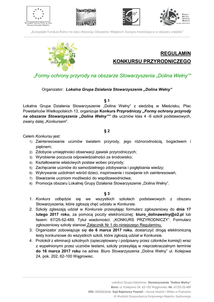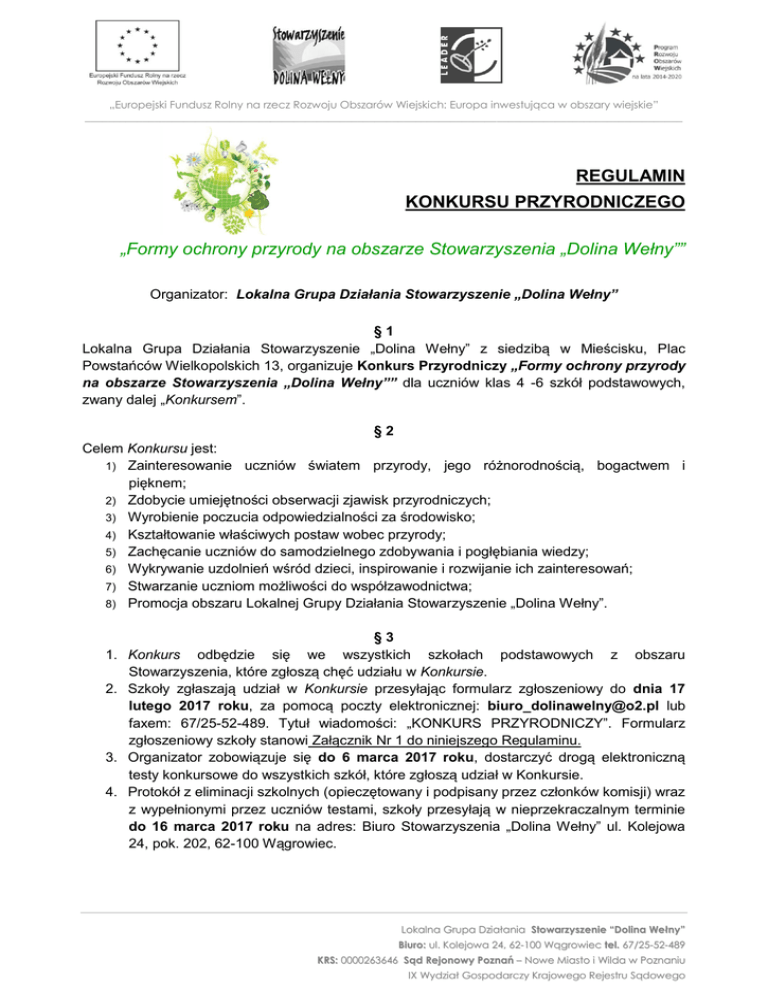 „Europejski Fundusz Rolny na rzecz Rozwoju Obszarów Wiejskich: Europa inwestująca w obszary wiejskie” _______________________________________________________________________________________________________ REGULAMIN KONKURSU PRZYRODNICZEGO „Formy ochrony przyrody na obszarze Stowarzyszenia „Dolina Wełny”” Organizator: Lokalna Grupa Działania Stowarzyszenie „Dolina Wełny” §1 Lokalna Grupa Działania Stowarzyszenie „Dolina Wełny” z siedzibą w Mieścisku, Plac Powstańców Wielkopolskich 13, organizuje Konkurs Przyrodniczy „Formy ochrony przyrody na obszarze Stowarzyszenia „Dolina Wełny”” dla uczniów klas 4 -6 szkół podstawowych, zwany dalej „Konkursem”. §2 Celem Konkursu jest: 1) Zainteresowanie uczniów światem przyrody, jego różnorodnością, bogactwem i pięknem; 2) Zdobycie umiejętności obserwacji zjawisk przyrodniczych; 3) Wyrobienie poczucia odpowiedzialności za środowisko; 4) Kształtowanie właściwych postaw wobec przyrody; 5) Zachęcanie uczniów do samodzielnego zdobywania i pogłębiania wiedzy; 6) Wykrywanie uzdolnień wśród dzieci, inspirowanie i rozwijanie ich zainteresowań; 7) Stwarzanie uczniom możliwości do współzawodnictwa; 8) Promocja obszaru Lokalnej Grupy Działania Stowarzyszenie „Dolina Wełny”. 1. 2. 3. 4. §3 Konkurs odbędzie się we wszystkich szkołach podstawowych z obszaru Stowarzyszenia, które zgłoszą chęć udziału w Konkursie. Szkoły zgłaszają udział w Konkursie przesyłając formularz zgłoszeniowy do dnia 17 lutego 2017 roku, za pomocą poczty elektronicznej: [email protected] lub faxem: 67/25-52-489. Tytuł wiadomości: „KONKURS PRZYRODNICZY”. Formularz zgłoszeniowy szkoły stanowi Załącznik Nr 1 do niniejszego Regulaminu. Organizator zobowiązuje się do 6 marca 2017 roku, dostarczyć drogą elektroniczną testy konkursowe do wszystkich szkół, które zgłoszą udział w Konkursie. Protokół z eliminacji szkolnych (opieczętowany i podpisany przez członków komisji) wraz z wypełnionymi przez uczniów testami, szkoły przesyłają w nieprzekraczalnym terminie do 16 marca 2017 roku na adres: Biuro Stowarzyszenia „Dolina Wełny” ul. Kolejowa 24, pok. 202, 62-100 Wągrowiec. Lokalna Grupa Działania Stowarzyszenie “Dolina Wełny” Biuro: ul. Kolejowa 24, 62-100 Wągrowiec tel. 67/25-52-489 KRS: 0000263646 Sąd Rejonowy Poznań – Nowe Miasto i Wilda w Poznaniu IX Wydział Gospodarczy Krajowego Rejestru Sądowego „Europejski Fundusz Rolny na rzecz Rozwoju Obszarów Wiejskich: Europa inwestująca w obszary wiejskie” _______________________________________________________________________________________________________ §4 1. Konkurs składa się z następujących etapów: 1) Etap I – polegający na rozwiązaniu testu wiedzy – eliminacje szkolne; 2) Etap II – polegający na rozwiązaniu testu wiedzy – finał Konkursu. 2. Przedmiotem I etapu Konkursu jest napisanie testu wiedzy, zorganizowanego w siedzibach szkół podstawowych, które zgłoszą swój udział do konkursu. 1) test będzie składać się z 30 pytań, które będą miały charakter zamknięty z 1 prawidłową odpowiedzią. Maksymalna liczba punktów do uzyskania w teście wynosi 30; 2) testy konkursowe w I etapie sprawdza Komisja Szkolna; 3) na podstawie wyników testu, z każdej szkoły, która uczestniczyła w I etapie Konkursu, do kolejnego etapu zostanie zakwalifikowanych 2 (lub więcej – w zależności od zainteresowania szkół) uczniów, którzy otrzymali największą liczbę punktów; 4) w przypadku, gdy 2 lub więcej uczniów, z danej szkoły otrzyma taką samą liczbę punktów, przewiduje się przeprowadzenie dodatkowej rudny konkursowej w formie ustnej na podstawie dodatkowych zestawów pytań, dostarczonych przez Organizatora razem z testami konkursowymi. 3. Przedmiotem II etapu Konkursu jest napisanie przez finalistów testu wiedzy, który odbędzie się w Kiszkowie. 1) test finałowy składać się będzie z 30 pytań testowych, z wielokrotną liczbą odpowiedzi oraz pytań otwartych. Maksymalna liczba do uzyskania punktów w teście wynosi 55. 2) ogłoszenie wyników finału nastąpi 6 kwietnia 2017 roku; 3) w przypadku uzyskania przez uczestników II etapu jednakowej liczby punktów, uniemożliwiającej wyłonienie laureatów Konkursu, przewiduje się przeprowadzenie dodatkowej rundy konkursowej w formie ustnej, bezpośrednio po ogłoszeniu wyników II etapu. 4) czas przeznaczony na wypełnienie testu w obu etapach ustalono na 40 minut. 5) wykaz tez konkursowych zawiera Załącznik Nr 2 do niniejszego Regulaminu. §5 1. Poszczególne etapy Konkursu będą odbywały się w następujących terminach: 1) Etap I eliminacje – dnia 9 marca 2017 roku, 2) Etap II finał Konkursu – dnia 6 kwietnia 2017 roku 2. Dodatkowa runda Konkursowa – dnia 6 kwietnia 2017 roku (w przypadku, o który mowa w § 4 ust. 3 pkt. 3). §6 1. W celu przeprowadzenia II etapu Konkursu powołuje się Komisję Konkursową zwaną dalej „Komisją”. 2. W skład Komisji wchodzą: 1) Przewodniczący – Janusz Woźniak Prezes Zarządu Stowarzyszenia „Dolina Wełny”, 2) Sekretarz – Magdalena Zadroga Pracownik Biura Stowarzyszenia „Dolina Wełny” 3) Członek – Bartosz Krąkowski Członek Rady Stowarzyszenia „Dolina Wełny” 4) Członek – Aurelia Jakubowska Członek Zarządu Stowarzyszenia „Dolina Wełny” Lokalna Grupa Działania Stowarzyszenie “Dolina Wełny” Biuro: ul. Kolejowa 24, 62-100 Wągrowiec tel. 67/25-52-489 KRS: 0000263646 Sąd Rejonowy Poznań – Nowe Miasto i Wilda w Poznaniu IX Wydział Gospodarczy Krajowego Rejestru Sądowego „Europejski Fundusz Rolny na rzecz Rozwoju Obszarów Wiejskich: Europa inwestująca w obszary wiejskie” _______________________________________________________________________________________________________ §7 Do zadań Komisji należy przeprowadzenie Konkursu oraz czuwanie nad jego prawidłowym przebiegiem. §8 1. Przewodniczący Komisji ki
