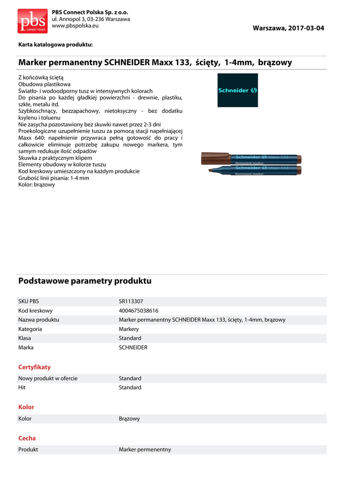 PBS Connect Polska Sp. z o.o. ul. Annopol 3, 03-236 Warszawa www.pbspolska.eu Warszawa, 2017-03-04 Karta katalogowa produktu: Marker permanentny SCHNEIDER Maxx 133, ścięty, 1-4mm, brązowy Z końcówką ściętą Obudowa plastikowa Światło- i wodoodporny tusz w intensywnych kolorach Do pisania po każdej gładkiej powierzchni - drewnie, plastiku, szkle, metalu itd. Szybkoschnący, bezzapachowy, nietoksyczny - bez dodatku ksylenu i toluenu Nie zasycha pozostawiony bez skuwki nawet przez 2-3 dni Proekologiczne uzupełnienie tuszu za pomocą stacji napełniającej Maxx 640: napełnienie przywraca pełną gotowość do pracy i całkowicie eliminuje potrzebę zakupu nowego markera, tym samym redukuje ilość odpadów Skuwka z praktycznym klipem Elementy obudowy w kolorze tuszu Kod kreskowy umieszczony na każdym produkcie Grubość linii pisania: 1-4 mm Kolor: brązowy Podstawowe parametry produktu SKU PBS SR113307 Kod kreskowy 4004675038616 Nazwa produktu Marker permanentny SCHNEIDER Maxx 133, ścięty, 1-4mm, brązowy Kategoria Markery Klasa Standard Marka SCHNEIDER Certyfikaty Nowy produkt w ofercie Standard Hit Standard Kolor Kolor Brązowy Cecha Produkt Marker permenentny PBS Connect Polska Sp. z o.o. ul. Annopol 3, 03-236 Warszawa www.pbspolska.eu Warszawa, 2017-03-04 Karta katalogowa produktu cd. Marker permanentny SCHNEIDER Maxx 133, ścięty, 1-4mm, brązowy Podstawowe parametry produktu Typ Ścięty Rodzaj Do 72h bez skuwki W ofercie od 2015-01 Wymiary Grubość linii (mm) 1-4 Końcówka (mm) 1-4 Wspólny słownik zamówień CPV 30192125-3 Pisaki Jednostki logistyczne Opakowanie 1 10 szt Opakowanie 2 400 szt Opakowanie 3 22400 szt