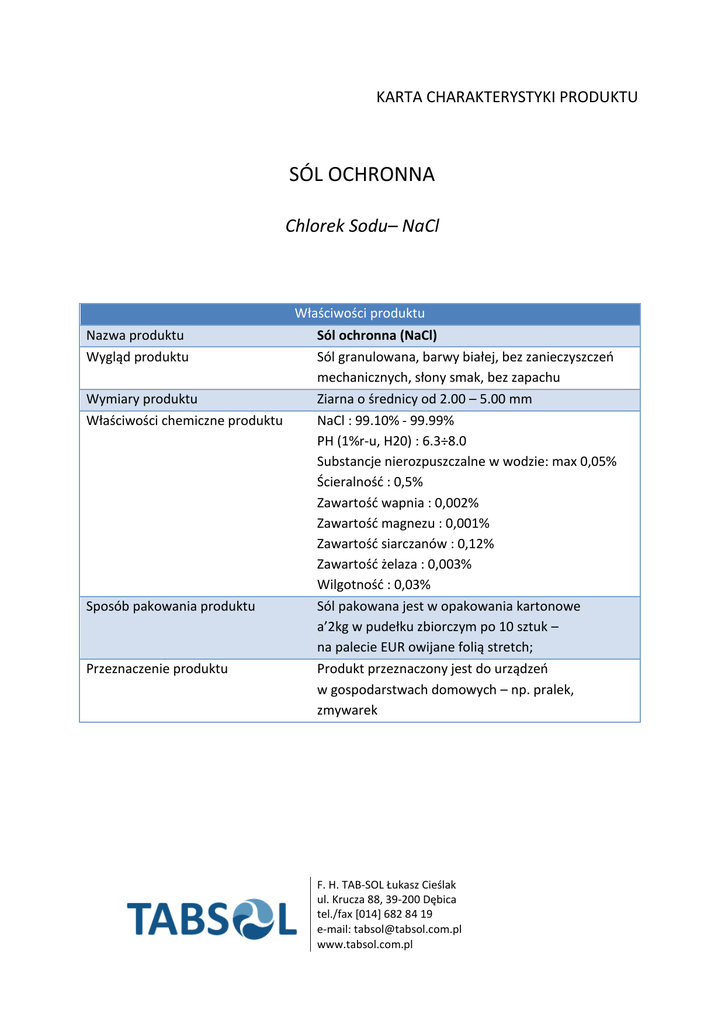 KARTA CHARAKTERYSTYKI PRODUKTU SÓL OCHRONNA Chlorek Sodu– NaCl Właściwości produktu Nazwa produktu Sól ochronna (NaCl) Wygląd produktu Sól granulowana, barwy białej, bez zanieczyszczeo mechanicznych, słony smak, bez zapachu Wymiary produktu Ziarna o średnicy od 2.00 – 5.00 mm Właściwości chemiczne produktu NaCl : 99.10% - 99.99% PH (1%r-u, H20) : 6.3÷8.0 Substancje nierozpuszczalne w wodzie: max 0,05% Ścieralnośd : 0,5% Zawartośd wapnia : 0,002% Zawartośd magnezu : 0,001% Zawartośd siarczanów : 0,12% Zawartośd żelaza : 0,003% Wilgotnośd : 0,03% Sposób pakowania produktu Sól pakowana jest w opakowania kartonowe a’2kg w pudełku zbiorczym po 10 sztuk – na palecie EUR owijane folią stretch; Przeznaczenie produktu Produkt przeznaczony jest do urządzeo w gospodarstwach domowych – np. pralek, zmywarek F. H. TAB-SOL Łukasz Cieślak ul. Krucza 88, 39-200 Dębica tel./fax [014] 682 84 19 e-mail: [email protected] www.tabsol.com.pl