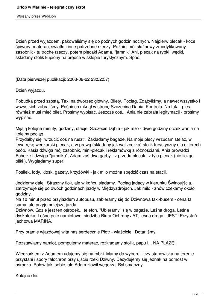 Urlop w Marinie - telegraficzny skrót Wpisany przez WebLion Dzień przed wyjazdem, pakowaliśmy się do późnych godzin nocnych. Najpierw plecak - koce, śpiwory, materac, światło i inne potrzebne rzeczy. Później mój służbowy zmodyfikowany zasobnik - tu trochę rzeczy, potem plecaki Adama, "jamnik" Ani, plecak na rybki, wędki, składany stolik kupiony na prędce w sklepie turystycznym. Spać. (Data pierwszej publikacji: 2003-08-22 23:52:57) Dzień wyjazdu. Pobudka przed szóstą. Taxi na dworzec główny. Bilety. Pociąg. Zdążyliśmy, a nawet wszystko i wszystkich zabraliśmy. Pośpiech mknął w stronę Szczecina Dąbia. Kontrola. No tak... pies również musi mieć bilet. Prosimy wypisać. Jeszcze coś... Ania nie zabrała legitymacji - prosimy wypisać. Mijają kolejne minuty, godziny, stacje. Szczecin Dąbie - jak miło - dwie godziny oczekiwania na kolejny pociąg. Przydałby się "wrzucić coś na ruszt". Zakładamy bagaże. Na moje plecy wrzucam stelaż, w lewą rękę wędkarski plecak, a w prawą (składany jak walizeczka) stolik turystyczny dla czterech osób. Kasia dźwiga mój zasobnik, mini-plecak i reklamówkę z różnościami. Ania prowadzi Pchełkę i dźwiga "jamnika", Adam zaś dwa garby - z przodu plecak i z tyłu plecak (nie licząc piłki ). Wyglądamy super! Posiłek, lody, kiosk, gazety, krzyżówki - jak miło można spędzić czas na stacji. Jedziemy dalej. Straszny tłok, ale w końcu siadamy. Pociąg jadący w kierunku Świnoujścia, zatrzymuje się po dwóch godzinach jazdy w Międzyzdrojach. Jak miło - znów czekamy około godziny. Na 10 minut przed przyjazdem autobusu, zabieramy się do Dziwnowa taxi-busem - cena ta sama, ale przyjemniejsza jazda. Dziwnów. Gdzie jest ten ośrodek... telefon. "Ubieramy" się w bagaże. Leśna droga, Leśna dyskoteka, Leśne pole namiotowe, siedziba Biura Ochrony JAT, leśna droga i JEST! Przystań jachtowa MARINA. Przy bramie wjazdowej wita nas serdecznie Piotr - właściciel. Dotarliśmy. Rozstawiamy namiot, pompujemy materac, rozkładamy stolik, papu i... NA PLAŻĘ! Wieczorkiem z Adamem udajemy się na rybki. Mamy do wyboru - trzy stanowiska na terenie przystani i spory falochron przy ujściu rzeki Dziwny. Decydujemy się jednak na pomost w ośrodku. Połów taki sobie, ale Adam złowił węgorza. Był smaczny. Kolejne dni. 1/3 Urlop w Marinie - telegraficzny skrót Wpisany przez WebLion Poznaliśmy sympatycznych ludzi. Ze Szczecina Iwonę i Roberta z Przemkiem i Olą, z Bydgoszczy Krysię i Grzegorza z dziećmi, Włodka z córkami, z Katowic (obecnie mieszkających w Niemczech) Ilonę i Andrzeja z Dorotą i Łukaszem, Darka i jego żonę oraz wielu innych ludzi. Było przesympatycznie. Wieczorne imprezy w "Leśnej" leczone z rana w punkcie reanimacyjnym u pana Stanisława. Plaża, rybki i spacery po Dziwnowie, aby odpocząć od palącego Słońca. Totalny luz bez przemyśleń na temat pracy i domu... szkoda, że tak krótko. W dniu moich urodzin zjechała się moja rodzina ze Świnoujścia, a nieco wcześniej zawitał w Dziwnowie mój serdeczny kolega Arek. Wszyscy bawili się świetnie, a impreza z przystani przeniosła się jak zwykle do "Leśnej". Na koniec miła niespodzianka. Opcja powrotu do domu, której w najbardziej optymistycznych myślach nie braliśmy pod uwagę. Do domu przyjechaliśmy... samochodem. Opel prowadzony przez Grzegorza dowiózł nas pod same drzwi - wielkie dzięki! Komitecie! Za pośrednictwem tego miejsca, chcielibyśmy jeszcze raz podziękować - Tobie Piotrze i całemu Komitetowi - za przeżycie wspaniałych chwil w Marinie. Bawiliśmy się i wypoczywaliśmy świetnie. Opalenizna się trzyma, dobry nastrój dopisuje, tylko żal, że urlopy są takie krótkie. Na szczęście pozostały wspomnienia i zdjęcia. 2/3 Urlop w Marinie - telegraficzny skrót Wpisany przez WebLion 3/3