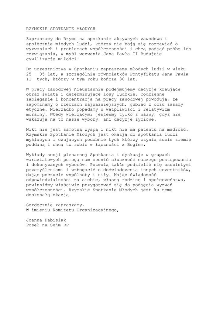 RZYMSKIE SPOTKANIE MŁODYCH Zapraszamy do Rzymu na spotkanie aktywnych zawodowo i społecznie młodych ludzi, którzy nie boją się rozmawiać o wyzwaniach i problemach współczesności i chcą podjąć próbę ich rozwiązania, w myśl wezwania Jana Pawła II Budujcie cywilizację miłości! Do uczestnictwa w Spotkaniu zapraszamy młodych ludzi w wieku 25 - 35 lat, a szczególnie równolatków Pontyfikatu Jana Pawła II tych, którzy w tym roku kończą 30 lat. W pracy zawodowej nieustannie podejmujemy decyzje kreujące obraz świata i determinujące losy ludzkie. Codzienne zabieganie i koncentracja na pracy zawodowej powodują, Ŝe zapominamy o rzeczach najwaŜniejszych, gubiąc z oczu zasady etyczne. Nierzadko popadamy w wątpliwości i relatywizm moralny. Wtedy wierzącymi jesteśmy tylko z nazwy, gdyŜ nie wskazują na to nasze wybory, ani decyzje Ŝyciowe. Nikt nie jest samotną wyspą i nikt nie ma patentu na mądrość. Rzymskie Spotkanie Młodych jest okazją do spotkania ludzi myślących i czujących podobnie tych którzy czynią sobie ziemię poddaną i chcą to robić w łączności z Bogiem. Wykłady sesji plenarnej Spotkania i dyskusje w grupach warsztatowych pomogą nam ocenić słuszność naszego postępowania i dokonywanych wyborów. Pozwolą takŜe podzielić się osobistymi przemyśleniami i wzbogacić o doświadczenia innych uczestników, dając poczucie wspólnoty i siły. Mając świadomość odpowiedzialności za siebie, własną rodzinę i społeczeństwo, powinniśmy właściwie przygotować się do podjęcia wyzwań współczesności. Rzymskie Spotkanie Młodych jest ku temu doskonałą okazją. Serdecznie zapraszamy, W imieniu Komitetu Organizacyjnego, Joanna Fabisiak Poseł na Sejm RP