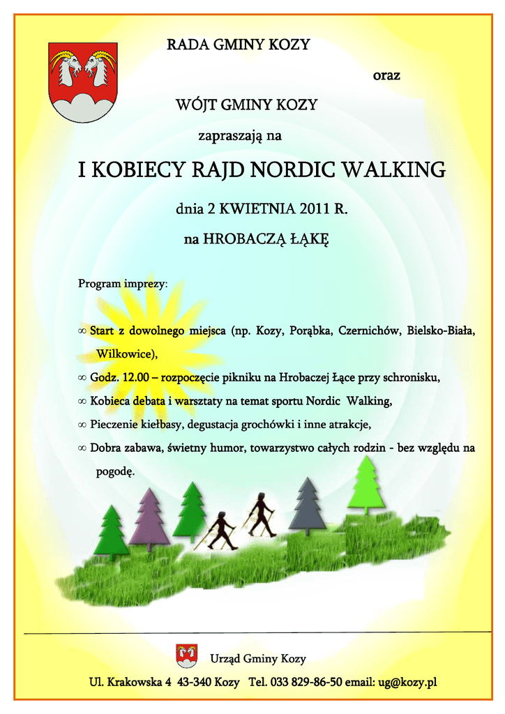 RADA GMINY KOZY oraz WÓJT GMINY KOZY zapraszają na I KOBIECY RAJD NORDIC WALKING dnia 2 KWIETNIA 2011 R. na HROBACZĄ ŁĄKĘ Program imprezy: imprezy • Start z dowolnego miejsca (np. Kozy, Porąbka, Czernichów, BielskoBielsko-Biała, Wilkowice), Wilkowice), • Godz. 12.00 – rozpoczęcie pikniku na Hrobaczej Łące przy schroni schronisku, • Kobieca debata i warsztaty na temat spor sportu Nordic Walking, Walking, • Pieczenie kiełbasy, degustacja grochówki i inne atrakcje, atrakcje, • Dobra zabawa, świetny humor, towarzystwo całych rodzin - bez względu na pogodę. Urząd Gminy Kozy Ul. Krakowska 4 4343-340 Kozy Tel. 033 829829-8686-50 email: [email protected]
