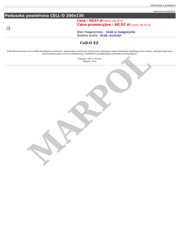 Informacje o produkcie Utworzono 04-03-2017 Poduszka powietrzna CELL-O 200x130 Cena : 60,57 zł (netto: 49,24 zł) Cena promocyjna : 60,57 zł (netto: 49,24 zł) Stan magazynowy : brak w magazynie Średnia ocena : brak recenzji Cell-O EZ Poduszki powietrzne są to torebki wypełnione powietrzem, zapewniające skuteczną ochronę przy minimalnej masie. Doskonale wypełniają puste miejsca, zabezpieczają towar przed przesuwaniem się oraz uszkodzeniem. Dodatkowo są doskonałym materiałem amortyzującym. M AR PO L Wymiary :200 x 130 mm Długośc: 50 m