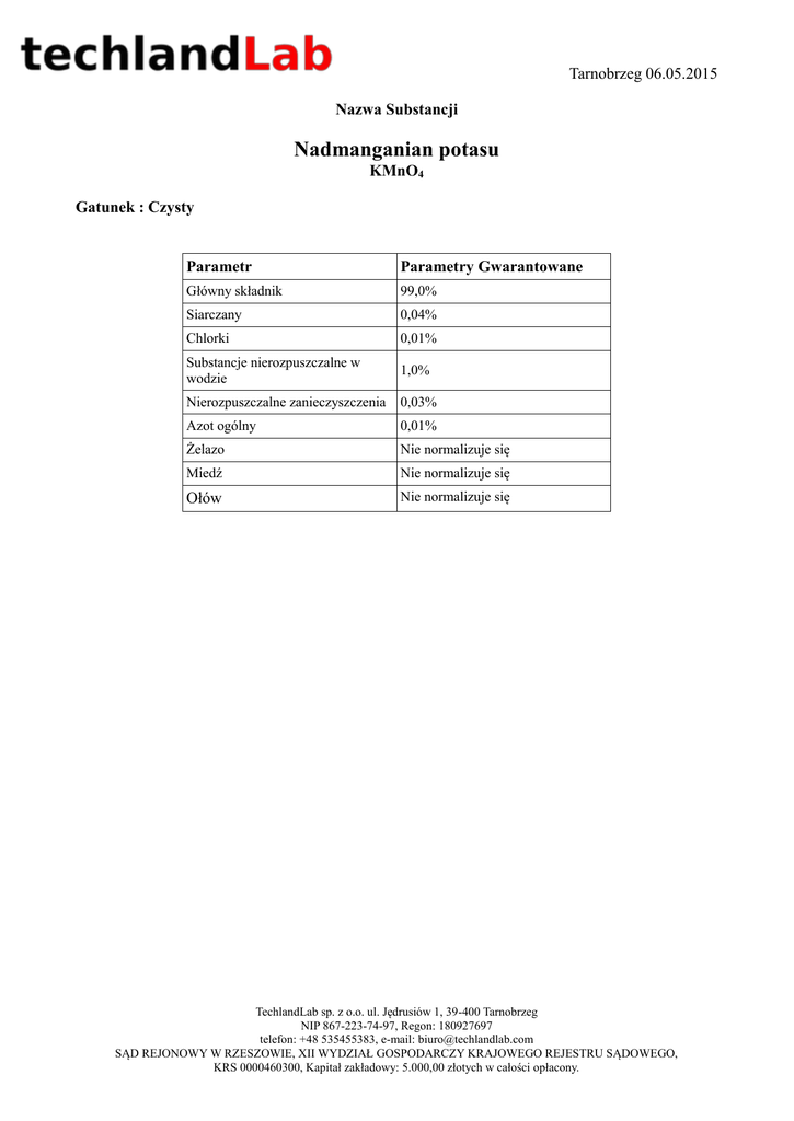 Tarnobrzeg 06.05.2015 Nazwa Substancji Nadmanganian potasu KMnO4 Gatunek : Czysty Parametr Parametry Gwarantowane Główny składnik 99,0% Siarczany 0,04% Chlorki 0,01% Substancje nierozpuszczalne w wodzie 1,0% Nierozpuszczalne zanieczyszczenia 0,03% Azot ogólny 0,01% Żelazo Nie normalizuje się Miedź Nie normalizuje się Ołów Nie normalizuje się TechlandLab sp. z o.o. ul. Jędrusiów 1, 39-400 Tarnobrzeg NIP 867-223-74-97, Regon: 180927697 telefon: +48 535455383, e-mail: [email protected] SĄD REJONOWY W RZESZOWIE, XII WYDZIAŁ GOSPODARCZY KRAJOWEGO REJESTRU SĄDOWEGO, KRS 0000460300, Kapitał zakładowy: 5.000,00 złotych w całości opłacony.