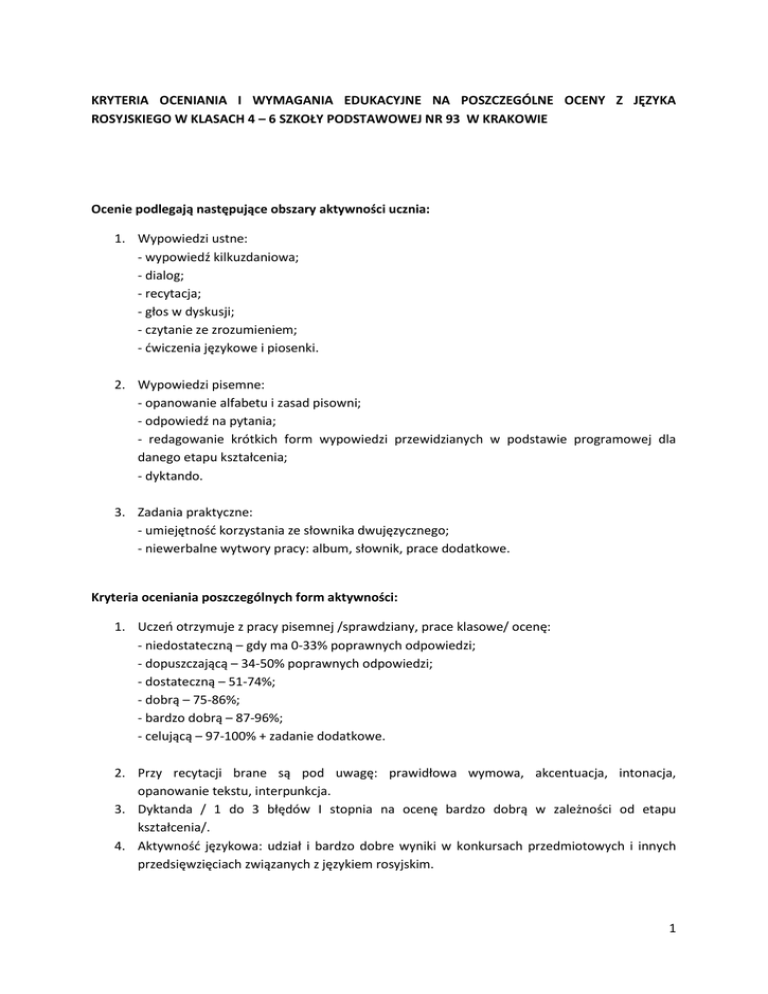 KRYTERIA OCENIANIA I WYMAGANIA EDUKACYJNE NA POSZCZEGÓLNE OCENY Z JĘZYKA ROSYJSKIEGO W KLASACH 4 – 6 SZKOŁY PODSTAWOWEJ NR 93 W KRAKOWIE Ocenie podlegają następujące obszary aktywności ucznia: 1. Wypowiedzi ustne: - wypowiedź kilkuzdaniowa; - dialog; - recytacja; - głos w dyskusji; - czytanie ze zrozumieniem; - dwiczenia językowe i piosenki. 2. Wypowiedzi pisemne: - opanowanie alfabetu i zasad pisowni; - odpowiedź na pytania; - redagowanie krótkich form wypowiedzi przewidzianych w podstawie programowej dla danego etapu kształcenia; - dyktando. 3. Zadania praktyczne: - umiejętnośd korzystania ze słownika dwujęzycznego; - niewerbalne wytwory pracy: album, słownik, prace dodatkowe. Kryteria oceniania poszczególnych form aktywności: 1. Uczeo otrzymuje z pracy pisemnej /sprawdziany, prace klasowe/ ocenę: - niedostateczną – gdy ma 0-33% poprawnych odpowiedzi; - dopuszczającą – 34-50% poprawnych odpowiedzi; - dostateczną – 51-74%; - dobrą – 75-86%; - bardzo dobrą – 87-96%; - celującą – 97-100% + zadanie dodatkowe. 2. Przy recytacji brane są pod uwagę: prawidłowa wymowa, akcentuacja, intonacja, opanowanie tekstu, interpunkcja. 3. Dyktanda / 1 do 3 błędów I stopnia na ocenę bardzo dobrą w zależności od etapu kształcenia/. 4. Aktywnośd językowa: udział i bardzo dobre wyniki w konkursach przedmiotowych i innych przedsięwzięciach związanych z językiem rosyjskim. 1 Wymagania na poszczególne oceny: Ocenę celującą otrzymuje uczeo, który: - spełnia wymagania na ocenę bardzo dobrą; - uzyskuje oceny celujące z prac klasowych, sprawdzianów, i prac domowych; - systematycznie wykonuje prace nadobowiązkowe i otrzymuje z nich oceny celujące; - polecenia nauczyciela wypełnia zawsze systematycznie i sumiennie, prezentując wzorowy stosunek do przedmiotu; - uczestniczy i zdobywa nagrody w konkursach przedmiotowych w szkole i poza nią; - wykazuje się umiejętnościami pozaprogramowymi w zakresie podanych niżej zagadnieo: sprawnośd słuchanie mówienie pisanie czytanie umiejętności - bezbłędnie rozumie wysłuchany tekst; - bezbłędnie rozumie i wykonuje oraz potrafi samodzielnie zastosowad w sytuacjach szkolnych wszystkie polecenia, wydane przez nauczyciela po rosyjsku; - prawidłowo wymawia wszystkie dźwięki , można go doskonale zrozumied; - bezbłędnie przekazuje wiadomości na znany mu temat przy użyciu bogatego słownictwa, wzorców intonacyjnych i bardzo dobrej wymowy; - potrafi bezbłędnie przekazad informacje zawarte w wysłuchanym tekście; - doskonale potrafi się odnaleźd w typowej sytuacji komunikacyjnej: odpowiedzied na pytanie, udzielid informacji, a także uzyskad informacje; - aktywnie uczestniczy w dyskusjach na lekcji; - potrafi wypowiadad się na tematy nie objęte programem nauczania; - bezbłędnie potrafi zredagowad krótką wypowiedź pisemną oraz dialog; - zna i bezbłędnie wykorzystuje w praktyce zasady pisowni rosyjskiej; - potrafi bezbłędnie czytad poznane słowa i typowe zdania, a także wymawiad je z zachowaniem poprawnej akcentuacji i intonacji; - rozumie ogólny sens tekstu oraz szybko i bezbłędnie potrafi wybrad z tekstu określone informacje; - potrafi czytad bez przygotowania; Ocenę bardzo dobrą otrzymuje uczeo, który: sprawnośd słuchanie mówienie umiejętności - rozumie ogólny sens wysłuchanego tekstu lub rozmowy i bezbłędnie potrafi wybrad z tekstu lub dialogu określone informacje; - bezbłędnie rozumie i wykonuje wszystkie polecenia, wydawane przez nauczyciela po rosyjsku; - prawidłowo wymawia wszystkie dźwięki, można go doskonale zrozumied; - prawie bezbłędnie przekazuje wiadomości na znany mu temat przy użyciu bogatego słownictwa, wzorców intonacyjnych i bardzo dobrej wymowy; - mówi poprawnie, można go bez trudności zrozumied; - potrafi się odnaleźd w typowej sytuacji komunikacyjnej: odpowiedzied na pytanie, udzielid informacji, a także uzyskad informacje; 2 pisanie czytanie - zabiera glos w dyskusjach na lekcji; - prawie bezbłędnie potrafi redagowad proste zdania, dialogi i krótkie teksty; - zna i wykorzystuje w praktyce zasady pisowni rosyjskiej; - potrafi prawie bezbłędnie czytad poznane słowa i typowe zdania, a także wymawiad je z zachowaniem prawie zawsze poprawnej akcentuacji i intonacji; - radzi sobie z czytaniem tekstów nieznanych; Ocenę dobrą otrzymuje uczeo, który: sprawnośd słuchanie mówienie pisanie czytanie umiejętności - prawie bezbłędnie rozumie i wykonuje wszystkie polecenia, wydane przez nauczyciela po rosyjsku; - dośd dobrze rozumie ogólny sens wysłuchanego tekstu lub rozmowy i prawie zawsze potrafi wybrad z tekstu lub dialogu określone informacje; - prawie zawsze prawidłowo wymawia dźwięki; - potrafi skutecznie przekazad wiadomośd na znany mu temat przy użyciu dośd bogatego słownictwa, wzorców intonacyjnych i dośd dobrej wymowy; - potrafi się odnaleźd w typowej sytuacji komunikacyjnej: odpowiedzied na pytanie, udzielid informacji, a także uzyskad informacje; - posługuje się w miarę poprawnym językiem, zazwyczaj można go zrozumied; - dośd poprawnie potrafi napisad proste zdania, dialogi i krótkie teksty; - zna zasady pisowni rosyjskiej, ale nie zawsze wykorzystuje je w praktyce; - potrafi dośd dobrze czytad poznane słowa i typowe zdania, a także wymawiad je z zachowaniem dośd poprawnej akcentuacji i intonacji; - czasami radzi sobie z czytaniem nieznanych tekstów; Ocenę dostateczną otrzymuje uczeo, który: sprawnośd słuchanie mówienie pisanie czytanie umiejętności - niezbyt dobrze rozumie i wykonuje polecenia, wydawane przez nauczyciela po rosyjsku; - niezbyt dobrze rozumie ogólny sens wysłuchanego tekstu lub rozmowy i niezbyt trafnie potrafi wybrad z tekstu lub dialogu określone informacje; - można go zazwyczaj zrozumied, ale z pewną trudnością; - potrafi dośd skutecznie przekazad informacje na znany mu temat, jednak słownictwo ma dośd ograniczone, a wymowa nie jest wystarcza