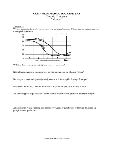 XXXIV OLIMPIADA GEOGRAFICZNA Zawody III stopnia Podejście 3 Zadanie 13. Wykres przedstawia model typowego cyklu demograficznego. Odpowiedz na pytania umieszczone pod wykresem. Y X 1 2 3 4 Z 5 W której fazie występuje największy przyrost naturalny? Którą literą oznaczono etap rozwoju, na którym znajduje się obecnie Polska? Na którym kontynencie jest najwięcej państw w 1. fazie cyklu demograficznego? Którą fazę (które fazy) określa się terminem „pierwsze przejście demograficzne”? Jak zmieniają się stopa urodzeń i stopa zgonów w pierwszym przejściu demograficznym? Jaka struktura wieku ludności jest charakterystyczna w państwach, w których dokonało się przejście demograficzne? Prawa autorskie zastrzeŜone 3/2 Zadanie 14. Na wykresie przedstawiono zmiany udziału liczby ludności czterech regionów świata w ogólnej liczbie ludności świata w latach 1950-2005. Uzupełnij legendę wykresu wybierając właściwe oznaczenia spośród podanych poniŜej: Afryka, Ameryka Północna, Ameryka Środkowa i Południowa, Australia, Azja, Europa % 25 1 – …………………..….. 20 2 – …………………..….. 15 1 10 2 3 5 4 0 1950 1960 1970 1980 1990 2000 3 – …………………..….. 4 – …………………..….. 2010 Zadanie 15. A. Spośród niŜej wymienionych języków podkreśl te, które stanowią języki oficjalne Organizacji Narodów Zjednoczonych. angielski arabski chiński francuski hiszpański japoński niemiecki rosyjski B. WaŜny układ dotyczący podziału nowo odkrywanych ziem w okresie wielkich odkryć geograficznych zawarto w Tordesillas. Według tego układu, linia graniczna między nowymi ziemiami odkrywanymi przez sygnatariuszy układu miała biec w odległości 370 mil (ok. 2000 km) na zachód od Wysp Zielonego Przylądka (w przybliŜeniu dł. geogr. 4749oW). W którym roku zawarto ten układ? Odpowiedź: ……………………… Które państwa zawarły ten układ? Odpowiedź: ……………………………..……………… Jakie konsekwencje układu widoczne są w dzisiejszym zróŜnicowaniu języków urzędowych w częściach świata odkrytych po zawarciu tej umowy? C. W niektórych państwach pozaeuropejskich językiem urzędowym jest jeden z języków europejskich. Który europejski język jest językiem urzędowym w wymienionych państwach? Uzupełnij zestawienie. Botswana, Ghana, Nowa Zelandia – język ………………………… Liberia, Nigeria, Zambia – język ………………………… Mali, Niger, Senegal – język ………………………… Prawa autorskie zastrzeŜone 3/3 Zadanie 16. A. W diagramach przedstawiono udział wyznawców róŜnych religii w Afryce, Ameryce Łacińskiej, Ameryce Północnej, Azji, Europie oraz na świecie. Podpisz kaŜdy z diagramów nazwą odpowiedniego obszaru. Chrześcijanie Muzułmanie ……………….. ……………….. ……………….. Hinduiści Buddyści Wyznawcy innych religii, niewierzący ……………….. ……………….. ……………….. B. Której z religii dotyczy kaŜda z poniŜszych informacji? (uwzględniono tylko religie, których wyznawców wymieniono powyŜej). Uzupełnij zestawienie. Informacja Religia Cztery Szlachetne Prawdy tej religii jej twórca objawił w Sarnath pod Benares (Waranasi). Do religii tej nie ma Ŝadnego formalnego przyjęcia, jej wyznawcą jest ten, kto Ŝyje według jej zasad. Twórca tej religii Ŝył na przełomie VI i VII w. n.e. Do zasad tej religii naleŜy ikonoklazm, czyli zakaz przedstawiania ludzi i zwierząt w sztuce oraz upodabniania Boga do ludzi. Celem Ŝycia, według tej religii, jest wyzwolenie z cierpienia (kręgu wcieleń) i osiągnięcie całkowitego spokoju w nirwanie. Językiem kultowym tej religii jest sanskryt, a jej świętymi księgami są Wedy. C. Podaj nazwy państw, w których Ŝyje najwięcej wyznawców wymienionych religii. konfucjanizm …………………….. taoizm …………………….. szintoizm …………………….. Prawa autorskie zastrzeŜone 3/4 Zadanie 17. A. Podaj polską nazwę miernika określanego jako HDI: B. Wstaw znak √ w kwadratach obok tych elementów, które są brane pod uwagę w obliczaniu HDI: dzienna wartość kaloryczna diety liczba samochodów na 1000 mieszkańców odsetek dorosłej ludności umiejącej czytać PKB na 1 mieszkańca liczony wg parytetu siły nabywczej waluty produkcja energii elektrycznej na 1 mieszkańca stały dostęp do Internetu na 1000 mieszkańców średnia oczekiwana długość Ŝycia C. Zakreśl kółeczkami litery przy prawidłowych odpowiedziach: W krajach ocenianych według HDI jako najwyŜej rozwinięte wartość tego współczynnika wynosi: a) 0,10-0,20 b) 0,90-1,00 c) powyŜej 10 d) powyŜej 100 Według danych opublikowanych przez United Nations Development Programme pod koniec 2007 r. (dotyczących stanu z 2005 r.) państwami o najwyŜszej wartości współczynnika HDI były: a) Holandia i Luksemburg b) Islandia i Norwegia c) Kanada i Stany Zjednoczone d) Niemcy i Wielka Brytania Prawa autorskie zastrzeŜone
