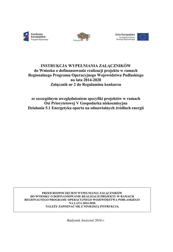 INSTRUKCJA WYPEŁNIANIA ZAŁĄCZNIKÓW do Wniosku o dofinansowanie realizacji projektu w ramach Regionalnego Programu Operacyjnego Województwa Podlaskiego na lata 2014-2020 Załącznik nr 2 do Regulaminu konkursu ze szczególnym uwzględnieniem specyfiki projektów w ramach Osi Priorytetowej V Gospodarka niskoemisyjna Działania 5.1 Energetyka oparta na odnawialnych źródłach energii PRZED ROZPOCZĘCIEM WYPEŁNIANIA ZAŁĄCZNIKÓW DO WNIOSKU O DOFINANSOWANIE REALIZACJI PROJEKTU W RAMACH REGIONALNEGO PROGRAMU OPERACYJNEGO WOJEWÓDZTWA PODLASKIEGO NA LATA 2014-2020 NALEŻY ZAPOZNAĆ SIĘ Z NINIEJSZĄ INSTRUKCJĄ Białystok, kwiecień 2016 r. Załączniki do wniosku o dofinansowanie realizacji projektu ze środków Europejskiego Funduszu Rozwoju Regionalnego (EFRR) w ramach Regionalnego Programu Operacyjnego na lata 20142020 (RPOWP 2014-2020) służą do uzupełnienia oraz uwiarygodnienia danych opisanych we wniosku o dofinansowanie realizacji projektu. 2 Spis załączników: 1. Studium Wykonalności (dotyczy sektora publicznego oraz operatorów systemu dystrybucyjnego (OSD))..............................................................................................................4 2. Biznes Plan (dotyczy przedsiębiorstw z wyłączeniem sektora publicznego raz operatorów systemu dystrybucyjnego (OSD)) ................................................................................................ 7 3. Dokumenty związane z przeprowadzeniem postępowania oceny oddziaływania na środowisko ................................................................................................................................ 77 4. Kopia pozwolenia na budowę lub zgłoszenie budowy/dokumenty dotyczące zagospodarowania przestrzennego ........................................................................................... 99 5. Wyciąg z dokumentacji technicznej .......................................................................................... 10 6. Kosztorys inwestorski................................................................................................................10 7. Potwierdzenie prawa do dysponowania gruntem lub obiektami - oświadczenie o prawie dysponowania nieruchomością na cele realizacji projektu, umowa najmu, dzierżawy itp. .....11 8. Oświadczenie Beneficjenta o braku możliwości odzyskania podatku VAT .............................. 12 9. Pozostałe załączniki obowiązkowe. .......................................................................................... 12 3 Załączniki stanowią integralną część wniosku o dofinansowanie realizacji projektu ze środków EFRR w ramach RPOWP 2014-2020. Sposób złożenia oraz wymagany zakres określa Regulamin oceny i wyboru projektów w ramach Regionalnego Programu Operacyjnego Województwa Podlaskiego na lata 2014-2020, a niniejsza Instrukcja, stanowi jego załącznik nr 2. Lista załączników obowiązkowych może zostać rozszerzona w zależności od specyfiki działania, występującej pomocy publicznej, dodatkowych uregulowań prawnych i wytycznych. Instytucja Organizująca Konkurs (IOK) zastrzega sobie prawo do wezwania Wnioskodawcy do dostarczenia innych dokumentów niewymienionych w niniejszej Instrukcji pod warunkiem, że ich uzupełnienie nie będzie prowadziło do istotnej modyfikacji wniosku (art. 43 ust. 2 Ustawy z dnia 11 lipca 2014 r. o zasadach realizacji programów w zakresie polityki spójności finansowanych w perspektywie finansowej 2014-2020) oraz będą niezbędne do oceny spełnienia kryteriów wyboru projektów (art. 37 ust. 5 Ustawy z dnia 11 lipca 2014 r. o zasadach realizacji programów w zakresie polityki spójności finansowych w perspektywie finansowej 2014-2020). Dołączone decyzje administracyjne powinny być ważne na dzień składania wniosku o dofinansowanie oraz faktycznego rozpoczęcia realizacji projektu (w szczególności dotyczy to projektów obejmujących roboty budowlane), a także powinny być opatrzone adnotacją organu wydającego o ich ostateczności/prawomocności. 1. Studium Wykonalności (dotyczy sektora publicznego oraz operatorów systemu dystrybucyjnego (OSD)) Zgodnie z definicją dokumentu Analiza kosztów i korzyści projektów inwestycyjnych: Przewodnik (Fundusz Strukturalny, Fundusz Spójności i ISPA) (Komisja Europejska, 1997 r.) studium wykonalności jest „badaniem proponowanego projektu, które ma ustalić, czy proponowana inwestycja jest na tyle atrakcyjna, aby uzasadniać dalsze szczegółowe prace przygotowawcze”. Sporządzane jest przez Wnioskodawców innych niż przedsiębiorstwa. Stanowi podstawowy załącznik do wniosku o dofinansowanie. Podstawą przygotowania Studium Wykonalności powinny być w szczególności: Wytyczne Ministra Infrastruktury i Rozwoju w zakresie zagadnień związanych z przygotowaniem projektów inwestycyjnych, w tym projektów generujących dochód i projektów hybrydowych na lata 2014-2020 z dnia 18 marca 2015 r. (zwane dalej Wytycznymi przygotowania projektów inwestycyjnych); Rozporządzenie delegowane Komisji (UE) nr 480/2014 z dnia 3 marca 2014 r. uzupełniające rozporządzenie Parlamentu Europejskiego i Rady (UE) nr 1303/2013 ustanawiające wspólne przepisy dotyczące Europejskiego Funduszu Rozwoju Regionalnego, Europejskiego Funduszu Społecznego, Funduszu Spójności, Europejskiego Funduszu Regionalnego na rzecz Rozwoju Obszarów Wiejskich oraz Europejskiego Funduszu Morskiego i Rybackiego oraz ustanawiające przepisy ogólne dotyczące Europejskiego Funduszu Rozwoju Regionalnego, Europejskiego Funduszu Społecznego, Funduszu Spójności i Europejskiego Funduszu Morskiego i Rybackiego (zwane dalej Rozporządzeniem nr 480/2014); Rozporządzenie Parlamentu Europejskiego i Rady (UE) nr 1303/2013 z dnia 17 grudnia 2013 r. stanowiące wspólne przepisy dotyczące Europejskiego Funduszu Rozwoju Regionalnego, Europejskiego Funduszu Społecznego, Funduszu Spójności, Europejskiego Funduszu Rolnego na rzecz 