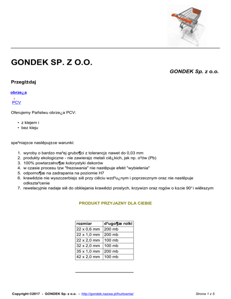 GONDEK SP. Z O.O. GONDEK Sp. z o.o. Przegl±daj obrze¿a PCV Oferujemy Pañstwu obrze¿a PCV: • z klejem i • bez kleju spe³niaj±ce nastêpuj±ce warunki: 1. 2. 3. 4. 5. 6. wyroby o bardzo ma³ej grubo¶ci z tolerancj± nawet do 0,03 mm produkty ekologiczne - nie zawieraj± metali ciê¿kich, jak np. o³ów (Pb) 100% powtarzalno¶æ kolorystyki dekorów w czasie procesu tzw "frezowania" nie nastêpuje efekt "wybielenia" odporno¶æ na zadrapania na poziomie H7 krawêdzie nie wyszczerbiaj± siê przy ciêciu wzd³u¿nym i poprzecznym oraz nie nastêpuje odkszta³cenie 7. rewelacyjnie nadaje siê do obklejania krawêdzi prostych, krzywizn oraz rogów o k±cie 90o i wiêkszym PRODUKT PRZYJAZNY DLA CIEBIE rozmiar 22 x 0,6 mm 22 x 1,0 mm 22 x 2,0 mm 32 x 2,0 mm 35 x 1,0 mm 42 x 2,0 mm d³ugo¶æ rolki 200 mb 200 mb 100 mb 100 mb 200 mb 100 mb Copyright ©2017 - GONDEK Sp. z o.o. - http://gondek.nazwa.pl/hurtownia/ Strona 1 z 5 WZÓR DEKORU NAZWA DEKORU olcha naturalna grusza dzika grusza jasna grusza ciemna grusza polna grusza kalvados grusza kalvados jasny buk buk naturalny buk jasny buk ciemny buk Bavaria d±b jasny d±b rustikal jasny d±b rustikal d±b mleczny d±b sedan jab³oñ Locarno jab³oñ Locarno jasna wi¶nia wi¶nia Oxford wi¶nia Amati mahoñ mahoñ jasny orzech orzech Bologna orzech ciemny klon klon jasny klon jasny Vancouver sosna miodowa sosna sosna Vasa aluminium wenge jasne wenge Magia limba limba czekoladowa zebrano zebrano jasne zebrano Negro Copyright ©2017 - GONDEK Sp. z o.o. - http://gondek.nazwa.pl/hurtownia/ Strona 2 z 5 macassar bia³y g³adki bia³y g³adki po³ysk bia³y baranek bia³y struktura popiel popiel jasny popiel ciemny popiel po³ysk tytan be¿ pomarañczowy pomarañczowy po³ysk czerwony czerwony po³ysk zielony zielony po³ysk niebieski niebieski po³ysk czarny struktura czarny baranek Umo¿liwiamy sprzeda¿ obrze¿y PCV zarówno w ca³o¶ci (w rolkach lub pe³ne opakowania) jak i na metry bie¿±ce. Ceny sprzeda¿y sa podane za metr bie¿±cy. obrze¿e PCV 22 x 0,6 mm bez kleju - KOLOR G£ADKI PLN 0,43 (w tym 23 % VAT) podana cena dotyczy 1 mb [Szczegó³y produktu...] obrze¿e PCV 22 x 0,6 mm bez kleju - STRUKTURA DREWNA PLN 0,46 (w tym 23 % VAT) podana cena dotycyz 1 mb [Szczegó³y produktu...] Copyright ©2017 - GONDEK Sp. z o.o. - http://gondek.nazwa.pl/hurtownia/ Strona 3 z 5 obrze¿e PCV 22 x 0,6 mm bez kleju ALUMINIUM PLN 0,48 (w tym 23 % VAT) podana cena dotyczy 1 mb [Szczegó³y produktu...] obrze¿e PCV 22 x 0,6 mm z klejem - STRUKTURA DREWNA PLN 0,60 (w tym 23 % VAT) podana cena dotyczy 1 mb [Szczegó³y produktu...] obrze¿e PCV 22 x 1,0 mm bez kleju - STRUKTURA DREWNA PLN 0,76 (w tym 23 % VAT) podana cena dotyczy 1 mb [Szczegó³y produktu...] obrze¿e PCV 22 x 2,0 mm bez kleju - KOLOR G£ADKI PLN 1,09 (w tym 23 % VAT) [Szczegó³y produktu...] obrze¿e PCV 22 x 2,0 mm bez kleju - STRUKTURA DREWNA PLN 1,20 (w tym 23 % VAT) podana cena dotyczy 1 mb [Szczegó³y produktu...] obrze¿e PCV 22 x 2,0 mm z klejem - KOLOR G£ADKI PLN 1,21 (w tym 23 % VAT) podana cena dotycyz 1 mb [Szczegó³y produktu...] obrze¿e PCV 22 x 2,0 mm z klejem - STRUKTURA DREWNA PLN 1,41 (w tym 23 % VAT) podana cena dotycyz 1 mb [Szczegó³y produktu...] obrze¿e PCV 42 x 2,0 mm bez kleju - KOLOR G£ADKI PLN 3,19 (w tym 23 % VAT) podana cena dotyczy 1 mb [Szczegó³y produktu...] obrze¿e PCV 42 x 2,0 mm z klejem - STRUKTURA DREWNA PLN 3,63 (w tym 23 % VAT) Copyright ©2017 - GONDEK Sp. z o.o. - http://gondek.nazwa.pl/hurtownia/ Strona 4 z 5 podana cena dotycyz 1 mb [Szczegó³y produktu...] Copyright ©2017 - GONDEK Sp. z o.o. - http://gondek.nazwa.pl/hurtownia/ Strona 5 z 5