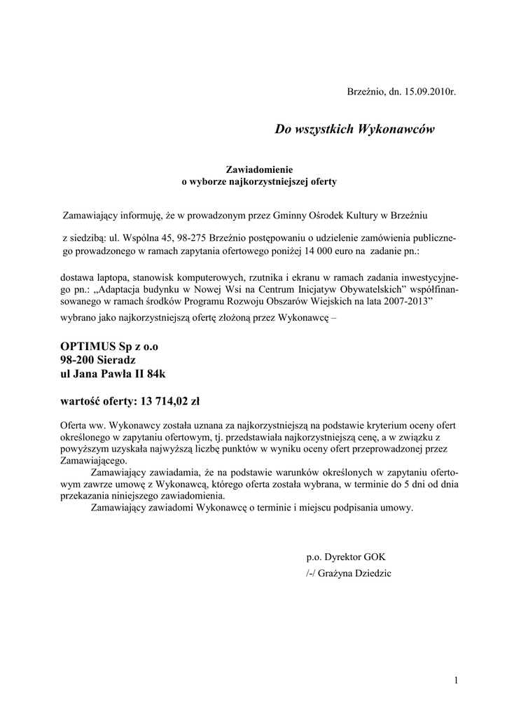 Brzeźnio, dn. 15.09.2010r. Do wszystkich Wykonawców Zawiadomienie o wyborze najkorzystniejszej oferty Zamawiający informuję, Ŝe w prowadzonym przez Gminny Ośrodek Kultury w Brzeźniu z siedzibą: ul. Wspólna 45, 98-275 Brzeźnio postępowaniu o udzielenie zamówienia publicznego prowadzonego w ramach zapytania ofertowego poniŜej 14 000 euro na zadanie pn.: dostawa laptopa, stanowisk komputerowych, rzutnika i ekranu w ramach zadania inwestycyjnego pn.: „Adaptacja budynku w Nowej Wsi na Centrum Inicjatyw Obywatelskich” współfinansowanego w ramach środków Programu Rozwoju Obszarów Wiejskich na lata 2007-2013” wybrano jako najkorzystniejszą ofertę złoŜoną przez Wykonawcę – OPTIMUS Sp z o.o 98-200 Sieradz ul Jana Pawła II 84k wartość oferty: 13 714,02 zł Oferta ww. Wykonawcy została uznana za najkorzystniejszą na podstawie kryterium oceny ofert określonego w zapytaniu ofertowym, tj. przedstawiała najkorzystniejszą cenę, a w związku z powyŜszym uzyskała najwyŜszą liczbę punktów w wyniku oceny ofert przeprowadzonej przez Zamawiającego. Zamawiający zawiadamia, Ŝe na podstawie warunków określonych w zapytaniu ofertowym zawrze umowę z Wykonawcą, którego oferta została wybrana, w terminie do 5 dni od dnia przekazania niniejszego zawiadomienia. Zamawiający zawiadomi Wykonawcę o terminie i miejscu podpisania umowy. p.o. Dyrektor GOK /-/ GraŜyna Dziedzic 1