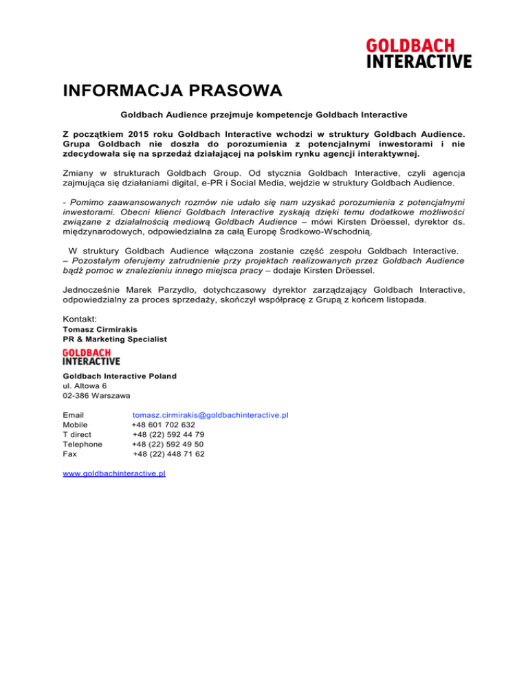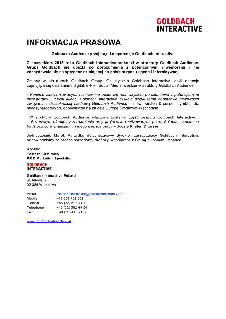 INFORMACJA PRASOWA Goldbach Audience przejmuje kompetencje Goldbach Interactive Z początkiem 2015 roku Goldbach Interactive wchodzi w struktury Goldbach Audience. Grupa Goldbach nie doszła do porozumienia z potencjalnymi inwestorami i nie zdecydowała się na sprzedaż działającej na polskim rynku agencji interaktywnej. Zmiany w strukturach Goldbach Group. Od stycznia Goldbach Interactive, czyli agencja zajmująca się działaniami digital, e-PR i Social Media, wejdzie w struktury Goldbach Audience. - Pomimo zaawansowanych rozmów nie udało się nam uzyskać porozumienia z potencjalnymi inwestorami. Obecni klienci Goldbach Interactive zyskają dzięki temu dodatkowe możliwości związane z działalnością mediową Goldbach Audience – mówi Kirsten Dröessel, dyrektor ds. międzynarodowych, odpowiedzialna za całą Europę Środkowo-Wschodnią. W struktury Goldbach Audience włączona zostanie część zespołu Goldbach Interactive. – Pozostałym oferujemy zatrudnienie przy projektach realizowanych przez Goldbach Audience bądź pomoc w znalezieniu innego miejsca pracy – dodaje Kirsten Dröessel. Jednocześnie Marek Parzydło, dotychczasowy dyrektor zarządzający Goldbach Interactive, odpowiedzialny za proces sprzedaży, skończył współpracę z Grupą z końcem listopada. Kontakt: Tomasz Cirmirakis PR & Marketing Specialist Goldbach Interactive Poland ul. Altowa 6 02-386 Warszawa Email Mobile T direct Telephone Fax [email protected] +48 601 702 632 +48 (22) 592 44 79 +48 (22) 592 49 50 +48 (22) 448 71 62 www.goldbachinteractive.pl Profil Goldbach Audience Goldbach Audience to wiodący dostawca nowoczesnych narzędzi do realizacji kampanii display, wideo i mobile w internecie. W ramach swojej sieci reklamowej firma zrzesza serwisy internetowe oraz łączy grupy docelowe z reklamodawcami. Goldbach Audience oferuje profesjonalną obsługę, indywidualne rozwiązania reklamowe oraz strukturyzowane produkty, które mają pomóc klientom w realizacji różnorodnych projektów reklamowych. Profil Goldbach Interactive Jesteśmy agencją interaktywną, specjalizującą się w działaniach typu „dialog and content”. Co to znaczy? Łączymy Digital z PR, e-PR, Social Media oraz integrujemy je z Ambientem i Event Marketingiem. Dzięki tym niestandardowym metodom potrafimy przebić się z przekazem przez clutter reklamowy i realnie angażować konsumentów w relacje z marką. Działamy blisko klientów , z dala od szumu informacyjnego tradycyjnych mass mediów. Realizując nasze projekty, łączymy know-how grupy Goldbach, międzynarodowej firmy medialnej, operującej w 10 krajach, z doświadczeniem działającej od wielu lat w Polsce grupy Arbo. Dzięki opiniom naszych klientów (wśród nich adidas, Bosch, Bakoma, Empik) zostaliśmy wyróżnieni w badaniu Millward Brown, jako agencja oferująca długoterminowe rozwiązania i wysoki zwrot z inwestycji. Profil Goldbach Poland Goldbach Poland jest częścią międzynarodowej grupy medialnej Goldbach Group. W ramach Goldbach Poland funkcjonują dwie linie biznesowe: Goldbach Audience (dostawca technologii i powierzchni reklamowej online i mobile) oraz Goldbach Interactive (agencja interaktywna). Dzięki nim firma dostarcza swoim klientom i partnerom kompleksowe usługi komunikacyjne takie jak strategia, doradztwo, kreacja, projektowanie, zakup i obsługa kampanii w mediach online.