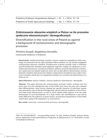 Problemy Drobnych Gospodarstw Rolnych • Nr 1 • 2014, 37–54 Problems of Small Agricultural Holdings • No. 1 • 2014, 37–54 Zróżnicowanie obszarów wiejskich w Polsce na tle procesów społeczno-ekonomicznych i demograficznych Diversification in the rural areas of Poland as against a background of socioeconomic and demographic processes Wioletta Knapik, Magdalena Kowalska Uniwersytet Rolniczy w Krakowie Streszczenie. Artykuł prezentuje zjawiska i procesy społeczno-gospodarcze, które ewoluując na przestrzeni lat nie tylko zmieniały oblicze polskiej wsi, ale również pogłębiały zróżnicowanie obszarów wiejskich. Przedstawiono wybrane czynniki, które w określony sposób kształtowały charakter poszczególnych regionów, nadając im odrębność, tj. uwarunkowania historyczne, warunki przyrodniczo-glebowe, poziom infrastruktury technicznej i społecznej oraz kapitał społeczny, który jawi się jako główna determinanta rozwoju obszarów wiejskich. Rozwój ten jest i będzie w dużej mierze utrudniany przez wpływ istotnych czynników, takich jak m.in. depopulacja polskiej wsi, starzenie się społeczeństwa czy bieda na wsi. Słowa kluczowe: obszary wiejskie • procesy społeczno-ekonomiczne • demografia Abstract. The paper discusses the socioeconomic processes which, evolving over the years, have not only changed the face of the Polish rural areas, but also have widened their differentiation. Some factors shaping the specific character of individual regions were presented, such as historical background, natural and soil conditions, level of technical and social infrastructure, as well as social capital which appears to be the main determinant of rural development. To a large extent, this development is and will be made difficult by the influence of major factors, among them depopulation of the Polish countryside, aging of the population, or rural poverty. Key words: rural areas • socioeconomic processes • demography Adres do korespondencji – Corresponding author: Dr hab. Wioletta Knapik, Instytut Ekono miczno-Społeczny, Uniwersytet Rolniczy w Krakowie, al. Mickiewicza 21, 31-120 Kraków; e-mail: [email protected]. PDGR 1_2014.indd 37 2014-05-15 14:26:24 38 Wioletta Knapik, Magdalena Kowalska Wstęp Społeczno-ekonomiczne zróżnicowanie polskiej wsi powstało w konsekwencji złożonych procesów społecznych, politycznych i gospodarczych przebiegających na przestrzeni stuleci. Polska wieś nie jest jednorodna, a na jej dzisiejszy obraz mają wpływ czynniki determinujące rozwój społeczno-gospodarczy obszarów wiejskich. Jest ich wiele i w różnym stopniu oddziałują na stan wsi. W artykule przedstawiono wybrane, istotne czynniki rozwoju obszarów wiejskich, tj. uwarunkowania historyczne, warunki przyrodniczo-glebowe, poziom infrastruktury technicznej oraz zasoby ekonomiczne, ludzkie i społeczne, na tle procesów społeczno-ekonomicznych i demograficznych zachodzących na tych terenach. Dodatkowo zaprezentowano sytuację w zakresie zatrudnienia i bezrobocia na wsi oraz ruchu migracyjnego. Celem pracy było wskazanie wpływu wymienionych czynników na zróżnicowanie rozwoju obszarów wiejskich w Polsce. Materiał i metody W opracowaniu wykorzystano materiały pozyskane z dostępnej literatury przedmiotu, w tym pozycji książkowych, raportów oraz danych i analiz statystycznych. Na podstawie zgromadzonego materiału zbadano oddziaływanie różnych czynników dywersyfikujących rozwój obszarów wiejskich w Polsce. Wyniki Uwarunkowania historyczne a zróżnicowanie obszarów wiejskich Ważnym czynnikiem wpływającym na zróżnicowanie obszarów wiejskich jest czynnik historyczny. Ze względu na ograniczoną objętość artykułu nie sposób prześledzić całej historii naszej państwowości pod kątem dynamiki zmian obszarów wiejskich, ale wystarczy cofnąć się do czasów Polski pod zaborami, by uzyskać obszerny materiał do porównań. Rozwój wsi i rolnictwa miał ścisły związek z rozwojem gospodarczym konkretnego zaborcy i polityką jego władz. W zaborze pruskim rolnictwo było prężnym, dominującym sektorem gospodarki, wspomaganym przez powstający wówczas przemysł. Przemyślany, wielopłaszczyznowy rozwój rolnictwa w Wielkopolsce spowodował, że region ten stał się jednym z głównych ośrodków produkcji żywności w Niemczech. W odróżnieniu od zaboru pruskiego rolnictwo w zaborze rosyjskim i austriackim cechowało się niską wydajnością. Najmniej korzystną sytuację miał pod tym względem zabór austriacki, w którym uwłaszczenie nie objęło chłopów małorolnych, a tym samym wieś stała się „eksporterem” siły roboczej do miasta. Szacuje się, że przed I wojną światową na ziemiach polskich ludność zamieszkująca tereny wiejskie, dla której rolnictwo było głównym źródłem utrzymania, liczyła 19,3 mln osób, w czasach II Rzeczypospolitej było to średnio 19,5 mln, w okresie PRL-u – średnio 9,5 mln, a w latach transformacji ustrojowej – średnio 3,3 mln osób. Szczegółowe dane dotyczące liczby ludności wiejskiej w poszczególnych latach prezen- PDGR – PSAH PDGR 1_2014.indd 38 2014-05-15 14:26:24 39 Zróżnicowanie obszarów wiejskich w Polsce na tle procesów społeczno-ekonomicznych... tuje rycina 1. Z przedstawionych danych wynika, że liczba ludności rolniczej zwiększała się jedynie w okresie międzywojennym. Począwszy od roku poprzedzającego wybuch II wojny światowej notowano stały spadek tej liczby, przy czym największy ubytek wystąpił między rokiem 1938 a 1950, co było spowodowane ogólnym stratami ludności w czasie ostatniej wojny. W okresie od początku transformacji ustrojowej do 1996 r. liczba ludności rolniczej zmniejszyła się niemal o połowę, a kolejne sześć lat zaznaczyło się dalszym spadkiem liczebności tej kategorii ludności o 700 tys. osób. Ogólnie okres międzywojenny (lata 1918–1939) charakteryzował się przeludnieniem polskiej wsi. Pocz