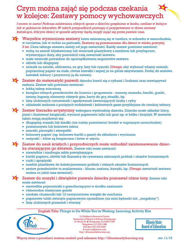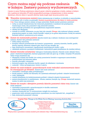 Czym można zająć się podczas czekania w kolejce: Zestawy pomocy wychowawczych I znowu to samo! Podczas załatwiania różnych spraw z dziećmi grzęźniesz w korku, czekasz w kolejce lub w gabinecie lekarskim. W takich przypadkach pomogą ci przygotowane w domu zestawy kształcące, którymi dzieci w sposób aktywny będą mogły zająć się przez pewien czas. Wszystkie wymienione zestawy łatwo zmieszczą się w torebce, w schowku w samochodzie, w tornistrze, lub w torbie na pieluszki. Zestawy są przeznaczone dla dzieci w wieku powyżej 3 lat. Cena takiego zestawu zależy od jego zawartości. Każdy zestaw powinien zawierać: torbę na zamek błyskawiczny lub woreczek plastykowy z zamkiem lub przylepcem, wystarczjąco duży, aby pomieścić całą zawartość zestawu. małe woreczki potrzebne do uporządkowania segmentów zestawu ołówki lub długopisy notesik na notatki, obliczenia, na gry, listy lub rysunki (Uwaga: aby wykonać własny notesik; poprzecinaj papier na małe, równe kawałki i zepnij je na górze zszywaczem. Dodaj do zestawu kawałek tektury i przymocuj ją do notesu). Zestaw do matematyki pozwoli dziecku bawić się z cyframi i liczbami oraz rozwiązywać zadania. Zestaw taki powinien zawierać: lekką taśmę mierniczą komplet różnych przedmiotów do liczenia i grupowania - monety, ziarenka, fasolki, guziki, żetony, kupony, elementy różnych gier, karty do gry, strzałki, itp. listę ulubionych rymowanek i zgadywanek zawierających liczby i cyfry układanki zrobione z pociętych widokówek i kolorowych gazet przyklejone do cienkiej tektury. Zestaw literacko-artystyczny wzbogaca wyobraźnię dziecka. Dziecko może układać litery, pisać i ilustrować książeczki, wycinać papierowe lalki lub grać np. w kółko i krzyżyk. W zestawie takim mogą znajdować się: długopisy, mazaki lub kredki (nie należy pozostawiać kredek w nagrzanym samochodzie) przezroczysta lub kolorowa taśma znaczki, pieczątki i stempelki kolorowy papier (np. kolorowe kartki z gazet) do składania i wycinania nożyczki – które są bezpieczne i łatwe w użyciu Zestaw do nauk ścisłych i przyrodniczych może wzbudzić zainteresowanie dziecka otaczającym go światem. Zestaw taki może zawierać: niewielkie i niedrogie szkło powiększające kartki papieru, ołówki lub flamastry do rysowania zebranych próbek i okazów botanicznych rurki i sprężynki torebki plastikowe do kolekcjonowania próbek i różnych okazów botanicznych zestaw przedmiotów to analizowania - klucze, nasiona, kamyki, itp. (Uwaga: zawartość zestawu można co jakiś czas zmieniać). Zestaw do muzyki i dźwięków pozwala dziecku poznawać różne tony. Zestaw taki może zawierać: niewielkie pojemniczki z grzechoczącymi w środku nasionami różnorodne elastyczne gumki nieduże chusteczki lub 12 centymetrowe wstążki do machania papierowe tubki owinięte papierowym ręcznikiem (na mini bębenki lub „megafony”) listę ulubionych piosenek i wierszy English Title: Things to Do While You’re Waiting: Learning Activity Kits Early Learning Project 13 Children’s Research Center University of Illinois at Urbana-Champaign 51 Gerty Dr.Champaign, IL 61820-7469 Telephone: 217-333-1386 Toll-free: 877-275-3227 E-mail: [email protected] http://illinoisearlylearning.org Illinois State Board of Education Więcej stron z poradami możesz znaleźć pod adresem http://illinoisearlylearning.org rev. 11/15