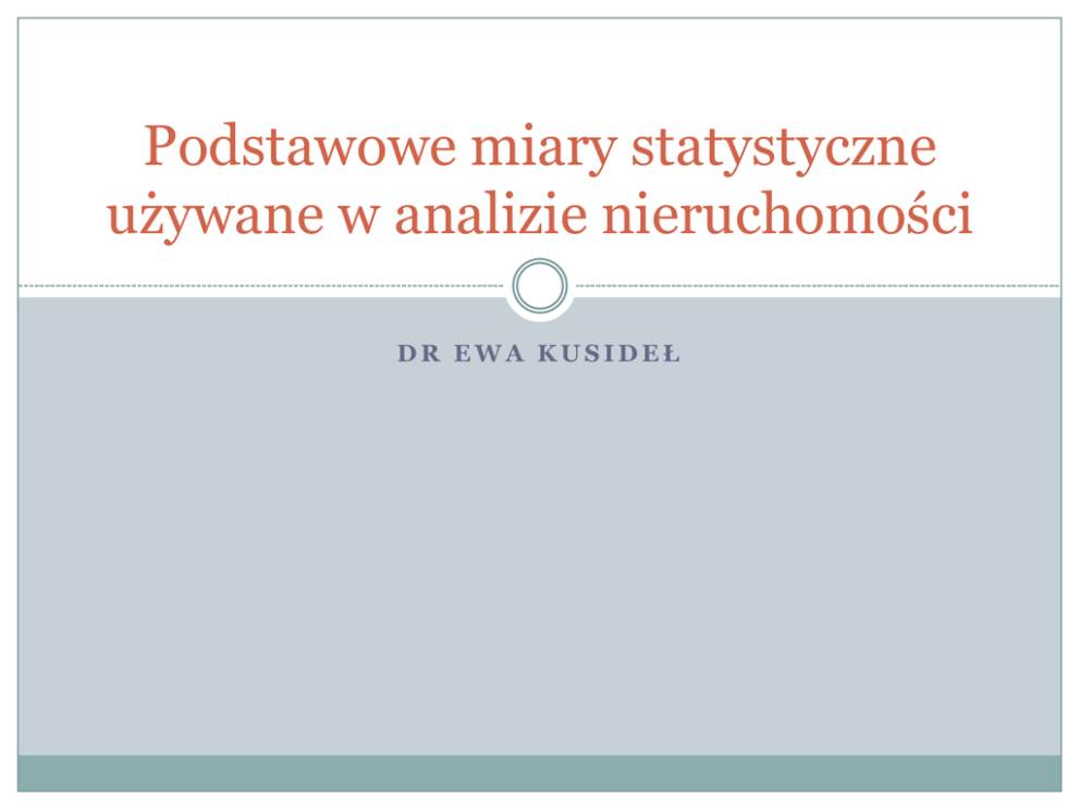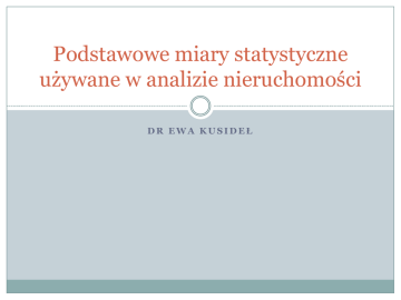 Podstawowe miary statystyczne używane w analizie nieruchomości DR EWA KUSIDEŁ Podstawowe miary statystyczne używane w analizie nieruchomości Miary oczekiwanej wartości ceny nieruchomości: średnia, mediana, dominanta (statystycznie: miary tendencji centralnej) Miary ryzyka: odchylenie standardowe, rozstęp, współczynnik zmienności (statystycznie: miary rozproszenia) Miary współzależności zjawisk na rynku nieruchomości: korelacja, analiza regresji Miary położenia Najczęściej używaną miarą przeciętną jest średnia arytmetyczna obliczana jako suma zbioru wartości podzielona przez ich liczbę. Na przykład średnią liczb 2, 3, 3, 5, 7 i 10 jest wartość 30 podzielona przez 6, czyli 5. Wyliczenie średniej przykład Należy wyliczyć średnią wartość pensji pracowników pewnej przychodni. W tym celu zliczamy pensje pracowników i dzielimy przez ich liczbę (40) pracownik1 pracownik2 pracownik3 pracownik4 pracownik5 pracownik6 pracownik7 pracownik8 pracownik9 pracownik10 pracownik11 pracownik12 pracownik13 pracownik14 pracownik15 pracownik16 pracownik17 pracownik18 pracownik19 pracownik20 pracownik21 pracownik22 pracownik23 pracownik24 pracownik25 pracownik26 pracownik27 pracownik28 pracownik29 pracownik30 pracownik31 pracownik32 pracownik33 pracownik34 pracownik35 pracownik36 pracownik37 pracownik38 pracownik39 pracownik40 pensja premia 715 850 690 720 450 890 630 715 870 690 940 710 420 560 880 910 740 530 770 715 640 810 910 560 800 190 950 580 690 715 530 900 650 410 840 565 820 700 630 715 815 900 490 820 430 900 530 815 970 590 940 810 320 460 920 910 840 430 870 815 540 910 910 460 900 220 900 480 590 815 530 900 550 410 900 565 920 800 530 600 W którym przypadku średnia będzie dobrą miarą przeciętną? Przykład szeregu jednomodalnego Przykład szeregu dwumodalnego Średnia – przykład 2 Na Dni Otwarte Przedszkola nr 2 przyszły 3-letnie dzieci i jedno z ich 30-sto letnich rodziców. Jaka była średnia wieku tych osób. Użycie w tym przypadku średniej arytmetycznej pokaże, że średnia wieku to 16,5 roku. Jest to przykład danych dwumodalnych (o dwóch wartościach dominujących), dla którego nie można stosować średniej arytmetycznej. Mediana – wartość środkowa Przykład. Należy wyznaczyć średnią cenę zakupu mieszkania w województwie mazowieckim na podstawie następujących danych transakcyjnych Powiat sokołowski Powiat szydłowiecki Powiat zwoleński Powiat siedlecki Powiat przysuski Powiat węgrowski Powiat warszawski średnia cena 1 m2 2 139 zł 2 235 zł 2 433 zł 2 628 zł 2 661 zł 2 900 zł 9 200 zł 3 457 zł Mediana – wartość środkowa Mediana jest znacznie bardziej odporna od średniej na wartości nietypowe. Medianę należy polecić szczególnie w przypadku cen transakcyjnych nieruchomości, bowiem jest odporna na transakcje nietypowe, które często występują na rynku nieruchomości. Dominanta – Zwana jest również modą, wartością typową, wartością modalną lub wartością najczęstszą. Jest ona wartością cechy, która najczęściej występuje w zbiorowości badanej. Reguła korzystania z miar położenia jeśli rozkład jest jednomodalny i względnie symetryczny - stosujemy średnią; jeśli rozkład jest jednomodalny, ale niesymetryczny - stosujemy medianę; jeśli rozkład jest wielomodalny - zwykle wykorzystujemy wartości modalne Miary rozproszenia Odchylenie standardowe n s ( xi x ) 2 i 1 n 1 Rozstęp R=max-min Współczynnik zmienności S V x