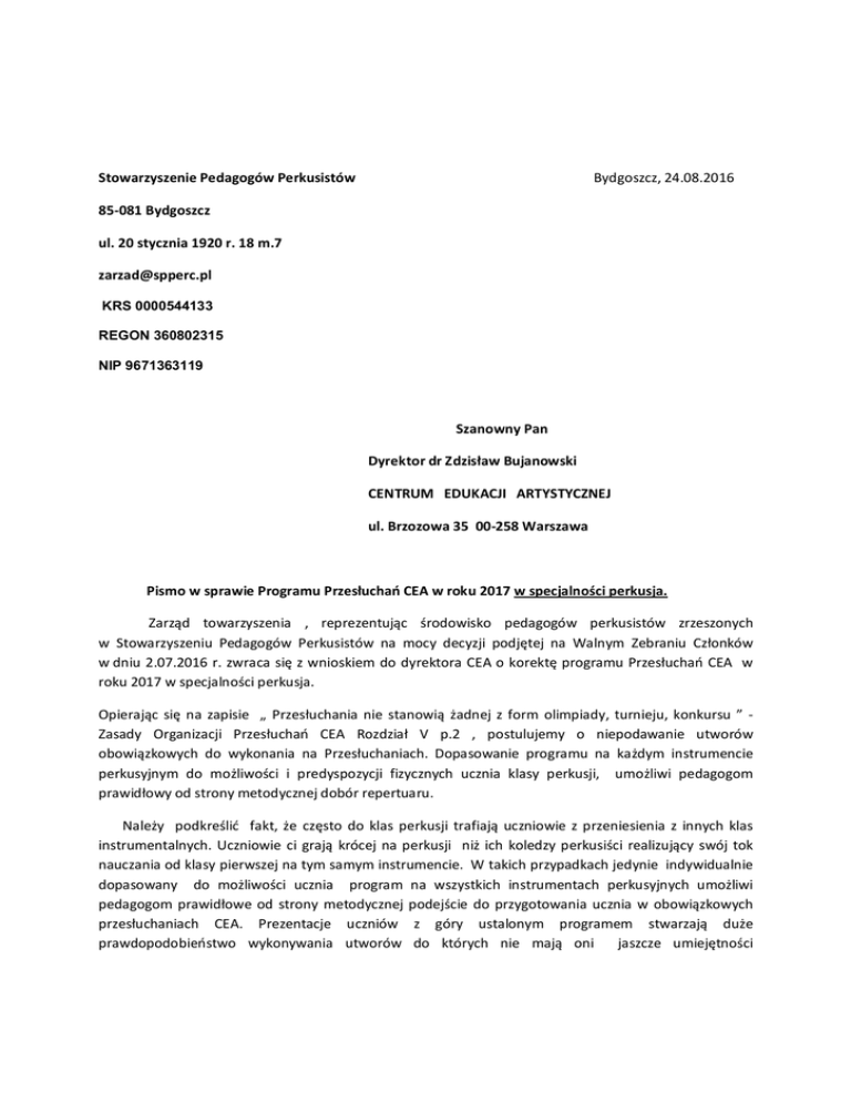 Stowarzyszenie Pedagogów Perkusistów Bydgoszcz, 24.08.2016 85-081 Bydgoszcz ul. 20 stycznia 1920 r. 18 m.7 [email protected] KRS 0000544133 REGON 360802315 NIP 9671363119 Szanowny Pan Dyrektor dr Zdzisław Bujanowski CENTRUM EDUKACJI ARTYSTYCZNEJ ul. Brzozowa 35 00-258 Warszawa Pismo w sprawie Programu Przesłuchań CEA w roku 2017 w specjalności perkusja. Zarząd towarzyszenia , reprezentując środowisko pedagogów perkusistów zrzeszonych w Stowarzyszeniu Pedagogów Perkusistów na mocy decyzji podjętej na Walnym Zebraniu Członków w dniu 2.07.2016 r. zwraca się z wnioskiem do dyrektora CEA o korektę programu Przesłuchań CEA w roku 2017 w specjalności perkusja. Opierając się na zapisie „ Przesłuchania nie stanowią żadnej z form olimpiady, turnieju, konkursu ” Zasady Organizacji Przesłuchań CEA Rozdział V p.2 , postulujemy o niepodawanie utworów obowiązkowych do wykonania na Przesłuchaniach. Dopasowanie programu na każdym instrumencie perkusyjnym do możliwości i predyspozycji fizycznych ucznia klasy perkusji, umożliwi pedagogom prawidłowy od strony metodycznej dobór repertuaru. Należy podkreślić fakt, że często do klas perkusji trafiają uczniowie z przeniesienia z innych klas instrumentalnych. Uczniowie ci grają krócej na perkusji niż ich koledzy perkusiści realizujący swój tok nauczania od klasy pierwszej na tym samym instrumencie. W takich przypadkach jedynie indywidualnie dopasowany do możliwości ucznia program na wszystkich instrumentach perkusyjnych umożliwi pedagogom prawidłowe od strony metodycznej podejście do przygotowania ucznia w obowiązkowych przesłuchaniach CEA. Prezentacje uczniów z góry ustalonym programem stwarzają duże prawdopodobieństwo wykonywania utworów do których nie mają oni jaszcze umiejętności warsztatowych .Może to sprzyjać powstawaniu błędów technicznych i manier wykonawczych, których w dalszym procesie kształcenia trudno będzie wyeliminować. Uważamy, że program Przesłuchań CEA powinien sprzyjać budowaniu pozytywnych emocji wśród młodych adeptów klas perkusji oraz ich nauczycieli . Dlatego przedstawiamy poniżej własną propozycję programu na Przesłuchania CEA w roku 2017 w specjalności perkusja wraz z komentarzem. PROGRAM PRZESŁUCHAŃ CEA PERKUSJA SOLO I st. – propozycja SPP Zgodnie z Zasadami Organizacyjnymi Przesłuchań uczniowie zostaną podzieleni na dwie grupy: młodszą – obejmującą klasę czwartą cyklu sześcioletniego i drugą cyklu czteroletniego oraz starszą – obejmującą klasę piątą cyklu sześcioletniego i trzecią cyklu czteroletniego. Program dla grupy młodszej : 1/ Dwie kompozycje na werbel solo. Jedna napisana w technice klasycznej a druga rudymentarnej. 2/ Dowolna kompozycja na marimbę lub wibrafon solo z wykorzystaniem techniki czteropałkowej. 3/Dowolna kompozycja na kotły solo. ( W przypadku gdy szkoła nie dysponuje kotłami uczeń może zagrać na tom – tomach ). 4/ Utwór dowolny na perkusyjny instrument melodyczny (ksylofon, marimba, wibrafon, dzwonki orkiestrowe) z akompaniamentem fortepianu. Czas trwania programu – do 15 minut. Program dla grupy starszej : 1/ Dwie kompozycje na werbel solo. Jedna w technice klasycznej a druga rudymentarnej. 2/ Dowolna kompozycja na marimbę lub wibrafon solo z wykorzystaniem techniki czteropałkowej. 3/Dowolna kompozycja na kotły solo. ( W przypadku gdy szkoła nie dysponuje kotłami uczeń może zagrać na tom – tomach ). 4/ Utwór dowolny na perkusyjny instrument melodyczny (ksylofon, marimba, wibrafon, dzwonki orkiestrowe) z akompaniamentem fortepianu. Czas trwania programu – do 20 minut. KOMENTARZ Przedstawiamy poniżej uzasadnienie doboru programu Przesłuchań CEA w roku 2017 w specjalności perkusja autorstwa pedagogów perkusistów zrzeszonych w Stowarzyszeniu Pedagogów Perkusistów. Przede wszystkim kierowaliśmy się : 1/ Ujednoliceniem wymagań programowych Przesłuchań CEA w stosunku do wszystkich instrumentów. Jedynie w przypadku perkusji autorzy zaprezentowanego w chwili obecnej na stronach internetowych CEA Programu Przesłuchań zamieszczają kompozycje obowiązkowe do wykonania. 2/ W punkcie programu odnoszącego się do wykonania kompozycji z wykorzystaniem techniki czteropałkowej ze względu na różny rozwój fizyczny dzieci w tym wieku pozostawiamy pedagogom dowolność w doborze instrumentu : marimby lub wibrafonu. Ma to swoje uzasadnienie w treści podstawy programowej, która w kwestii gry z wykorzystaniem techniki czteropałkowej odnosi się do wibrafonu i marimby, a nie jedynie do wibrafonu. Problematyczna jest również kwestia umiejętności posługiwania się przez uczniów różnego rodzaju technikami tłumieniami w grze na wibrafonie w grupie starszej. Podstawa programowa obliguje ucznia do posługiwania się tymi umiejętnościami, nie wspominając na jakim etapie kształcenia pedagog ma je wprowadzać. Na pewno uczeń kończący pierwszy etap kształcenia powinien posiadać umiejętności różnego rodzaju tłumienia na wibrafonie. Biorąc jednak pod uwagę fakt częstego rozpoczynania nauki gry na perkusji z tzw. przeniesienia z innych instrumentów, na etapie obowiązkowych przesłuchań CEA w obu grupach wskazane byłoby położenie nacisku w pierwszej kolejności na umiejętność prawidłowego posługiwania się pedałem w grze na wibrafonie. 3/ Dając dowolność w doborze perkusyjnego instrumentu melodycznego przy wykonaniu dowolnego utworu z akompaniamentem, umożliwiamy pedagogom szerszą możliwość wykorzystania posiadanego w szkołach instrumentarium. 4/ Różny czas trwania prezentowanego programu ma związek ze stopniem ich trudności. Dobór programu zarówno w grupie młodszej jak i starszej ma charakter jedynie ramowy, umożliwiając tym samym pedagogom swobodny wybór repertuaru w zależności od stopnia zaawansowania i indywidualnych możliwości psychofizycznych uczniów. Prezentując własną propozycję programu pragniemy kontynuowa