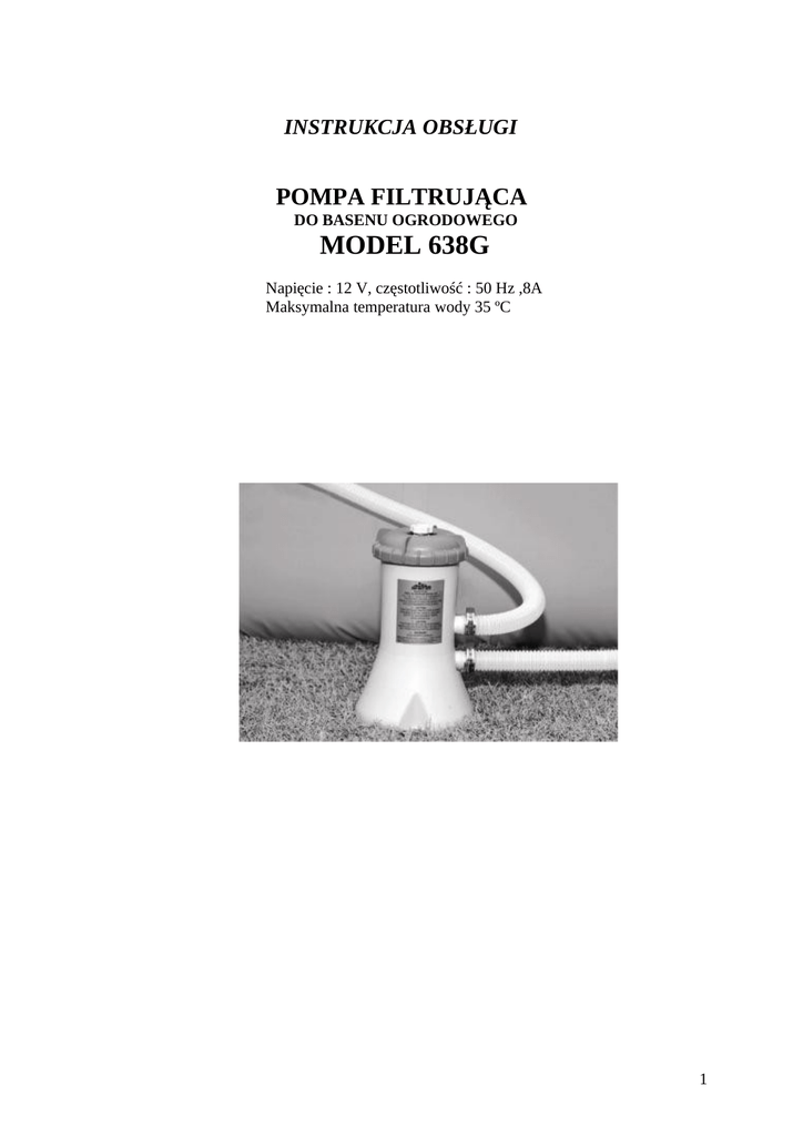 INSTRUKCJA OBSŁUGI POMPA FILTRUJĄCA DO BASENU OGRODOWEGO MODEL 638G Napięcie : 12 V, częstotliwość : 50 Hz ,8A Maksymalna temperatura wody 35 ºC 1 SPIS TREŚCI OSTRZEŻENIA 3 LISTA CZĘSCI 4-5 MONTAŻ 6-7 MONTAŻ NA PODSTAWIE 8 PRZECHOWYWANIE 9 KONSERWACJA I CHEMIA BASENOWA 9 BEZPIECZNE KORZYSTANIE Z BASENU 9 MOGĄCE WYSTĄPIĆ PROBLEMY 10-12 ZASADY BEZPIECZEŃSTWA 12 WAŻNE : PRZECZYTAJ I ZAWSZE POSTĘPUJ ZGODNIE ZE WSKAZÓWKAMI ZAWARTYMI W NINIEJSZEJ INSTRUKCJI. ZACHOWAJ NINIEJSZĄ INSTRUKCJĘ 2 Instrukcja bezpieczeństwa Podczas instalowania i używania sprzętu elektrycznego, powinny być zachowane poniższe środki ostrożności PRZECZYTAJ I POSTĘPUJ ZGODNIE ZE WSZYSTKIMI WSKAZÓWKAMI 1. UWAGA ! Aby zredukować ryzyko doznania obrażeń, nie pozwalaj dzieciom używać pompy filtrującej jeśli nie są pod ciągłym nadzorem dorosłych. 2. UWAGA ! Aby uniknąć ryzyka porażania prądem należy pompę filtrującą podłączyć do gniazdka sieciowego z podłączonym wyłącznikiem różnicowym. Skontaktuj się z wykwalifikowanym elektrykiem, jeśli nie jesteś w stanie określić czy gniazdo sieciowe jest zabezpieczone wyłącznikiem różnicowym. Skorzystaj z usług wykwalifikowanego elektryka w celu zainstalowania wyłącznika różnicowego, którego maksymalne natężenie wynosi 30 mA. 3. UWAGA ! Nie należy zakopywać przewodu elektrycznego. Umieść przewód w miejscu gdzie nie zostanie uszkodzony przez maszynę do strzyżenia trawy, nożyce do żywopłotu czy inny sprzęt ogrodniczy. 4. UWAGA! Przewód nie jest wymienny. 5. UWAGA! Aby zredukować ryzyko porażenia prądem nie używaj przedłużacza aby połączyć pompę filtrującą z gniazdem sieciowym. Używaj prawidłowo zainstalowanego gniazda sieciowego. 6. Nie korzystać z basenu , kiedy pompa jest włączona 7. Zawsze należy odłączać produkt, gdy jest on czyszczony, naprawiany itp. 8. Pompa służy wyłącznie do basenów rozkładanych, Nie ma zastosowania przy basenach stałych. 9. UWAGA! Trzymaj pompę filtrującą w odległości co najmniej 2 metrów od basenu, podobnie jak transformator. Wtyczka od przewodu pompy powinna znajdować się co najmniej 3,5 metra od basenu. 10. UWAGA! Pompa filtrująca nie może być włączona podczas korzystania z basenu. 11. UWAGA! Pompa służy do pracy wyłącznie z basenami rozkładanymi. Nie można jej używać do filtrowania wody w basenach stałych. 12. Montaż i demontaż wyłącznie przez osoby dorosłe. 13. Dzieci muszą znajdować się w bezpiecznej odległości od produktu i przewodów zasilających. 14. Pompa służy wyłącznie do użytku dla celów wskazanych w niniejszej instrukcji. NIESTOSOWANIE SIĘ DO POWYŻSZYCH ZASAD MOŻE DOPROWADZIĆ DO POWAŻNYCH OBRAŻEŃ CIAŁA , A W SKRAJNYCH PRZYPADKACH NAWET DO ŚMIERCI. ZACHOWAJ NINIEJSZĄ INSTRUKCJĘ 3 LISTA CZĘŚCI PRZED ROZPOCZECIEM MONTAŻU POŚWIĘC PARĘ MINUT NA ZAPOZNANIE SIĘ Z LISTĄ CZĘŚCI. LISTA CZĘŚCI 4 Numer opis ilość 1 2 3 4 5 6 7 8 9 10 11 12 Zawór powietrza Uszczelka zaworu Pokrywa Uszczelka pokrywy Wkład wymienny Uszczelka węża Klamra węża Wąż Łącznik sitka Dysza wlotowa Sitko Transformator 1 1 1 1 1 2 4 2 2 1 1 1 Numer części zamiennej 10460 10264 10459 10325 10314 10122 10399 11070 11071 11072 10885 5 Instrukcja instalacji Upewnij się, że masz dostęp do wody, żeby napełnić basen i dysponujesz chemią basenową . Mała moneta może się przydać do zaciśnięcia klamer rur giętkich (7). Pompa jest wyposażona w zawór powietrza ( 1), który jest otwarty. Nie zamykaj zaworu dopóki nie dojdziesz do punktu 8 poniższej instrukcji. 1.Najpierw zmontuj basen. Postępuj zgodnie z instrukcją montażu basenu. 2.Umieść filtr wodny przynajmniej na długość rury giętkiej od ściany basenu, w miejscu gdzie znajduje się czarny łącznik w przedniej ścianie basenu. 3.Umieść zestaw (9 i 10) w górnym podłączeniu węża, później zrób to samo z dolnym podłączeniem – zestaw (9 i 11) Węże (8) zamontuj poprzez umieszczenie w łącznikach. 4.Są dwie rury gięte, które należy podłączyć do końcówek pompy filtrującej. Za pomocą klamry (7) przymocuj jeden z węży (8) do dolnej końcówki wejściowej filtra ( oznaczonej „+”na powłoce basenu ) i do pompy ( oznaczonej „+”). 5.Połącz drugi wąż do górnej końcówki wejściowej na powłoce basenu oraz do dolnego podłączenia na pompie filtrującej. Upewnij się ,że klamry ( 7) są zaciśnięte. 6.Dokręć górną nakrętkę obudowy (3) zgodnie z ruchem wskazówek zegara i upewnij się czy jest dokręcona. Używaj w tym celu tylko rąk. Nie używaj narzędzi typu kleszcze lub szczypce. 7.Napełnij basen do poziomu co najmniej 3-5 cm powyżej górnego połączenia. Woda automatycznie popłynie w dół do pompy. 8.Kiedy woda zacznie przepływać przez otwór zaworu powietrza zamknij zawór powietrza na pokrywie pompy. 9.Podłącz pompę filtrującą do transformatora. Podłącz przewód od transformatora do sieci. UWAGA ! Aby uniknąć ryzyka porażania prądem należy pompę filtrującą podłączyć do gniazdka sieciowego z podłączonym wyłącznikiem różnicowym. Skontaktuj się z wykwalifikowanym elektrykiem, jeśli nie jesteś w stanie określić czy gniazdo sieciowe jest zabezpieczone wyłącznikiem różnicowym. Skorzystaj z usług wykwalifikowanego elektryka w celu zainstalowania wyłącznika różnicowego, którego maksymalne natężenie wynosi 30 mA. 10.Używaj pompy do momentu uzyskania pożądanej czystości. W celu wymiany wkładu , odłącz pompę od sieci, odkręć dyszę (10) i sitko (11) z łącznika i umieść tam zatyczki w kształcie czapeczek. Po wymianie otwórz zawór powietrza, wyjmij zatyczki , pozwól aby powietrze opuściło zawór zanim go ponownie zakręcisz. Umieść ponownie na swoim miejscu dyszę (10) i sitko (11). Pompa może zostać włączona. 6 UPPER/BOTTOM PUMP CONNECTION-GÓRNE/DOLNE PODŁĄCZENIE WĘŻA DO POMPY WATER LEVEL-POZIOM WODY UPPER HOSE CONNECTION – 