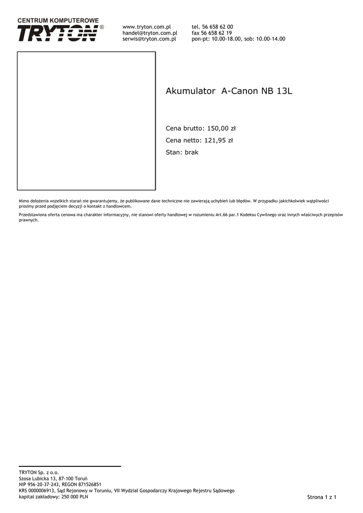 www.tryton.com.pl [email protected] [email protected] tel. 56 658 62 00 fax 56 658 62 19 pon-pt: 10.00-18.00, sob: 10.00-14.00 Akumulator A-Canon NB 13L Cena brutto: 150,00 zł Cena netto: 121,95 zł Stan: brak Mimo dołożenia wszelkich starań nie gwarantujemy, że publikowane dane techniczne nie zawierają uchybień lub błędów. W przypadku jakichkolwiek wątpliwości prosimy przed podjęciem decyzji o kontakt z handlowcem. Przedstawiona oferta cenowa ma charakter informacyjny, nie stanowi oferty handlowej w rozumieniu Art.66 par.1 Kodeksu Cywilnego oraz innych właściwych przepisów prawnych. TRYTON Sp. z o.o. Szosa Lubicka 13, 87-100 Toruń NIP 956-20-37-243, REGON 871526851 KRS 0000006913, Sąd Rejonowy w Toruniu, VII Wydział Gospodarczy Krajowego Rejestru Sądowego kapitał zakładowy: 250 000 PLN Strona 1 z 1