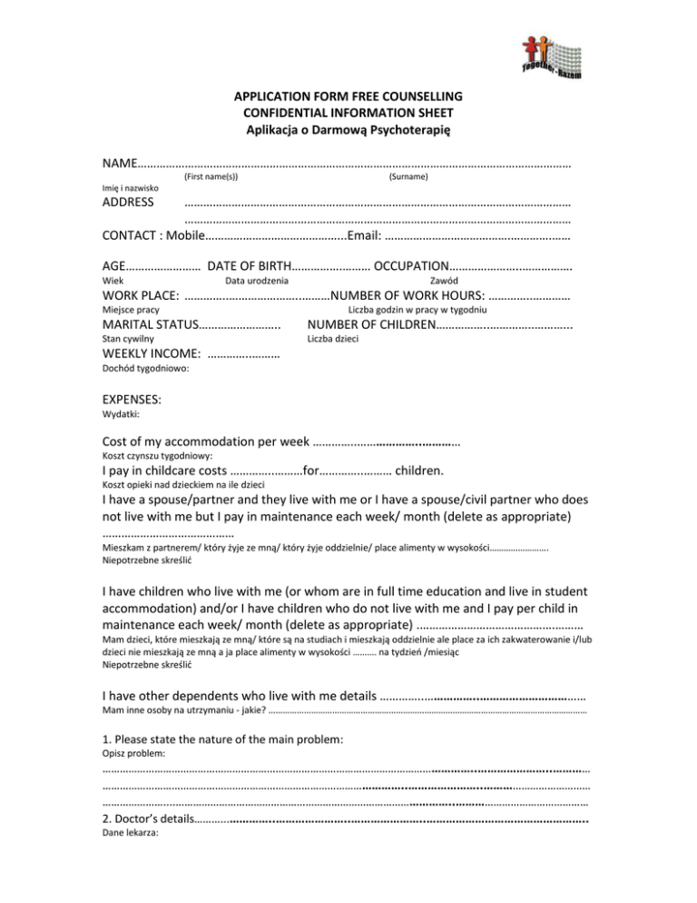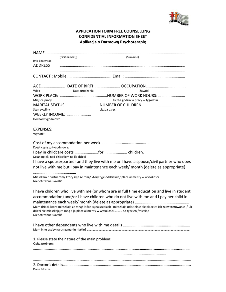 APPLICATION FORM FREE COUNSELLING CONFIDENTIAL INFORMATION SHEET Aplikacja o Darmową Psychoterapię NAME………………………………………………………………………………………………………………………… (First name(s)) (Surname) Imię i nazwisko ADDRESS …………………………………………………………………………………………………………… …………………………………………………………………………………………………………… CONTACT : Mobile……………………………………...Email: ………………………………….………….…… AGE…………………… DATE OF BIRTH…………….……… OCCUPATION…………………..……………. Wiek Data urodzenia Zawód WORK PLACE: …………..…………………..………NUMBER OF WORK HOURS: …………..………… Miejsce pracy Liczba godzin w pracy w tygodniu MARITAL STATUS…………………….. NUMBER OF CHILDREN……………..…………..………... Stan cywilny Liczba dzieci WEEKLY INCOME: …………..……… Dochód tygodniowo: EXPENSES: Wydatki: Cost of my accommodation per week …………..………………..………… Koszt czynszu tygodniowy: I pay in childcare costs …………..………for…………..……… children. Koszt opieki nad dzieckiem na ile dzieci I have a spouse/partner and they live with me or I have a spouse/civil partner who does not live with me but I pay in maintenance each week/ month (delete as appropriate) …………………………………… Mieszkam z partnerem/ który żyje ze mną/ który żyje oddzielnie/ place alimenty w wysokości……………………. Niepotrzebne skreślić I have children who live with me (or whom are in full time education and live in student accommodation) and/or I have children who do not live with me and I pay per child in maintenance each week/ month (delete as appropriate) .…………………………………….……… Mam dzieci, które mieszkają ze mną/ które są na studiach i mieszkają oddzielnie ale place za ich zakwaterowanie i/lub dzieci nie mieszkają ze mną a ja place alimenty w wysokości ………. na tydzień /miesiąc Niepotrzebne skreślić I have other dependents who live with me details …………..……………..…………………………… Mam inne osoby na utrzymaniu - jakie? ……………………………………………………………………………………………………………………… 1. Please state the nature of the main problem: Opisz problem: ………………………………………………………………………………………………………………..…………………..………… …………………………………………………………………………………………..…………………..……………………………… …………………....…………………………………………………………………………………..……………………………………… 2. Doctor’s details………...…………..…………………..…………………..………………………………………….. Dane lekarza: 3. Are you currently receiving medical treatment? YES / NO If yes, please indicate what treatment and/or medication you are receiving: Czy obecnie sie leczysz? Jeśli tak, jakie leki zażywasz? ……………………………………………………………………………………………………………………..…………………..…… 4. Do you have a referral letter from your GP/ other agency? YES / NO If yes, please attach scanned letter Czy masz list referujący Ciebie do terapii od lekarza albo z innej instytucji? Jeśli tak załącz kopię 5. Every effort will be made to offer counselling at a time convenient for you. Please indicate the days (Mon – Fri only) and times you are available for counselling: …………………………………………………………………………………………………………………………..………… (If you can be flexible, the waiting time is likely to be reduced.) Poczynimy wszelkie starania, aby ustalić Tobie najodpowiedniejszy termin, proszę zaznacz, jaki dzień tygodnia do terapii Tobie pasuje oraz godziny. Checklist: Sprawdż czy załączyłeś kopie: Please check that you have included with your application, copies of: A recent payslip, if you work Ostatni payslip jeśli pracujesz A recent Social Welfare receipt or other proof of payment, if you claim Social Welfare Ostatni odcinek z social welfare jeśli nie pracujesz Your most recent Notice of Assessment from Revenue or recent set of accounts, if you are self-employed Twoje ostatnie rozliczenie roczne, jeśli jesteś samozatrudniony DECLARATION - Please read carefully before you sign Deklaracja – przeczytaj uważnie nim podpiszesz 1. I confirm that all the information I have given on this form is correct and I have not deliberately left anything out. Potwierdzam swoim podpisem ze wszystkie informacje sa zgodne z prawdą 2. I understand that due to limited funding going towards Free counselling session’s decision to receive free counselling sessions is based on information provided above and it’s at the discretion of counselor after full assessment of my situation. Rozumiem, iż z powodu ograniczonego dofinansowania, decyzja, co do uzyskania darmowych sesji psychoterapii opiera się na informacjach dostarczonych przez Ciebie I zależy od terapeuty prowadzącego po ocenie Twojej sytuacji. 3. I understand that Data Protection and Freedom of Information the U-Clinic will treat all information and personal data you give as confidential. Rozumiem ze wszystkie te dane śą ściśle poufne i wszystkie dane osobiste są chronione przez Together-Razem. 4. I understand that processing time of this application may var