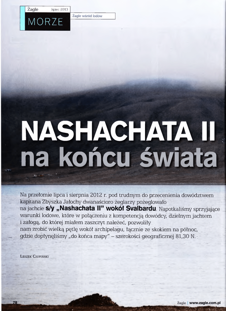 Ż a g le lipiec 2013 Żagle w śró d lodów MORZE NASHACHATA II na końcu świata Na przełomie lipca i sierpnia 2012 r. pod trudnym do przecenienia dowództwem kapitana Zbyszka Jałochy dwanaścioro żeglarzy pożeglowało na jachcie S /y „Nashachata II” WOkÓł Svalbardu. Napotkaliśmy sprzyjające warunki lodowe, które w połączeniu z kompetencją dowódcy, dzielnym jachtem i załogą, do której miałem zaszczyt należeć, pozwoliły nam zrobić wielką pętlę wokół archipelagu, łącznie ze skokiem na północ, gdzie dopłynęliśmy „do końca mapy" - szerokości geograficznej 81,30 N. L e sz e k C iu p iń s k i N A S H A C H A T A II „N a s h a c h a ta II” to 6 7 -s to p o w y ja c h t p rz y stoso w any do żeg lo w ania w w a ru n ka ch arktycznych. Ja ch t ten je s t w yposa żony w 12 koi w sześciu d w uo sobo w ych kabinach i d w ie to a iety z prysznicam i. Dzięki dużej przestrzeni na prze ch o w yw a n ie sprzętu i żyw ności przy stoso w any je s t do d łu g ic h w yp ra w , a 1800-litro w e zapasy pa liw a oraz od sa la rka zap ew nia ją niem al n ieo gra niczoną a u to n o m ię na w e t przy bezw ietrznej pogodzie. TECHNICZNE 20,42 m 5,26 m 2,82 m 26 m 220 m2 9w 8w C IU P IŃ S K A długość szerokość zanurzenie wys. m asztu nad pow. wody powierzchnia żagla (maks.) średnia prędkość pod żaglami średnia prędkość na silniku BOŻENA PARAMETRY 79 Żagle MORZE lipiec 2013 Żagle w śró d lodów ■ O to cze n i n ie zw ycię żo n ym i lo d a m i A rk ty k i sta liśm y, m ilc z ą c w zru sze n i, w p a trz e n i w t e n su ro w y, m a je s ta ty c z n y pejzaż i nie c h c ia ło n a m s ie n igdzie w racać... 80 ■ N a sza za to g a na p ó łn o c n y m k o ń c u ś w ia ta , czyli „D a le j się nie da...” ■ na p la c a c h w c ią ż s to ją p o m n ik i Lenina W trakcie trzytygodniowego rejsu (1330 Mm) odwiedziliśmy cztery polskie stacje badaw cze na Spitsbergenie (a byty to: Kaffioyra, H ornsund, Calypso, P etunia, w szędzie do znając nadzw yczajnej gościn n o ści ro d a ków), dw a postsow ieckie m iasteczka gór nicze (B arentsburg i Pyram iden) oraz naj dalej w y su n iętą n a północ osadę ludzką na świecie (Ny-Alesund). Niezliczoną ilość razy lądow aliśm y pontonem na brzegu, n a tk n ę liśm y się n a w szystkich głów nych p rzed stawicieli zw ierząt zamieszkujących w yspy i m orze (foki, morsy, renifery, wieloryby, li sy polarne i... jednego białego misia!). Na lą dzie i wodzie doszło do spo tk ań z n ietu zin kow ym i postaciam i polskiego żeglarstw a i po larn ictw a M artą Sziłajtis, któ ra - p o konując Kanał B iało m o rsk i-d o tarła w ła ś nie n a Svalbard z M urm ańska, H enrykiem Wolskim, obecnie pracującym jako „expe dition leader" n a statk u „Quest", i Wojcie chem M oskalem, któ ry m ieszka i pracuje w N y-A lesund, oraz z ja c h ta m i p ły w ają ponadto na głów nym placu ustaw ione je st popiersie giganta obu b ie g u n ó w -A m u n d sena. Je st rów nież knajpa. O knajpie nieco szerzej za chwilę. Wzdłuż główniej ulicy (nie przesadzajmy!) u sytuow ane są tablice ostrzegające, iż zej ście z głów nego tra k tu bez broni palnej jest zakazane (niedźwiedzie polarne!), natom iast nierozsądne zaglądanie pod kamienie na po bliskiej łące grozi atakiem szczególnie ag re syw nych w okresie lęgow ym rybitw, czyli mniej więcej wtedy, kiedy ta m byliśmy. Pta ki podryw ały się ze swoich ukrytych w ka m ien iach gniazd, w któ ry ch w ysiadyw a ły jajka lub chroniły pisklęta i nadlatyw ały z w ojennym piskiem , atakow ały nasze gło w y z niezw ykłą zaciętością bez jakiegokol w iek lęku i w tej straceńczej odw adze było tyle siły życia i determ inacji do jego utrzy m ania i kontynuacji, iż bez dwóch zdań nie zostaw ało n am nic innego, jak pokłonić się nad cudem życia i panującym i tu na półno cy surow ym i praw am i natury. cym i pod polską b a n d e rą („Oceania", „Hi O cean One" i „Operon"). Wiele m ożna pisać o tych niegościnnych w yspach, ich surow ym pięknie, stalow ym m orzu, b łęk itn y ch lodow cach, dziw nych osadach ludzkich i tych opuszczonych przed wielu dziesiątkam i lat, i tych dzisiejszych oraz sp o tk a n y c h ludziach. Skoro je d n a k ogranicza n as cierpliwość czytelnika - p o zwólcie n a kilka im presji. N y- A l e s u n d To niew ielka, najdalej n a św iecie w y su n ię ta na północ stale zam ieszkała przez ludzi osada. Na potw ierdzenie tego faktu n a roz licznych szyldach um ieszczono stosow ne inform acje o n iebudzącej żadnej w ą tp li w ości szerokości geograficznej tego m iej sca (78,55 N). Złożona je s t z kilkudziesię ciu kolorowych drew nianych domków n ie licznych mieszkańców , nieco okazalszych siedzib kilku stacji naukow ych, zask ak u jącego tro ch ę sw oją o bszernością sklepu, Ż agle www.zagle.com .pl ■ M o rsy są og ro m n e , m o n s tru a ln e i uro c z o b rzydkie ■ D a lej ju ż ty lk o n ie w id o c z n e d la nas w ie c z n e lo dy i w ie rz c h o łe k naszej planety, kraw ęd ź św ia ta . Bezsprzecznie obowiązkiem każdego pro stego m ary n arza przybyw ającego do n ie znanego portu jest odwiedzenie miejscowej knajpy - ale gdzie portow e dziewki znane z szant i gdzie ru m ? W trakcie dnia - co kolwiek by to tu znaczyło - była n ie ste ty zam knięta... Poszliśmy w ieczorem czy n o c ą - zostaw m y w spokoju tę kłopotliw ą n a tych szero kościach kw estię pory dnia. Stylowe, drew n ian e w n ętrze zaludniało z 50 urodziw ych dziew cząt i chłopców - pracow ników licz nych tu stacji badaw czych oraz m iejsco wej młodzieży. Na stołach płonęły św iecz ki, panow ał przyjem ny m rok - jak w każdej szanującej się knajpie w naszej poczciwej Europie. Na m iniaturow ej estrad zie b a r dzo sm utno zawodził jakiś chłopak z g itarą i choć nie znam norweskiego, bez w ątpienia śpiew ał m ianow icie o swoj