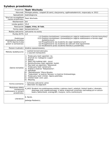 Sylabus przedmiotu Przedmiot: Teatr Wschodu Kierunek: Filologia polska, I stopień [6 sem], stacjonarny, ogólnoakademicki, rozpoczęty w: 2012 Specjalność: teatrologiczna Tytuł lub szczegółowa Teatr Wschodu nazwa przedmiotu: Rok/Semestr: II/4 Liczba godzin: 15,0 Nauczyciel: Lappo, Irina, dr hab. Forma zajęć: konwersatorium Rodzaj zaliczenia: zaliczenie na ocenę Punkty ECTS: 1,0 1,0 Godziny kontaktowe z prowadzącym zajęcia realizowane w formie konsultacji 15,0 Godziny kontaktowe z prowadzącym zajęcia realizowane w formie zajęć dydaktycznych 5,0 Przygotowanie się studenta do zajęć dydaktycznych 4,0 Przygotowanie się studenta do zaliczeń i/lub egzaminów 5,0 Studiowanie przez studenta literatury przedmiotu Godzinowe ekwiwalenty punktów ECTS (łączna liczba godzin w semestrze): Poziom trudności: średnio zaawansowany Metody dydaktyczne: • wykład konwersatoryjny • z użyciem komputera 1. 2. 3. 4. 5. 6. 7. Zakres tematów: 8. 9. 10. 11. 12. 13. 14. Forma oceniania: Tradycyjny teatr japoński: no. Dramat no i kategoria 'yugen' Kabuki. Taetr trój-ludzkiej lalki - joruri. Kontrkulturowy teatr japoński: butoh. Pop-teatr po japońsku: Takarazuki Tradycyjny teatr sanskrycki. Traktat o teatrze "Natjasiastra". Kathakali. "Mahabharata" Pitera Brooka. "Siakuntala" w teatrze Tairowa i w teatrze Grotowskiego. Tradycyjny teatr chiński. Opera pekińska. Chiński teatr cieni: pijin. Wayang. • końcowe zaliczenie ustne • obecność na zajęciach Modułowe efekty K_W22 Student ma podstawową wiedzę z zakresu teorii, estetyki, historii teatru i dramatu kształcenia dawnego oraz współczesnego, a także znajomość przemian zachodzących w sztuce realizowane w ramach teatru (aktorstwie, scenografii, muzyce, ruchu scenicznym) przedmiotu: Literatura: K. Renik, Jadwiga Rodowicz,