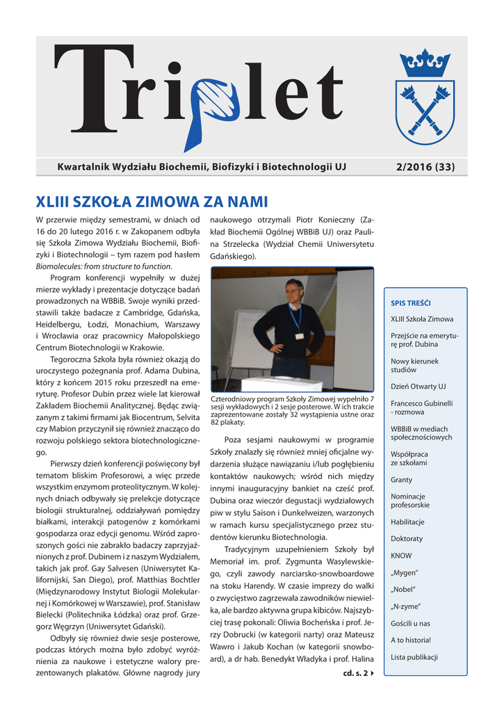 Kwartalnik Wydziału Biochemii, Biofizyki i Biotechnologii UJ 2/2016 (33) XLIII Szkoła Zimowa za nami W przerwie między semestrami, w dniach od 16 do 20 lutego 2016 r. w Zakopanem odbyła się Szkoła Zimowa Wydziału Biochemii, Biofizyki i Biotechnologii – tym razem pod hasłem Biomolecules: from structure to function. Program konferencji wypełniły w dużej mierze wykłady i prezentacje dotyczące badań prowadzonych na WBBiB. Swoje wyniki przedstawili także badacze z Cambridge, Gdańska, Heidelbergu, Łodzi, Monachium, Warszawy i Wrocławia oraz pracownicy Małopolskiego Centrum Biotechnologii w Krakowie. Tegoroczna Szkoła była również okazją do uroczystego pożegnania prof. Adama Dubina, który z końcem 2015 roku przeszedł na emeryturę. Profesor Dubin przez wiele lat kierował Zakładem Biochemii Analitycznej. Będąc związanym z takimi firmami jak Biocentrum, Selvita czy Mabion przyczynił się również znacząco do rozwoju polskiego sektora biotechnologicznego. Pierwszy dzień konferencji poświęcony był tematom bliskim Profesorowi, a więc przede wszystkim enzymom proteolitycznym. W kolejnych dniach odbywały się prelekcje dotyczące biologii strukturalnej, oddziaływań pomiędzy białkami, interakcji patogenów z komórkami gospodarza oraz edycji genomu. Wśród zaproszonych gości nie zabrakło badaczy zaprzyjaźnionych z prof. Dubinem i z naszym Wydziałem, takich jak prof. Gay Salvesen (Uniwersytet Kalifornijski, San Diego), prof. Matthias Bochtler (Międzynarodowy Instytut Biologii Molekularnej i Komórkowej w Warszawie), prof. Stanisław Bielecki (Politechnika Łódzka) oraz prof. Grzegorz Węgrzyn (Uniwersytet Gdański). Odbyły się również dwie sesje posterowe, podczas których można było zdobyć wyróżnienia za naukowe i estetyczne walory prezentowanych plakatów. Główne nagrody jury naukowego otrzymali Piotr Konieczny (Zakład Biochemii Ogólnej WBBiB UJ) oraz Paulina Strzelecka (Wydział Chemii Uniwersytetu Gdańskiego). SPIS TREŚĆI XLIII Szkoła Zimowa Przejście na emeryturę prof. Dubina Nowy kierunek studiów Dzień Otwarty UJ Czterodniowy program Szkoły Zimowej wypełniło 7 sesji wykładowych i 2 sesje posterowe. W ich trakcie zaprezentowane zostały 32 wystąpienia ustne oraz 82 plakaty. Poza sesjami naukowymi w programie Szkoły znalazły się również mniej oficjalne wydarzenia służące nawiązaniu i/lub pogłębieniu kontaktów naukowych; wśród nich między innymi inauguracyjny bankiet na cześć prof. Dubina oraz wieczór degustacji wydziałowych piw w stylu Saison i Dunkelweizen, warzonych w ramach kursu specjalistycznego przez studentów kierunku Biotechnologia. Tradycyjnym uzupełnieniem Szkoły był Memoriał im. prof. Zygmunta Wasylewskiego, czyli zawody narciarsko-snowboardowe na stoku Harendy. W czasie imprezy do walki o zwycięstwo zagrzewała zawodników niewielka, ale bardzo aktywna grupa kibiców. Najszybciej trasę pokonali: Oliwia Bocheńska i prof. Jerzy Dobrucki (w kategorii narty) oraz Mateusz Wawro i Jakub Kochan (w kategorii snowboard), a dr hab. Benedykt Władyka i prof. Halina cd. s. 24 Francesco Gubinelli - rozmowa WBBiB w mediach społecznościowych Współpraca ze szkołami Granty Nominacje profesorskie Habilitacje Doktoraty KNOW „Mygen” „Nobel” „N-zyme” Gościli u nas A to historia! Lista publikacji 4XLIII Szkoła Zimowa cd. ze s. 1 Gabryś zostali wyróżnieni za najbardziej widowiskowy styl zjazdu. W przygotowanie tegorocznej Szkoły Zimowej zaangażowany był zespół osób z Zakładów: Biochemii Komórki, Biochemii Analitycznej, Biochemii Porównawczej i Bioanalityki oraz MikrobioUczestnicy Memoriału im. prof. Zygmunta Walogii, koordynowany przez sylewskiego. dr hab. Anetę Kaszę. Organizacja wydarzeń towarzyszących była możliwa dzięki wsparciu sponsorów: firm VWR International sp. z o.o., Promega GmbH, ImmunoGEN sp. z o.o., Eppendorf Poland sp. z o.o., Merck sp. z o.o., CELLLAB, Lab Empire s.c., CytoGen – Polska sp. z o.o., SARSTEDT sp. z o.o., Lab-JOT® Ltd. sp. z o.o., Sigma-Aldrich sp. z o.o., EURx sp. z o.o., Selvita S.A., MEDianus sp. z o.o. oraz Fundacji im. Prof. Wasylewskiego dla WBBiB UJ. Dominik Czaplicki Przejście na emeryturę prof. Dubina Z końcem października 2015 r. na emeryturę przeszedł profesor Adam Dubin – wybitny biochemik, specjalista z zakresu chemii białek i enzymologii, niezrównany organizator, długoletni kierownik Zakładu Biochemii Analitycznej oraz Prodziekan WBBiB UJ. Profesor Dubin ukończył studia na kierunku chemia i bezpośrednio po nich, w roku 1970, został zatrudniony jako asystent w Zakładzie Biochemii Zwierząt pod kierownictwem prof. dr hab. Aleksandra Koja. Nie licząc staży zagranicznych Pana Profesora cała jego kariera naukowa związana była z Instytutem Biologii Molekularnej, który później, między innymi dzięki jego zaangażowaniu, przekształcony został w Wydział Biochemii, Biofizyki i Biotechnologii. Rozprawę doktorską Adam Dubin obronił w 1976 r. Następnie prowadził badania nad peptydazami i ich inhibitorami, nad biosyntezą białek ostrej fazy oraz nad zależną od witaminy K karboksylacją białek. Po habilitacji (1987 r.) Pan Profesor skupił się na charakterystyce proteinaz oraz ich białkowych inhibitorów. W roku 1999 uzyskał tytuł naukowy profesora nauk biologicznych. W tym czasie rozpoczął, kontynuowane do dziś, badania peptydów o działaniu antybakteryjnym, a także peptydaz i czynników wirulencji gronkowców. Profesor Dubin był kierownikiem 11 projektów badawczych, w tym grantu edukacyjnego TEMPUS z funduszy europejskich. Jego dorobek obejmuje ponad 110 oryginalnych publikacji doświadczalnych, cytowanych około 1550 razy. Za swoją działalność został wielokrotnie nagrodzony, m.in. Złotym Krzyżem Zasługi i Medalem Komisji Edukacji Narodowej. Pan Profesor jest także zasłużonym dydaktykiem, twórcą wielu kursów z dziedziny biochemii i enzymologii, a także autorem i redakt