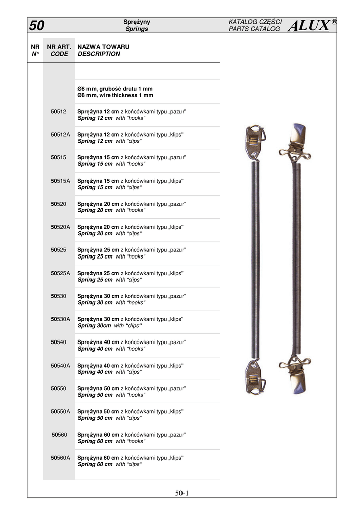 Sprężyny Springs 50 NR N° KATALOG CZĘŚCI PARTS CATALOG NR ART. NAZWA TOWARU CODE DESCRIPTION Ø8 mm, grubość drutu 1 mm Ø8 mm, wire thickness 1 mm 50512 Sprężyna 12 cm z końcówkami typu „pazur” Spring 12 cm with “hooks“ 50512A Sprężyna 12 cm z końcówkami typu „klips” Spring 12 cm with “clips“ 50515 Sprężyna 15 cm z końcówkami typu „pazur” Spring 15 cm with “hooks“ 50515A Sprężyna 15 cm z końcówkami typu „klips” Spring 15 cm with “clips“ 50520 Sprężyna 20 cm z końcówkami typu „pazur” Spring 20 cm with “hooks“ 50520A Sprężyna 20 cm z końcówkami typu „klips” Spring 20 cm with “clips“ 50525 Sprężyna 25 cm z końcówkami typu „pazur” Spring 25 cm with “hooks“ 50525A Sprężyna 25 cm z końcówkami typu „klips” Spring 25 cm with “clips“ 50530 Sprężyna 30 cm z końcówkami typu „pazur” Spring 30 cm with “hooks“ 50530A Sprężyna 30 cm z końcówkami typu „klips” Spring 30cm with “clips“ 50540 Sprężyna 40 cm z końcówkami typu „pazur” Spring 40 cm with “hooks“ 50540A Sprężyna 40 cm z końcówkami typu „klips” Spring 40 cm with “clips“ 50550 Sprężyna 50 cm z końcówkami typu „pazur” Spring 50 cm with “hooks“ 50550A Sprężyna 50 cm z końcówkami typu „klips” Spring 50 cm with “clips“ 50560 Sprężyna 60 cm z końcówkami typu „pazur” Spring 60 cm with “hooks“ 50560A Sprężyna 60 cm z końcówkami typu „klips” Spring 60 cm with “clips“ 50-1 Sprężyny Springs 50 NR N° KATALOG CZĘŚCI PARTS CATALOG NR ART. NAZWA TOWARU CODE DESCRIPTION 50570 Sprężyna 70 cm z końcówkami typu „pazur” Spring 70 cm with “hooks“ 50570A Sprężyna 70 cm z końcówkami typu „klips” Spring 70 cm with “clips“ 50580 Sprężyna 70 cm Spring 70cm Ø6 mm, grubość drutu 0,6 mm Ø6 mm, wire thickness 0,6 mm 50612 Sprężyna 12 cm z końcówkami typu „pazur” Spring 12 cm with “hooks“ 50612A Sprężyna 12 cm z końcówkami typu „klips” Spring 12 cm with “clips“ 50620 Sprężyna 20 cm z końcówkami typu „pazur” Spring 20 cm with “hooks“ 50620A Sprężyna 20 cm z końcówkami typu „klips” Spring 20 cm with “clips“ 50630 Sprężyna 30 cm z końcówkami typu „pazur” Spring 30 cm with “hooks“ 50630A Sprężyna 30 cm z końcówkami typu „klips” Spring 30 cm with “clips“ 50640 Sprężyna 40 cm z końcówkami typu „pazur” Spring 40 cm with “hooks“ 50640A Sprężyna 40 cm z końcówkami typu „klips” Spring 40 cm with “clips“ 50650 Sprężyna 50 cm z końcówkami typu „pazur” Spring 50 cm with “hooks“ 50650A Sprężyna 50 cm z końcówkami typu „klips” Spring 50 cm with “clips“ 50660 Sprężyna 60 cm z końcówkami typu „pazur” Spring 60 cm with “hooks“ 50660A Sprężyna 60 cm z końcówkami typu „klips” Spring 60 cm with “clips“ 50670 Sprężyna 70 cm z końcówkami typu „pazur” Spring 70 cm with “hooks“ 50-2 Sprężyny Springs 50 NR N° KATALOG CZĘŚCI PARTS CATALOG NR ART. NAZWA TOWARU CODE DESCRIPTION 50670A 50680 11 Sprężyna 70 cm z końcówkami typu „klips” Spring 70 cm with “clips“ 11 Sprężyna 70 cm Spring 70 cm Sprężyny do mocowania przewodów Springs for cables średnica sprężyny x średnica drutu x długość spring diameter x wire diameter x lenght 50658 • Ø18 x Ø1 x 100 mm 50660 • Ø18 x Ø1 x 150 mm 50662 • Ø18 x Ø1 x 200 mm 50670 • Ø18 x Ø1 x 300 mm 50675 • Ø18 x Ø1 x 500 mm 50710 • Ø9 x Ø0,7 x250 mm 50720 • Ø9 x Ø0,7 x 500 mm 22 50800 Wieszak sprężynowy do przewodów elektrycznoparowych - mocowanie: śruba M8 Cable support - with central screw M8 Ø4,8 mm x 650 33 50805 Wieszak sprężynowy do przewodów elektrycznoparowych - mocowanie: oczko Ø9 Cable support - with ring Ø9 Ø4,8 mm x 650 44 50807 Wieszak do przewodów elektryczno-parowych Cable support Ø4,5 mm x 560 33 44 55 50810 Wieszak do przewodów elektryczno - parowych Cable support Ø5 mm x 560 55 50860 Końcówki do sprężyn – pazurowe Hook for spring 66 50870 Końcówki do sprężyn – klipsowe Brace's hook for spring 55 66 50-3 22 55