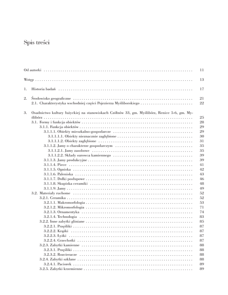 Spis treści Od autorki . . . . . . . . . . . . . . . . . . . . . . . . . . . . . . . . . . . . . . . . . . . . . . . . . . . . . . . . . . . . . . . . . . . . . . . 11 Wstęp . . . . . . . . . . . . . . . . . . . . . . . . . . . . . . . . . . . . . . . . . . . . . . . . . . . . . . . . . . . . . . . . . . . . . . . . . . . 13 1. Historia badań . . . . . . . . . . . . . . . . . . . . . . . . . . . . . . . . . . . . . . . . . . . . . . . . . . . . . . . . . . . . . . . . 17 2. Środowisko geograficzne . . . . . . . . . . . . . . . . . . . . . . . . . . . . . . . . . . . . . . . . . . . . . . . . . . . . . . . . . 2.1. Charakterystyka wschodniej części Pojezierza Myśliborskiego . . . . . . . . . . . . . . . . . . . . . . . . . 21 22 3. Osadnictwo kultury łużyckiej na stanowiskach Czółnów 33, gm. Myślibórz, Renice 5-6, gm. Myślibórz . . . . . . . . . . . . . . . . . . . . . . . . . . . . . . . . . . . . . . . . . . . . . . . . . . . . . . . . . . . . . . . . . . . . . . . 3.1. Formy i funkcja obiektów . . . . . . . . . . . . . . . . . . . . . . . . . . . . . . . . . . . . . . . . . . . . . . . . . . . . . 3.1.1. Funkcja obiektów . . . . . . . . . . . . . . . . . . . . . . . . . . . . . . . . . . . . . . . . . . . . . . . . . . . . . . 3.1.1.1. Obiekty mieszkalno-gospodarcze . . . . . . . . . . . . . . . . . . . . . . . . . . . . . . . . . . . . . . 3.1.1.1.1. Obiekty nieznacznie zagłębione . . . . . . . . . . . . . . . . . . . . . . . . . . . . . . . . . . . . 3.1.1.1.2. Obiekty zagłębione . . . . . . . . . . . . . . . . . . . . . . . . . . . . . . . . . . . . . . . . . . . . . 3.1.1.2. Jamy o charakterze gospodarczym . . . . . . . . . . . . . . . . . . . . . . . . . . . . . . . . . . . . . 3.1.1.2.1. Jamy zasobowe . . . . . . . . . . . . . . . . . . . . . . . . . . . . . . . . . . . . . . . . . . . . . . . . 3.1.1.2.2. Składy surowca kamiennego . . . . . . . . . . . . . . . . . . . . . . . . . . . . . . . . . . . . . . 3.1.1.3. Jamy produkcyjne . . . . . . . . . . . . . . . . . . . . . . . . . . . . . . . . . . . . . . . . . . . . . . . . . . 3.1.1.4. Piece . . . . . . . . . . . . . . . . . . . . . . . . . . . . . . . . . . . . . . . . . . . . . . . . . . . . . . . . . . . 3.1.1.5. Ogniska . . . . . . . . . . . . . . . . . . . . . . . . . . . . . . . . . . . . . . . . . . . . . . . . . . . . . . . . . 3.1.1.6. Paleniska . . . . . . . . . . . . . . . . . . . . . . . . . . . . . . . . . . . . . . . . . . . . . . . . . . . . . . . . 3.1.1.7. Dołki posłupowe . . . . . . . . . . . . . . . . . . . . . . . . . . . . . . . . . . . . . . . . . . . . . . . . . . . 3.1.1.8. Skupiska ceramiki . . . . . . . . . . . . . . . . . . . . . . . . . . . . . . . . . . . . . . . . . . . . . . . . . 3.1.1.9. Jamy . . . . . . . . . . . . . . . . . . . . . . . . . . . . . . . . . . . . . . . . . . . . . . . . . . . . . . . . . . . . 3.2. Materiały ruchome . . . . . . . . . . . . . . . . . . . . . . . . . . . . . . . . . . . . . . . . . . . . . . . . . . . . . . . . . 3.2.1. Ceramika . . . . . . . . . . . . . . . . . . . . . . . . . . . . . . . . . . . . . . . . . . . . . . . . . . . . . . . . . . . . 3.2.1.1. Makromorfologia . . . . . . . . . . . . . . . . . . . . . . . . . . . . . . . . . . . . . . . . . . . . . . . . . . . 3.2.1.2. Mikromorfologia . . . . . . . . . . . . . . . . . . . . . . . . . . . . . . . . . . . . . . . . . . . . . . . . . . . 3.2.1.3. Ornamentyka . . . . . . . . . . . . . . . . . . . . . . . . . . . . . . . . . . . . . . . . . . . . . . . . . . . . . 3.2.1.4. Technologia . . . . . . . . . . . . . . . . . . . . . . . . . . . . . . . . . . . . . . . . . . . . . . . . . . . . . . 3.2.2. Inne zabytki gliniane . . . . . . . . . . . . . . . . . . . . . . . . . . . . . . . . . . . . . . . . . . . . . . . . . . . 3.2.2.1. Przęśliki . . . . . . . . . . . . . . . . . . . . . . . . . . . . . . . . . . . . . . . . . . . . . . . . . . . . . . . . . 3.2.2.2. Krążki . . . . . . . . . . . . . . . . . . . . . . . . . . . . . . . . . . . . . . . . . . . . . . . . . . . . . . . . . . 3.2.2.3. Łyżki . . . . . . . . . . . . . . . . . . . . . . . . . . . . . . . . . . . . . . . . . . . . . . . . . . . . . . . . . . . 3.2.2.4. Grzechotki . . . . . . . . . . . . . . . . . . . . . . . . . . . . . . . . . . . . . . . . . . . . . . . . . . . . . . . 3.2.3. Zabytki kamienne . . . . . . . . . . . . . . . . . . . . . . . . . . . . . . . . . . . . . . . . . . . . . . . . . . . . . 3.2.3.1. Przęśliki . . . . . . . . . . . . . . . . . . . . . . . . . . . . . . . . . . . . . . . . . . . . . . . . . . . . . . . . . 3.2.3.2. Rozcieracze . . . . . . . . . . . . . . . . . . . . . . . . . . . . . . . . . . . . . . . . . . . . . . . . . . . . . . 3.2.4. Zabytki szklane . . . . . . . . . . . . . . . . . . . . . . . . . . . . . . . . . . . . . . . . . . . . . . . . . . . . . . . 3.2.4.1. Paciorek . . . . . . . . . . . . . . . . . . . . . . . . . . . . . . . . . . . . . . . . . . . . . . . . . . . . . . . . . 3.2.5. Zabytki krzemienne . . . . . . . . . . . . . . . . . . . . . . . . . . . . . . . . . . . . . . . . . . . . . . . . . . . . 25 28 29 29 30 31 35 35 39 39 41 42 43 46 48 49 52 52 53 71 74 83 85 87 87 87 87 88 88 88 88 89 89 8 4. Osadnictwo kultury łużyckiej w późnej epoce brązu i wczesnej epoce żelaza we wschodniej części Pojezierza Myśliborskiego Chronologia osadnictwa późnej epoki brązu i wczesnej epoki żelaza we wschodniej części Pojezierza Myśliborskiego . . . . . . . . . . . . . . . . . . . . . . . . . . . . . . . . . . . . . . . . . . . . . . . . . . . . . . . . . . . . . . . . 4.1. Analiza chronologiczna stanowisk „bazowych” . . . . . . . . . . . . . . . . . . . . . . . . . . . . . . . . . . . . 4.1.1. Makromorfologia . . . . . . . . . . . . . . . . . . . . . . . . . . . . . . . . . . . . . . . . . . . . . . . . . . . . . . 4.1.1.1. Garnki . . . . . . . . . . . . . . . . . . . . . . . . . . . . . . . . . . . . . . . . . . . . . . . . . . . . . . . . . . 4.1.1.2. Waz