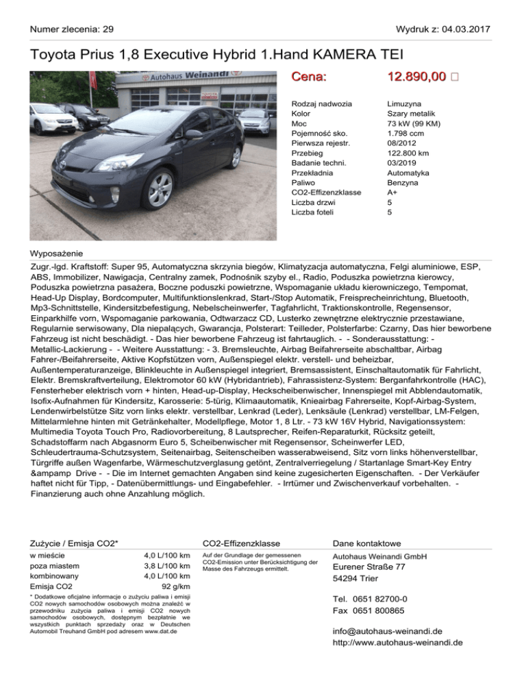 Numer zlecenia: 29 Wydruk z: 04.03.2017 Toyota Prius 1,8 Executive Hybrid 1.Hand KAMERA TEI Cena: 12.890,00 Rodzaj nadwozia Kolor Moc Pojemność sko. Pierwsza rejestr. Przebieg Badanie techni. Przekładnia Paliwo CO2-Effizenzklasse Liczba drzwi Liczba foteli Limuzyna Szary metalik 73 kW (99 KM) 1.798 ccm 08/2012 122.800 km 03/2019 Automatyka Benzyna A+ 5 5 Wyposażenie Zugr.-lgd. Kraftstoff: Super 95, Automatyczna skrzynia biegów, Klimatyzacja automatyczna, Felgi aluminiowe, ESP, ABS, Immobilizer, Nawigacja, Centralny zamek, Podnośnik szyby el., Radio, Poduszka powietrzna kierowcy, Poduszka powietrzna pasażera, Boczne poduszki powietrzne, Wspomaganie układu kierowniczego, Tempomat, Head-Up Display, Bordcomputer, Multifunktionslenkrad, Start-/Stop Automatik, Freisprecheinrichtung, Bluetooth, Mp3-Schnittstelle, Kindersitzbefestigung, Nebelscheinwerfer, Tagfahrlicht, Traktionskontrolle, Regensensor, Einparkhilfe vorn, Wspomaganie parkowania, Odtwarzacz CD, Lusterko zewnętrzne elektrycznie przestawiane, Regularnie serwisowany, Dla niepalących, Gwarancja, Polsterart: Teilleder, Polsterfarbe: Czarny, Das hier beworbene Fahrzeug ist nicht beschädigt. - Das hier beworbene Fahrzeug ist fahrtauglich. - - Sonderausstattung: Metallic-Lackierung - - Weitere Ausstattung: - 3. Bremsleuchte, Airbag Beifahrerseite abschaltbar, Airbag Fahrer-/Beifahrerseite, Aktive Kopfstützen vorn, Außenspiegel elektr. verstell- und beheizbar, Außentemperaturanzeige, Blinkleuchte in Außenspiegel integriert, Bremsassistent, Einschaltautomatik für Fahrlicht, Elektr. Bremskraftverteilung, Elektromotor 60 kW (Hybridantrieb), Fahrassistenz-System: Berganfahrkontrolle (HAC), Fensterheber elektrisch vorn + hinten, Head-up-Display, Heckscheibenwischer, Innenspiegel mit Abblendautomatik, Isofix-Aufnahmen für Kindersitz, Karosserie: 5-türig, Klimaautomatik, Knieairbag Fahrerseite, Kopf-Airbag-System, Lendenwirbelstütze Sitz vorn links elektr. verstellbar, Lenkrad (Leder), Lenksäule (Lenkrad) verstellbar, LM-Felgen, Mittelarmlehne hinten mit Getränkehalter, Modellpflege, Motor 1, 8 Ltr. - 73 kW 16V Hybrid, Navigationssystem: Multimedia Toyota Touch Pro, Radiovorbereitung, 8 Lautsprecher, Reifen-Reparaturkit, Rücksitz geteilt, Schadstoffarm nach Abgasnorm Euro 5, Scheibenwischer mit Regensensor, Scheinwerfer LED, Schleudertrauma-Schutzsystem, Seitenairbag, Seitenscheiben wasserabweisend, Sitz vorn links höhenverstellbar, Türgriffe außen Wagenfarbe, Wärmeschutzverglasung getönt, Zentralverriegelung / Startanlage Smart-Key Entry &amp Drive - - Die im Internet gemachten Angaben sind keine zugesicherten Eigenschaften. - Der Verkäufer haftet nicht für Tipp, - Datenübermittlungs- und Eingabefehler. - Irrtümer und Zwischenverkauf vorbehalten. Finanzierung auch ohne Anzahlung möglich. Zużycie / Emisja CO2* w mieście poza miastem kombinowany Emisja CO2 4,0 L/100 km 3,8 L/100 km 4,0 L/100 km 92 g/km * Dodatkowe oficjalne informacje o zużyciu paliwa i emisji CO2 nowych samochodów osobowych można znaleźć w przewodniku zużycia paliwa i emisji CO2 nowych samochodów osobowych, dostępnym bezpłatnie we wszystkich punktach sprzedaży oraz w Deutschen Automobil Treuhand GmbH pod adresem www.dat.de CO2-Effizenzklasse Dane kontaktowe Auf der Grundlage der gemessenen CO2-Emission unter Berücksichtigung der Masse des Fahrzeugs ermittelt. Autohaus Weinandi GmbH Eurener Straße 77 54294 Trier Tel. 0651 82700-0 Fax 0651 800865 [email protected] http://www.autohaus-weinandi.de Numer zlecenia: 29 Wydruk z: 04.03.2017 Toyota Prius 1,8 Executive Hybrid 1.Hand KAMERA TEI Numer zlecenia: 29 Wydruk z: 04.03.2017 Toyota Prius 1,8 Executive Hybrid 1.Hand KAMERA TEI Numer zlecenia: 29 Wydruk z: 04.03.2017 Toyota Prius 1,8 Executive Hybrid 1.Hand KAMERA TEI