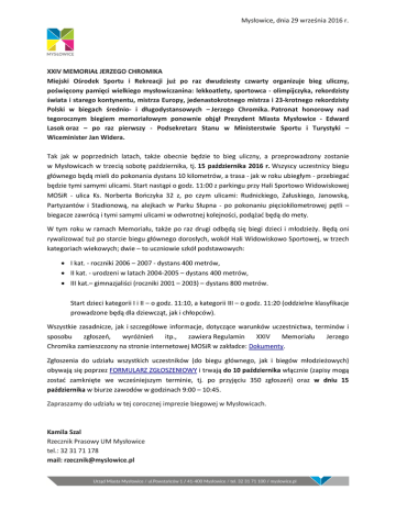 Mysłowice, dnia 29 września 2016 r. XXIV MEMORIAŁ JERZEGO CHROMIKA Miejski Ośrodek Sportu i Rekreacji już po raz dwudziesty czwarty organizuje bieg uliczny, poświęcony pamięci wielkiego mysłowiczanina: lekkoatlety, sportowca - olimpijczyka, rekordzisty świata i starego kontynentu, mistrza Europy, jedenastokrotnego mistrza i 23-krotnego rekordzisty Polski w biegach średnio- i długodystansowych – Jerzego Chromika. Patronat honorowy nad tegorocznym biegiem memoriałowym ponownie objął Prezydent Miasta Mysłowice - Edward Lasok oraz – po raz pierwszy - Podsekretarz Stanu w Ministerstwie Sportu i Turystyki – Wiceminister Jan Widera. Tak jak w poprzednich latach, także obecnie będzie to bieg uliczny, a przeprowadzony zostanie w Mysłowicach w trzecią sobotę października, tj. 15 października 2016 r. Wszyscy uczestnicy biegu głównego będą mieli do pokonania dystans 10 kilometrów, a trasa - jak w roku ubiegłym - przebiegać będzie tymi samymi ulicami. Start nastąpi o godz. 11:00 z parkingu przy Hali Sportowo Widowiskowej MOSiR - ulica Ks. Norberta Bończyka 32 z, po czym ulicami: Rudnickiego, Załuskiego, Janowską, Partyzantów i Stadionową, na alejkach w Parku Słupna - po pokonaniu pięciokilometrowej pętli – biegacze zawrócą i tymi samymi ulicami w odwrotnej kolejności, podążać będą do mety. W tym roku w ramach Memoriału, także po raz drugi odbędą się biegi dzieci i młodzieży. Będą oni rywalizować tuż po starcie biegu głównego dorosłych, wokół Hali Widowiskowo Sportowej, w trzech kategoriach wiekowych; dwie – to uczniowie szkół podstawowych: I kat. - roczniki 2006 – 2007 - dystans 400 metrów, II kat. - urodzeni w latach 2004-2005 – dystans 400 metrów, III kat.– gimnazjaliści (roczniki 2001 – 2003) – dystans 800 metrów. Start dzieci kategorii I i II – o godz. 11:10, a kategorii III – o godz. 11:20 (oddzielne klasyfikacje prowadzone będą dla dziewcząt, jak i chłopców). Wszystkie zasadnicze, jak i szczegółowe informacje, dotyczące warunków uczestnictwa, terminów i sposobu zgłoszeń, wyróżnień itp., zawiera Regulamin XXIV Memoriału Jerzego Chromika zamieszczony na stronie internetowej MOSiR w zakładce: Dokumenty. Zgłoszenia do udziału wszystkich uczestników (do biegu głównego, jak i biegów młodzieżowych) obywają się poprzez FORMULARZ ZGŁOSZENIOWY i trwają do 10 października włącznie (zapisy mogą zostać zamknięte we wcześniejszym terminie, tj. po przyjęciu 350 zgłoszeń) oraz w dniu 15 października w biurze zawodów w godzinach 9:00 – 10:45. Zapraszamy do udziału w tej corocznej imprezie biegowej w Mysłowicach. Kamila Szal Rzecznik Prasowy UM Mysłowice tel.: 32 31 71 178 mail: [email protected]