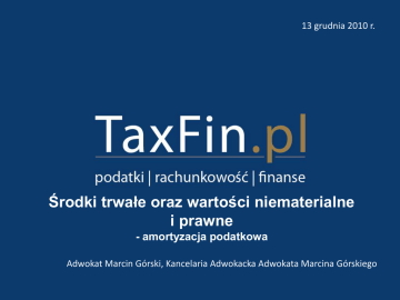 13 grudnia 2010 r. Środki trwałe oraz wartości niematerialne i prawne - amortyzacja podatkowa Adwokat Marcin Górski, Kancelaria Adwokacka Adwokata Marcina Górskiego Definicja środków trwałych Zgodnie z art. 16a UPDOP, środki trwałe to stanowiące własność lub współwłasność podatnika, nabyte lub wytworzone we własnym zakresie, kompletne i zdatne do użytku w dniu przyjęcia do używania: 1) budowle, budynki oraz lokale będące odrębną własnością, 2) maszyny, urządzenia i środki transportu, 3) inne przedmioty – o przewidywanym okresie używania dłuższym niż rok, wykorzystywane przez podatnika na potrzeby związane z prowadzoną przez niego działalnością gospodarczą albo oddane do używania na podstawie umowy najmu, dzierżawy lub leasingu. 2 Definicja środków trwałych Amortyzacji podlegają również, niezależnie od przewidywanego okresu używania: 1) przyjęte do używania inwestycje w obcych środkach trwałych, 2) budynki i budowle wybudowane na cudzym gruncie, 3) składniki majątku niestanowiące własności lub współwłasności podatnika, wykorzystywane przez niego na potrzeby związane z prowadzoną działalnością gospodarczą na podstawie umowy leasingu, zawartej z właścicielem lub współwłaścicielem tych składników jeżeli odpisów amortyzacyjnych dokonuje korzystający. 3 Definicja w interpretacjach organów podatkowych Dyrektor Izby Skarbowej w Bydgoszczy w interpretacji indywidualnej z dnia 9 marca 2010 r. (nr ITPB3/423-768/09/AM) „(…) należy stwierdzić, iż samochód demonstracyjny (testowy) lub zastępczy, aby spełniał swe cele (również te dodatkowe – sporadyczne – wymienione we wniosku) musi zostać zarejestrowany i ubezpieczony. Co więcej, pełniąc funkcje pojazdu testowego lub zastępczego jest bezpośrednio wykorzystywany przez Spółkę w jej działalności gospodarczej. Nie ma więc przy tym znaczenia okoliczność jego sporadycznego używania do celów służbowych, czy innych wskazanych we wniosku. Spełnia on tym samym wszystkie przesłanki uznania go za środek trwały zgodnie z dyspozycją art. 16a ust. 1 ustawy. Skoro zatem przedmiotowy samochód nie został wprowadzony do ewidencji środków trwałych w momencie oddania go do używania (np. z powodu planowanej sprzedaży przed upływem roku), a faktyczny okres jego użytkowania przekroczył rok, Spółka ma obowiązek zaliczenia tego składnika do ewidencji środków trwałych. Wprowadzenie tego składnika do ewidencji środków trwałych po upływie tego okresu należy uznać za ujawnienie środka, o którym mowa w art. 16h ust. 1 pkt 4 ustawy. W myśl tego unormowania, odpisów amortyzacyjnych dokonuje się od ujawnionych środków trwałych lub wartości niematerialnych i prawnych nieobjętych dotychczas ewidencją, począwszy od miesiąca następującego po miesiącu, w którym te środki lub wartości zostały wprowadzone do ewidencji środków trwałych oraz wartości niematerialnych i prawnych.(…)” 4 Definicja wartości niematerialnych i prawnych Zgodnie z art. 16b UPDOP, wartości niematerialne i prawne to nabyte nadające się do gospodarczego wykorzystania w dniu przyjęcia do używania: 1) spółdzielcze własnościowe prawo do lokalu mieszkalnego, 2) spółdzielcze prawo do lokalu użytkowego, 3) prawo do domu jednorodzinnego w spółdzielni mieszkaniowej, 4) autorskie lub pokrewne prawa majątkowe, 5) licencje, 6) prawa do: wynalazków, patentów, znaków towarowych, wzorów użytkowych, wzorów zdobniczych, 7) wartośd stanowiącą równowartośd uzyskanych informacji związanych z wiedzą w dziedzinie przemysłowej, handlowej, naukowej lub organizacyjnej (know – how) – o przewidywanym okresie używania dłuższym niż rok, wykorzystywane przez podatnika na potrzeby związane z prowadzoną przez niego działalnością gospodarczą albo oddane przez niego do używania na podstawie umowy licencyjnej (sublicencji) umowy najmu, dzierżawy lub umowy licencyjnej. 5 Definicja wartości niematerialnych i prawnych Amortyzacji podlegają również niezależnie od przewidywanego okresu używania: 1)wartość firmy, jeżeli wartośd ta powstała w wyniku nabycia przedsiębiorstwa lub jego zorganizowanej części w drodze: a)kupna, b)przyjęcia do odpłatnego korzystania na podstawie tzw. umowy leasingu finansowego, c)wniesienia do spółki na podstawie przepisów o komercjalizacji i prywatyzacji. 6 Definicja wartości niematerialnych i prawnych Wartośd początkową firmy stanowi dodatnia różnica między ceną nabycia przedsiębiorstwa lub jego zorganizowanej części albo nominalną wartością wydanych akcji lub udziałów w zamian za wkład niepieniężny a wartością rynkową składników majątkowych wchodzących w skład kupionego, przyjętego do odpłatnego korzystania albo wniesionego do spółki przedsiębiorstwa lub jego zorganizowanej części, odpowiednio z dnia kupna, przyjęcia do odpłatnego korzystania albo wniesienia do spółki. 7 Definicja wartości niematerialnych i prawnych W razie nabycia w drodze kupna lub przyjęcia do odpłatnego korzystania przedsiębiorstwa lub jego zorganizowanej części, łączną wartośd początkową nabytych środków trwałych oraz wartości niematerialnych i prawnych stanowi: 1) suma ich wartości rynkowej - w przypadku wystąpienia dodatniej wartości firmy, 2) różnica między ceną nabycia przedsiębiorstwa lub jego zorganizowanej części, a wartością składników majątkowych niebędących środkami trwałymi ani wartościami niematerialnymi i prawnymi - w przypadku niewystąpienia dodatniej wartości firmy. 8 Definicja wartości niematerialnych i prawnych 2) koszty prac rozwojowych zakooczone wynikiem pozytywnym, który może byd wykorzystany na potrzeby działalności gospodarczej podatnika, jeżeli: a) produkt lub technologia wytwarzania są ściśle ustalone, a dotyczące ich koszty prac rozwojowych wiarygodnie określone, oraz b) techniczna przydatnośd produktu lub tech