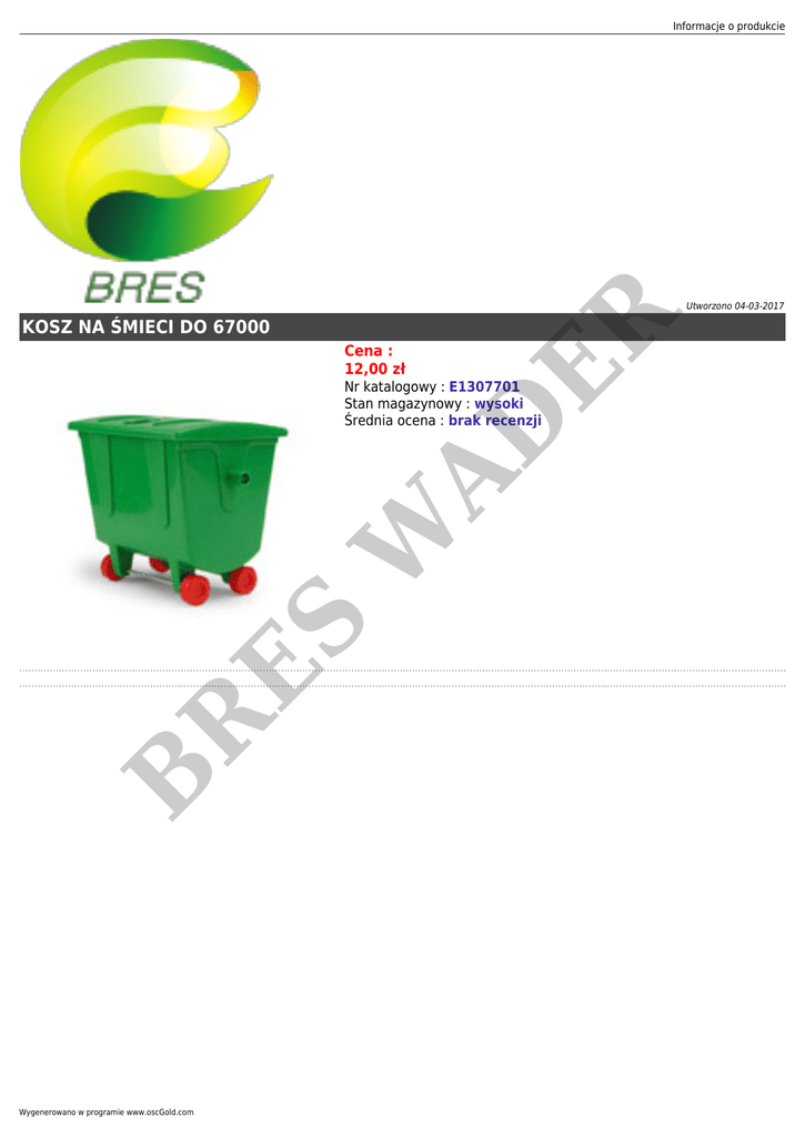 Informacje o produkcie KOSZ NA ŚMIECI DO 67000 Cena : 12,00 zł ER Utworzono 04-03-2017 B R ES W AD Nr katalogowy : E1307701 Stan magazynowy : wysoki Średnia ocena : brak recenzji Wygenerowano w programie www.oscGold.com