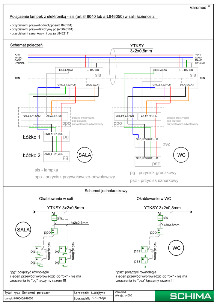 Varomed Połączenie lampek z elektroniką - sls (art.846040 lub art.846050) w sali i łazience z: - przyciskami przywoł-odwoł ppo (art. 846181) - przyciskami przywoławczymy pp (art.846101) - przyciskami sznurkowymi psz (art.846211) Schemat połączeń YTKSY 3x2x0,8mm +24V MASA DANE SYGNAŁ +24V MASA DANE SYGNAŁ +, -, DA, SIG E3,E4,A0,A5 +, -, DA, SIG E3,E4,A0,A5 sls TON GND,E1,E2,+Ub +Ub,E1,A1,GND A0,A2,E2,+Ub ppo Łóżko 1 GND,A1,E1,+Ub sls GND,E1,E2,+Ub E0,A3,A2,A1 puszka elektryczna pod przycisk przywoławczo-odwoławczy +Ub,E1,A1,GND A0,A2,E2,+Ub ppo pg E0,A3,A2,A1 puszka elektryczna pod przycisk przywoławczo-odwoławczy GND,LED,RUF,+UB psz Łóżko 2 GND,A1,E1,+Ub pg SALA WC GND,LED,RUF,+UB psz sls - lampka pg - przycisk gruszkowy ppo - przycisk przywoławczo-odwoławczy psz - przycisk sznurkowy Schemat jednokreskowy Okablowanie w sali Okablowanie w WC YTKSY 3x2x0,8mm YTKSY 3x2x0,8mm SALA WC "pg" połączyć równolegle i jeden przewód wyprowadzić do "pk" - nie ma znaczenia ile "pg" łączymy razem !!! "psz" połączyć równolegle i jeden przewód wyprowadzić do "pk" - nie ma znaczenia ile "psz" łączymy razem !!! Varomed Wersja: v4000 Lampki 846040/846050 TON ®