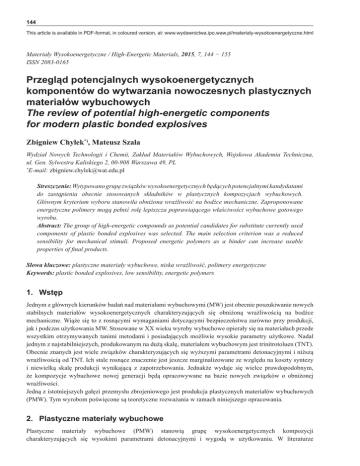 144 Z. Chyłek, M. Szala This article is available in PDF-format, in coloured version, at: www.wydawnictwa.ipo.waw.pl/materialy-wysokoenergetyczne.html Materiały Wysokoenergetyczne / High-Energetic Materials, 2015, 7, 144 − 155 ISSN 2083-0165 Przegląd potencjalnych wysokoenergetycznych komponentów do wytwarzania nowoczesnych plastycznych materiałów wybuchowych The review of potential high-energetic components for modern plastic bonded explosives Zbigniew Chyłek*), Mateusz Szala Wydział Nowych Technologii i Chemii, Zakład Materiałów Wybuchowych, Wojskowa Akademia Techniczna, ul. Gen. Sylwestra Kaliskiego 2, 00-908 Warszawa 49, PL * E-mail: [email protected] Streszczenie: Wytypowano grupę związków wysokoenergetycznych będących potencjalnymi kandydatami do zastąpienia obecnie stosowanych składników w plastycznych kompozycjach wybuchowych. Głównym kryterium wyboru stanowiła obniżona wrażliwość na bodźce mechaniczne. Zaproponowane energetyczne polimery mogą pełnić rolę lepiszcza poprawiającego właściwości wybuchowe gotowego wyrobu. Abstract: The group of high-energetic compounds as potential candidates for substitute currently used components of plastic bonded explosives was selected. The main selection criterion was a reduced sensibility for mechanical stimuli. Proposed energetic polymers as a binder can increase usable properties of final products. Słowa kluczowe: plastyczne materiały wybuchowe, niska wrażliwość, polimery energetyczne Keywords: plastic bonded explosives, low sensibility, energetic polymers 1. Wstęp Jednym z głównych kierunków badań nad materiałami wybuchowymi (MW) jest obecnie poszukiwanie nowych stabilnych materiałów wysokoenergetycznych charakteryzujących się obniżoną wrażliwością na bodźce mechaniczne. Wiąże się to z rosnącymi wymaganiami dotyczącymi bezpieczeństwa zarówno przy produkcji, jak i podczas użytkowania MW. Stosowane w XX wieku wyroby wybuchowe opierały się na materiałach przede wszystkim otrzymywanych tanimi metodami i posiadających możliwie wysokie parametry użytkowe. Nadal jednym z najstabilniejszych, produkowanym na dużą skalę, materiałem wybuchowym jest trinitrotoluen (TNT). Obecnie znanych jest wiele związków charakteryzujących się wyższymi parametrami detonacyjnymi i niższą wrażliwością od TNT. Ich stale rosnące znaczenie jest jeszcze marginalizowane ze względu na koszty syntezy i niewielką skalę produkcji wynikającą z zapotrzebowania. Jednakże wydaje się wielce prawdopodobnym, że kompozycje wybuchowe nowej generacji będą opracowywane na bazie nowych związków o obniżonej wrażliwości. Jedną z istotniejszych gałęzi przemysłu zbrojeniowego jest produkcja plastycznych materiałów wybuchowych (PMW). Tym wyrobom poświęcone są teoretyczne rozważania w ramach niniejszego opracowania. 2. Plastyczne materiały wybuchowe Plastyczne materiały wybuchowe (PMW) stanowią grupę wysokoenergetycznych kompozycji charakteryzujących się wysokimi parametrami detonacyjnymi i wygodą w użytkowaniu. W literaturze Przegląd potencjalnych wysokoenergetycznych komponentów do wytwarzania nowoczesnych... 145 This article is available in PDF-format, in coloured version, at: www.wydawnictwa.ipo.waw.pl/materialy-wysokoenergetyczne.html anglojęzycznej występują pod zbiorczą nazwą PBX (ang. plastic bonded explosives) i najczęściej dotyczą materiałów wybuchowych domieszkowanych lepiszczem polimerowym w ilości od kilku do kilkudziesięciu procent. W stałej temperaturze, zależnie do składu ilościowego, otrzymywane kompozycje zmieniają swoje właściwości reologiczne (tzn. plastyczność), co skutkuje również osiąganiem różnych właściwości użytkowych [1]. Z kolei w szerokim zakresie temperatur konsystencja PBX o typowych właściwościach termoplastu może zmieniać się od plastycznej, aż do ciała stałego. Zastosowanie PMW umożliwia formowanie ładunków o dowolnym kształcie i wielkości, co pozwala na modyfikację ich oddziaływania wybuchowego zgodnie z ustalonymi potrzebami. Bardzo cenną cechą takich kompozycji jest możliwość detonowania ładunków o niewielkich średnicach, rzędu kilku milimetrów. Jest to możliwe dzięki stosowaniu silnych materiałów wybuchowych o odpowiednich właściwościach. Najczęściej stosowanymi w kompozycjach PMW związkami wysokoenergetycznymi są: pentryt (PETN), heksogen (RDX) i oktogen (HMX). Ich cechą wspólną są wysokie parametry detonacyjne, niska średnica krytyczna, ale także dość wysoka wrażliwość na bodźce mechaniczne. Dodatek polimeru powoduje obniżenie wrażliwości kompozycji lecz jednocześnie wydatnie obniża parametry użytkowe [2]. W ramach niniejszego opracowania podjęto się wytypowania kliku związków wybuchowych, oraz polimerów wysokoenergetycznych, które w przyszłości mogą być wykorzystane do wyrobu nowoczesnych kompozycji wybuchowych, w tym również PMW. Przypuszcza się, że dobranie odpowiednich proporcji ilościowych i składu jakościowego umożliwi w przyszłości uruchomienie produkcji wyrobów plastycznych o wysokich własnościach użytkowych i ekstremalnie niskiej podatności na przypadkowe pobudzenie. 3. Wybrane komponenty nowoczesnych PMW Idąc naprzeciw obowiązującym trendom poszukiwania i badania bezpiecznych kompozycji wybuchowych o obniżonej wrażliwości na bodźce mechaniczne, przedstawiono poniżej kilka związków wysokoenergetycznych, które potencjalnie mogą posłużyć do wyrobu nowoczesnych plastycznych mieszanin wybuchowych. Oprócz klasycznych krystalicznych materiałów wybuchowych przedstawiono również przykłady energetycznych polimerów, które z powodzeniem mogą służyć jako lepiszcza w kompozycjach nowej generacji. 3.1.Materiały wybuchowe o obniżonej wrażliwości 3.1.1. 1,1-Diamino-2,2-dinitroeten 1,1-Diamino-2,2-dinitroeten, materiał znany jako FOX-7 lub DADNE, po raz pierwszy został opisany w pracy [3]. Jest obecnie 