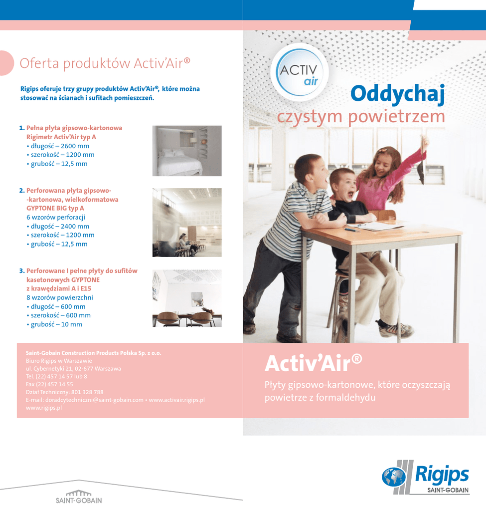 Oferta produktów Activ’Air® Rigips oferuje trzy grupy produktów Activ’Air®, które można stosować na ścianach i sufitach pomieszczeń. 1. Pełna płyta gipsowo-kartonowa Rigimetr Activ’Air typ A • długość – 2600 mm • szerokość – 1200 mm • grubość – 12,5 mm Oddychaj czystym powietrzem 2. Perforowana płyta gipsowo-kartonowa, wielkoformatowa GYPTONE BIG typ A 6 wzorów perforacji • długość – 2400 mm • szerokość – 1200 mm • grubość – 12,5 mm 3. Perforowane I pełne płyty do sufitów kasetonowych GYPTONE z krawędziami A i E15 8 wzorów powierzchni • długość – 600 mm • szerokość – 600 mm • grubość – 10 mm Saint-Gobain Construction Products Polska Sp. z o.o. Biuro Rigips w Warszawie ul. Cybernetyki 21, 02-677 Warszawa Tel. (22) 457 14 57 lub 8 Fax (22) 457 14 55 Dział Techniczny: 801 328 788 E-mail: [email protected] • www.activair.rigips.pl www.rigips.pl Activ’Air® Płyty gipsowo-kartonowe, które oczyszczają powietrze z formaldehydu Zadbaj o czyste powietrze w pomieszczeniu Współczesny człowiek spędza około 80 procent czasu wewnątrz pomieszczeń – w nich pracujemy, uczymy się, odpoczywamy i śpimy. Jakość powietrza w pomieszczeniach, w których przebywamy ma kolosalny wpływ na nasze samopoczucie i zdrowie. Zbyt duża zawartość zanieczyszczeń, a zwłaszcza niebezpiecznych związków organicznych w powietrzu, może być przyczyną przemęczenia, senności, irytacji, powodować alergie i podrażnienia, a nawet być przyczyną groźnych chorób, zwłaszcza w przypadku dzieci. Jednym z najgroźniejszych, a zarazem najczęściej występujących związków organicznych w powietrzu, jest formaldehyd – substancja uznana przez Światową Organizację Zdrowia za rakotwórczą. W naszym otoczeniu dość powszechne są źródła formaldehydu: materiały budowlane zawierające żywicę lub drewno, meble wykonane z płyt wiórowych, wykładziny podłogowe, farby i lakiery, środki chemiczne, a nawet kolorowe czasopisma. Jak wykazały badania, stężenia formaldehydu w Polsce często przekraczały dopuszczalne normy. Dlatego Rigips oferuje płyty gipsowo-kartonowe, Activ’Air®, które mają zdolność trwałego oczyszczania powietrza z formaldehydu. Gdzie warto stosować produkty Activ’Air®? Produkty Activ’Air® zalecane są szczególnie do ochrony powietrza w pomieszczeniach, w których na stałe lub dłuższy czas przebywają dzieci lub osoby starsze. Pomieszczenia z niską skutecznością wentylacji oraz z nowym wyposażeniem (meble, wykładziny) są bardzo narażone na obecność formaldehydu. Dlatego rekomendujemy stosowanie płyt Activ’Air® w takich pomieszczeniach, jak: • sale chorych w szpitalach • gabinety w szpitalach o wydłużonym czasie przebywania chorych • klasy szkolne • przedszkola i żłobki • pokoje hotelowe • pokoje pracy biurowej • wszystkie pomieszczenia mieszkalne • inne pomieszczenia przeznaczone na pobyt ludzi dłuższy niż 2 godziny Czym jest Activ’Air®? Activ’Air® to wyjątkowa właściwość płyt gipsowo-kartonowych. Ich rdzeń zawiera specjalny dodatek, który wychwytuje z powietrza wolny formaldehyd oraz wiele innych zanieczyszczeń organicznych i przekształca je w stabilne i obojętne związki. Zostało udowodnione zmniejszenie stężenia formaldehydu o co najmniej 70 procent. Nie występuje efekt emisji wtórnej (z powrotem do powietrza), a działanie jest zapewnione przez minimum 50 lat, nawet po pomalowaniu płyty. Dodatek ten nie zmienia innych własności płyt g-k. Zatrzymanie formaldehydu Przetworzenie formaldehydu w trwały i obojętny związek Brak reemisji formaldehydu i innych zanieczyszczeń Activ’Air® w pigułce • absorbuje formaldehyd i oczyszcza powietrze • zmniejsza stężenie formaldehydu w pomieszczeniu o 70 procent • nie dopuszcza do reemisji formaldehydu • działa po pomalowaniu (np. farbami akrylowymi i innymi przepuszczającymi parę wodną) • działa długo, minimum 50 lat Zadbaj o czyste powietrze w pomieszczeniu Współczesny człowiek spędza około 80 procent czasu wewnątrz pomieszczeń – w nich pracujemy, uczymy się, odpoczywamy i śpimy. Jakość powietrza w pomieszczeniach, w których przebywamy ma kolosalny wpływ na nasze samopoczucie i zdrowie. Zbyt duża zawartość zanieczyszczeń, a zwłaszcza niebezpiecznych związków organicznych w powietrzu, może być przyczyną przemęczenia, senności, irytacji, powodować alergie i podrażnienia, a nawet być przyczyną groźnych chorób, zwłaszcza w przypadku dzieci. Jednym z najgroźniejszych, a zarazem najczęściej występujących związków organicznych w powietrzu, jest formaldehyd – substancja uznana przez Światową Organizację Zdrowia za rakotwórczą. W naszym otoczeniu dość powszechne są źródła formaldehydu: materiały budowlane zawierające żywicę lub drewno, meble wykonane z płyt wiórowych, wykładziny podłogowe, farby i lakiery, środki chemiczne, a nawet kolorowe czasopisma. Jak wykazały badania, stężenia formaldehydu w Polsce często przekraczały dopuszczalne normy. Dlatego Rigips oferuje płyty gipsowo-kartonowe, Activ’Air®, które mają zdolność trwałego oczyszczania powietrza z formaldehydu. Gdzie warto stosować produkty Activ’Air®? Produkty Activ’Air® zalecane są szczególnie do ochrony powietrza w pomieszczeniach, w których na stałe lub dłuższy czas przebywają dzieci lub osoby starsze. Pomieszczenia z niską skutecznością wentylacji oraz z nowym wyposażeniem (meble, wykładziny) są bardzo narażone na obecność formaldehydu. Dlatego rekomendujemy stosowanie płyt Activ’Air® w takich pomieszczeniach, jak: • sale chorych w szpitalach • gabinety w szpitalach o wydłużonym czasie przebywania chorych • klasy szkolne • przedszkola i żłobki • pokoje hotelowe • pokoje pracy biurowej • wszystkie pomieszczenia mieszkalne • inne pomieszczenia przeznaczone na pobyt ludzi dłuższy n