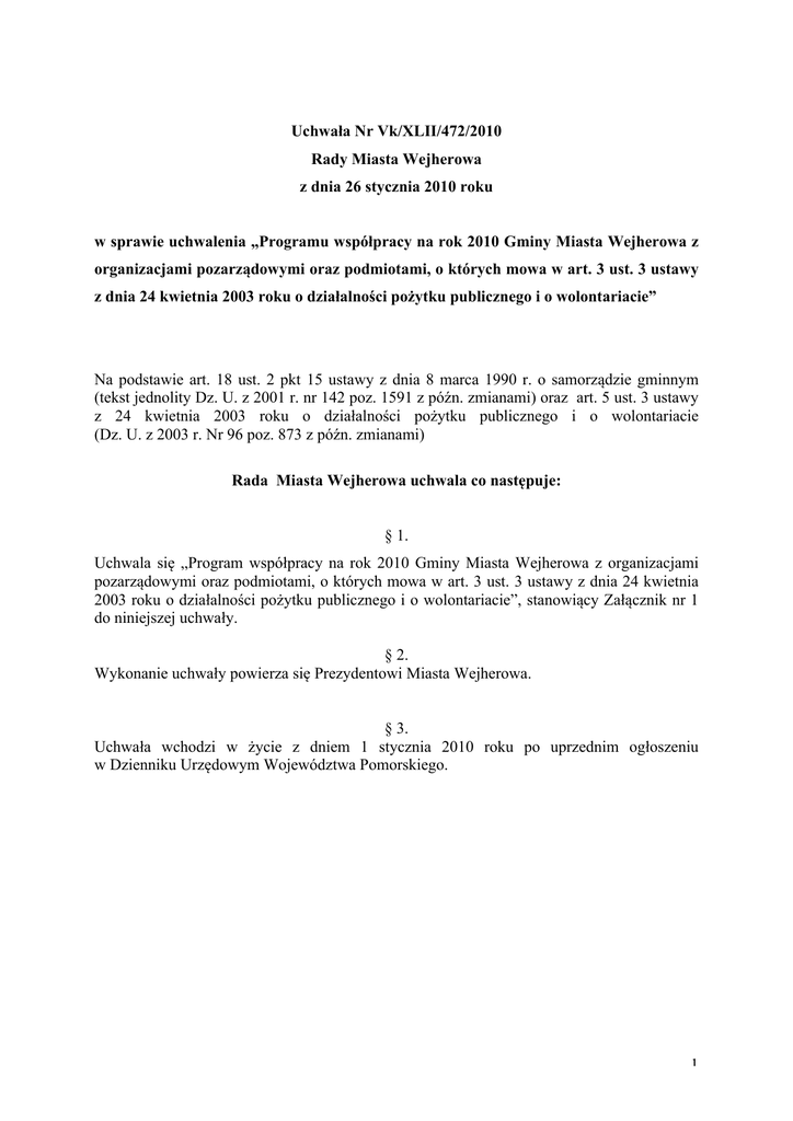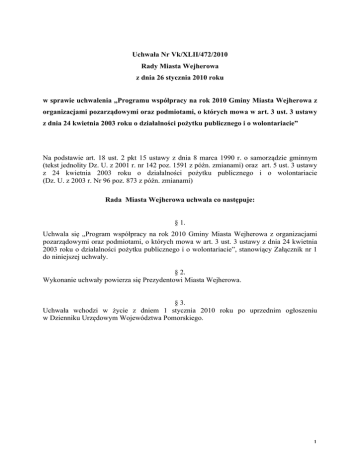 Uchwała Nr Vk/XLII/472/2010 Rady Miasta Wejherowa z dnia 26 stycznia 2010 roku w sprawie uchwalenia „Programu współpracy na rok 2010 Gminy Miasta Wejherowa z organizacjami pozarządowymi oraz podmiotami, o których mowa w art. 3 ust. 3 ustawy z dnia 24 kwietnia 2003 roku o działalności pożytku publicznego i o wolontariacie” Na podstawie art. 18 ust. 2 pkt 15 ustawy z dnia 8 marca 1990 r. o samorządzie gminnym (tekst jednolity Dz. U. z 2001 r. nr 142 poz. 1591 z późn. zmianami) oraz art. 5 ust. 3 ustawy z 24 kwietnia 2003 roku o działalności pożytku publicznego i o wolontariacie (Dz. U. z 2003 r. Nr 96 poz. 873 z późn. zmianami) Rada Miasta Wejherowa uchwala co następuje: § 1. Uchwala się „Program współpracy na rok 2010 Gminy Miasta Wejherowa z organizacjami pozarządowymi oraz podmiotami, o których mowa w art. 3 ust. 3 ustawy z dnia 24 kwietnia 2003 roku o działalności pożytku publicznego i o wolontariacie”, stanowiący Załącznik nr 1 do niniejszej uchwały. § 2. Wykonanie uchwały powierza się Prezydentowi Miasta Wejherowa. § 3. Uchwała wchodzi w życie z dniem 1 stycznia 2010 roku po uprzednim ogłoszeniu w Dzienniku Urzędowym Województwa Pomorskiego. 1 Uzasadnienie do uchwały. W wykonaniu postanowień przepisu, zawartego w ustawie z dnia 24 kwietnia 2003 roku o działalności pożytku publicznego i o wolontariacie Rada Miasta Wejherowa uchwala Program współpracy z organizacjami pozarządowymi na rok 2010. U podłoża niniejszego Programu współpracy leży przekonanie władz miasta Wejherowa o konieczności wspierania wszelkich form aktywności społecznej mieszkańców. Nakreślenie jasnych i czytelnych rozwiązań dotyczących współdziałania realnie zwiększy udział podmiotów prowadzących działalność pożytku publicznego w rozwiązywaniu lokalnych problemów. Niniejszy dokument jest wyrazem zaangażowania władz Gminy Miasta Wejherowa oraz działających na terenie Wejherowa organizacji pozarządowych w stworzenie warunków do prowadzenia nowatorskich i bardziej efektywnych działań na rzecz lokalnej społeczności. Wskazano w nim priorytetowe obszary współpracy oraz zasady udziału organizacji pozarządowych w działaniach programowych samorządu. W ten sposób Program Współpracy realizuje założenia art. 5 ust. 3 przywołanej wyżej ustawy. 2 Załącznik nr 1do uchwały ……………………….. Rady Miasta Wejherowa z dnia…………………. „Program współpracy na rok 2010 Gminy Miasta Wejherowa z organizacjami pozarządowymi oraz podmiotami, o których mowa w art. 3 ust. 3 ustawy z dnia 24 kwietnia 2003 roku o działalności pożytku publicznego i o wolontariacie” Wstęp Przyjmując niniejszy dokument władze Gminy Miasta Wejherowa deklarują wolę kształtowania współpracy z organizacjami pozarządowymi. Nadrzędnym celem Programu współpracy jest wspieranie wszelkich form aktywności społecznej mieszkańców Wejherowa oraz stworzenie warunków do kształtowania prawidłowych relacji między społeczeństwem a władzą samorządową. Sprawna współpraca z ww. podmiotami, oparta na zasadach pomocniczości, suwerenności stron, partnerstwa, uczciwej konkurencji, efektywności i jawności, przyczyni się do prowadzenia nowatorskich i bardziej efektywnych działań na rzecz mieszkańców. Konsultowanie niniejszego Programu z organizacjami pozarządowymi powoduje, że jego zapisy stają się wyrazem zaangażowania dwóch stron zmierzających do prowadzenia nowatorskich i bardziej efektywnych działań na rzecz lokalnej społeczności a w konsekwencji do rozwoju Wejherowa i poprawy warunków życia jej mieszkańców. Priorytetami współpracy w roku 2010 będą: zwiększenie aktywności społecznej wejherowian, poprawa jakości życia mieszkańców poprzez pełniejsze zaspokojenie potrzeb społecznych, wzmacnianie mechanizmów współpracy samorządu i organizacji pozarządowych, przeciwdziałanie uzależnieniom i patologiom społecznym, zaktywizowanie dzieci i młodzieży, zaktywizowanie działalności kulturalnej i sportowo - rekreacyjnej, stwarzanie warunków do lepszego wykorzystania tradycji regionalnej, historii, zabytków miasta, między innymi dla rozwoju turystyki, wspomaganie działalności nowopowstałych organizacji. Roczny Program współpracy został opracowany w oparciu o ustawę z dnia 24 kwietnia 2003 roku o działalności pożytku i o wolontariacie oraz Strategię Rozwoju Miasta Wejherowa. 3 Rozdział 1 Podmioty programu współpracy Program dotyczy prowadzących swoją działalność na terenie Wejherowa lub dla jego mieszkańców (bez względu na siedzibę): 1. organizacji pozarządowych, 2. oraz podmiotów, o których mowa w art. 3 ust. 3 ustawy z dnia 24 kwietnia 2003 roku o działalności pożytku publicznego i o wolontariacie. Rozdział 2 Formy współpracy Współpraca między Gminą Miasta Wejherowa a podmiotami określonymi w Rozdziale 1 niniejszego Programu odbywa się w szczególności w formach: 1. zlecania zadań publicznych na zasadach określonych w ustawie z dnia 24 kwietnia 2003 r. o działalności pożytku publicznego i o wolontariacie oraz uchwale nr IVk/XVII/2233/2004 Rady Miasta Wejherowa z dnia 6 kwietnia 2004 roku w sprawie określenia trybu postępowania o udzielenie dotacji z budżetu Gminy Miasta Wejherowa podmiotom nie zaliczanym do sektora finansów publicznych, realizującym zadania zlecone z zakresu zadań publicznych należących do Gminy, 2. pomocy w nawiązywaniu kontaktów międzynarodowych, 3. współpracy w zakresie pozyskiwania środków finansowych z innych źródeł, w szczególności z funduszy Unii Europejskiej, 4. wzajemnego informowania się o kierunkach działalności, 5. udziału przedstawicieli organizacji pozarządowych oraz podmiotów określonych w art. 3 ust. 3 ustawy z dnia 24 kwietnia 2003 r. o działalności pożytku publicznego i o wolontariacie w szeroko pojętych działaniach struktur samorządowych, 6. realizacji wspólnych projektów i