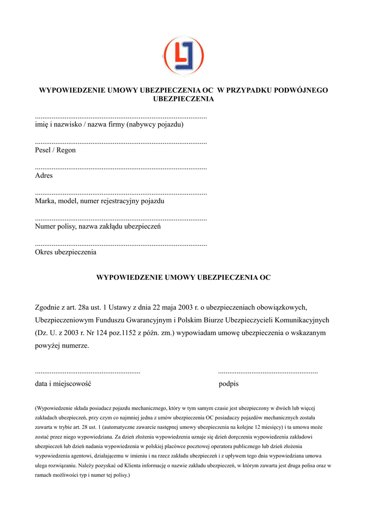 WYPOWIEDZENIE UMOWY UBEZPIECZENIA OC W PRZYPADKU PODWÓJNEGO UBEZPIECZENIA ............................................................................................. imię i nazwisko / nazwa firmy (nabywcy pojazdu) ............................................................................................. Pesel / Regon ............................................................................................. Adres ............................................................................................. Marka, model, numer rejestracyjny pojazdu ............................................................................................. Numer polisy, nazwa zakłądu ubezpieczeń ............................................................................................. Okres ubezpieczenia WYPOWIEDZENIE UMOWY UBEZPIECZENIA OC Zgodnie z art. 28a ust. 1 Ustawy z dnia 22 maja 2003 r. o ubezpieczeniach obowiązkowych, Ubezpieczeniowym Funduszu Gwarancyjnym i Polskim Biurze Ubezpieczycieli Komunikacyjnych (Dz. U. z 2003 r. Nr 124 poz.1152 z późn. zm.) wypowiadam umowę ubezpieczenia o wskazanym powyżej numerze. ......................................................... ...................................................... data i miejscowość podpis (Wypowiedzenie składa posiadacz pojazdu mechanicznego, który w tym samym czasie jest ubezpieczony w dwóch lub więcej zakładach ubezpieczeń, przy czym co najmniej jedna z umów ubezpieczenia OC posiadaczy pojazdów mechanicznych została zawarta w trybie art. 28 ust. 1 (automatyczne zawarcie następnej umowy ubezpieczenia na kolejne 12 miesięcy) i ta umowa może zostać przez niego wypowiedziana. Za dzień złożenia wypowiedzenia uznaje się dzień doręczenia wypowiedzenia zakładowi ubezpieczeń lub dzień nadania wypowiedzenia w polskiej placówce pocztowej operatora publicznego lub dzień złożenia wypowiedzenia agentowi, działającemu w imieniu i na rzecz zakładu ubezpieczeń i z upływem tego dnia wypowiedziana umowa ulega rozwiązaniu. Należy pozyskać od Klienta informację o nazwie zakładu ubezpieczeń, w którym zawarta jest druga polisa oraz w ramach możliwości typ i numer tej polisy.)