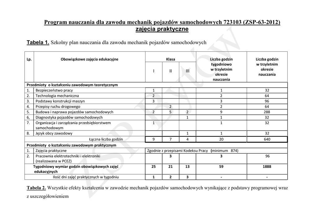 Program nauczania dla zawodu mechanik pojazdów samochodowych 723103 (ZSP-63-2012) zajęcia praktyczne Tabela 1. Szkolny plan nauczania dla zawodu mechanik pojazdów samochodowych Lp. Obowiązkowe zajęcia edukacyjne Klasa I Przedmioty o kształceniu zawodowym teoretycznym 1. Bezpieczeństwo pracy 2. Technologia mechaniczna 3. Podstawy konstrukcji maszyn 4. Przepisy ruchu drogowego 5. Budowa i naprawa pojazdów samochodowych 6, Diagnostyka pojazdów samochodowych 7. Organizacja i zarządzania przedsiębiorstwem samochodowym 8. Język obcy zawodowy Łączna liczba godzin Przedmioty o kształceniu zawodowym praktycznym 1. Zajęcia praktyczne 2. Pracownia elektrotechniki i elektroniki (realizowana w PCEZ) Tygodniowy wymiar godzin obowiązkowych zajęć edukacyjnych Ilość dni zajęć praktycznych w tygodniu II III 1 2 3 2 2 5 2 1 1 9 7 1 4 Liczba godzin tygodniowo w trzyletnim okresie nauczania Liczba godzin w trzyletnim okresie nauczania 1 2 3 2 9 1 1 32 64 96 64 288 32 32 1 20 32 640 Zgodnie z przepisami Kodeksu Pracy (minimum 874) 3 3 96 25 21 13 59 1888 1 2 3 - - Tabela 2. Wszystkie efekty kształcenia w zawodzie mechanik pojazdów samochodowych wynikające z podstawy programowej wraz z uszczegółowieniem Uwaga: kolorem żółtym wyróżniono uszczegółowione efekty kształcenia do zrealizowania na zajęciach praktycznych Nazwa grupy efektów kształcenia Efekty kształcenia Uczeń: Uszczegółowione efekty kształcenia Uczeń po zrealizowaniu zajęć potrafi: Efekty kształcenia wspólne dla wszystkich zawodów Bezpieczeństwo i higiena pracy (BHP) BHP(1) rozróżnia pojęcia związane z bezpieczeństwem i higieną pracy, ochroną przeciwpożarową, ochroną środowiska i ergonomią BHP(1)1. wyjaśnić pojęcia związane z bezpieczeństwem i higieną pracy; BHP(1)2. wyjaśnić pojęcia związane z ochroną przeciwpożarową oraz ochroną środowiska BHP(1)3. wyjaśnić pojęcia związane z ergonomią; BHP(2) rozróżnia zadania i uprawnienia instytucji oraz służb BHP(2)1. wymienić instytucje oraz służby działające w zakresie ochrony pracy działających w zakresie ochrony pracy i ochrony środowiska w i ochrony środowiska w Polsce; Polsce BHP(2)2. scharakteryzować zadania i uprawnienia instytucji oraz służb działających w zakresie ochrony pracy i ochrony środowiska w Polsce; BHP(2)3. scharakteryzować podstawowe przepisy dotyczące prawnej ochrony pracy; BHP(3) określa prawa i obowiązki pracownika oraz pracodawcy BHP(3)1. wskazać prawa i obowiązki pracownika w zakresie bezpieczeństwa i w zakresie bezpieczeństwa i higieny pracy; higieny pracy; BHP(3)2. wskazać prawa i obowiązki pracodawcy w zakresie bezpieczeństwa i higieny pracy; BHP(3)3. określić konsekwencje wynikające z nieprzestrzegania praw i obowiązków pracownika w zakresie bezpieczeństwa i higieny pracy; BHP(3)4. określić procedurę postępowania w zakresie bezpieczeństwa i higieny pracy w przedsiębiorstwie samochodowym; BHP(4) przewiduje zagrożenia dla zdrowia i życia człowieka oraz BHP(4)1. określić zagrożenia dla zdrowia i życia człowieka związane z mienia i środowiska związane z wykonywaniem zadań wykonywaniem zadań zawodowych; zawodowych; BHP(4)2. określić zagrożenia dla mienia i środowiska związane z wykonywaniem zadań zawodowych; BHP(4)3. dokonać analizy możliwych zagrożeń dla zdrowia i życia człowieka oraz mienia i środowiska związanych z wykonywaniem zadań zawodowych; BHP(4)4. scharakteryzować sposoby przeciwdziałania zagrożeniom przy wykonywaniu zadań zawodowych; BHP(5) określa zagrożenia związane z występowaniem BHP(5)1. określić zagrożenia związane z występowaniem szkodliwych szkodliwych czynników w środowisku pracy; czynników w środowisku pracy; Bezpieczeństwo i higiena pracy (BHP) BHP(6) określa skutki oddziaływania czynników szkodliwych na organizm człowieka BHP(7) organizuje stanowisko pracy zgodnie z obowiązującymi wymaganiami ergonomii, przepisami bezpieczeństwa i higieny pracy, ochrony przeciwpożarowej i ochrony środowiska; BHP(5)2. scharakteryzować zagrożenia związane z występowaniem szkodliwych czynników w środowisku pracy; BHP(5)3. zapobiec zagrożeniom związanym z występowaniem szkodliwych czynników w środowisku pracy podczas diagnostyki pojazdów samochodowych; BHP(5)4. zapobiec zagrożeniom związanym z występowaniem szkodliwych czynników w środowisku pracy podczas naprawy pojazdów samochodowych; BHP(6)1. określić oddziaływanie czynników szkodliwych na organizm człowieka; BHP(6)2. wskazać skutki oddziaływania czynników szkodliwych na organizm człowieka; BHP(6)3. zidentyfikować czynniki szkodliwe dla organizmu człowieka występujące przy wykonywaniu zadań zawodowych; BHP(6)4. scharakteryzować skutki oddziaływania czynników szkodliwych na organizm człowieka; BHP(6)5. określić typowe choroby zawodowe występujące przy wykonywaniu zadań zawodowych BHP(7)1. zorganizować stanowisko pracy zgodnie z obowiązującymi wymaganiami ergonomii do diagnostyki zespołów i podzespołów pojazdów samochodowych BHP(7)2. zorganizować stanowisko pracy zgodnie z przepisami bezpieczeństwa i higieny pracy do naprawy silnika pojazdu samochodowego BHP(7)3. zorganizować stanowisko pracy zgodnie z obowiązującymi wymaganiami ergonomii, przepisami bezpieczeństwa i higieny pracy, ochrony przeciwpożarowej i ochrony środowiska w zakresie niezbędnym do wykonywania rysunków technicznych; BHP(7)4. zorganizować stanowisko pracy do diagnostyki pojazdów samochodowych zgodnie z obowiązującymi wymaganiami ergonomii, przepisami bezpieczeństwa i higieny pracy, ochrony przeciwpożarowej i ochrony środowiska; BHP(7)5. zorganizować stanowisko pracy do naprawy pojazdów samochodowych zgodnie z obowiązującymi wymaganiami ergonomii, przepisami bezpieczeństwa i higieny pracy, ochrony przeciwpożarowej i ochrony środowiska; Bezpieczeństwo i higiena pracy (BHP) BHP(8) stosuje środki ochrony indywidualnej i