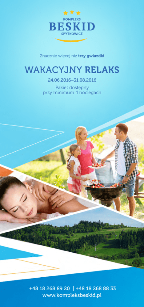 Znacznie więcej niż trzy gwiazdki WAKACYJNY RELAKS 24.06.2016–31.08.2016 Pakiet dostępny przy minimum 4 noclegach +48 18 268 89 20 | +48 18 268 88 33 www.kompleksbeskid.pl WAKACYJNY RELAKS CENA PAKIETU: Osoba dorosła – 145,00 zł/doba. Dziecko od 3 do 10 lat – 90,00 zł/doba. Dopłata do pokoju 1 osobowego – 70 zł/doba. Dopłata do pobytu w apartamencie lub pokoju studio – 100 zł/doba. Dziecko do lat 3, będące pod opieką 2 osób dorosłych – GRATIS! PAKIET OBEJMUJE: Nocleg w przytulnym pokoju. Wyśmienite śniadania w formie bufetu. Doskonałe trzydaniowe obiadokolacje. Nieograniczony dostęp do strefy relaksu (basen, jacuzzi, mini siłownia). Wieczorne seanse w saunie. Zniżkę w wysokości 10% na pielęgnacyjne zabiegi spa. Bezpłatny parking. Bezprzewodowy internet na terenie całego ośrodka. ATRAKCJE W CENIE PAKIETU: Poniedziałkowa obiadokolacja w formie grilla. Zabawa taneczna. Możliwość wypożyczenia kijków do Nordic Walking. Wycieczka po Spytkowicach z przewodnikiem. Zorganizowane zabawy dla dzieci i wieczorne seanse bajek na dużym ekranie Niewykorzystanie któregokolwiek elementu wchodzącego w skład pakietu nie wpływa na zmianę jego wartości. Istnieje możliwośc rozszerzenia pakietu o dodatkowe atrakcje.