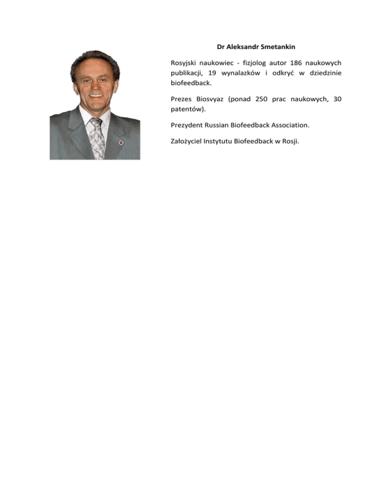 Dr Aleksandr Smetankin Rosyjski naukowiec - fizjolog autor 186 naukowych publikacji, 19 wynalazków i odkryć w dziedzinie biofeedback. Prezes Biosvyaz (ponad 250 prac naukowych, 30 patentów). Prezydent Russian Biofeedback Association. Założyciel Instytutu Biofeedback w Rosji.