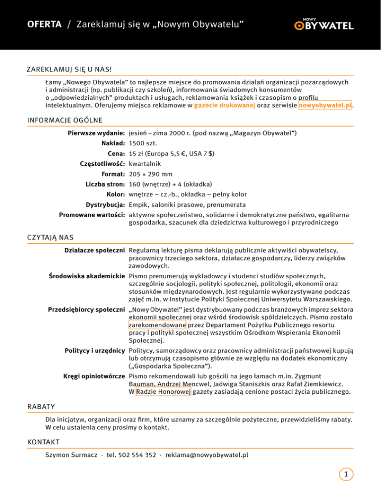OFERTA / Zareklamuj się w „Nowym Obywatelu” ZAREKLAMUJ SIĘ U NAS! Łamy „Nowego Obywatela” to najlepsze miejsce do promowania działań organizacji pozarządowych i administracji (np. publikacji czy szkoleń), informowania świadomych konsumentów o „odpowiedzialnych” produktach i usługach, reklamowania książek i czasopism o profilu intelektualnym. Oferujemy miejsca reklamowe w gazecie drukowanej oraz serwisie nowyobywatel.pl. INFORMACJE OGÓLNE Pierwsze wydanie: jesień – zima 2000 r. (pod nazwą „Magazyn Obywatel”) Nakład: 1500 szt. Cena: 15 zł (Europa 5,5 €, USA 7 $) Częstotliwość:kwartalnik Format: 205 × 290 mm Liczba stron: 160 (wnętrze) + 4 (okładka) Kolor: wnętrze – cz.-b., okładka – pełny kolor Dystrybucja: Empik, saloniki prasowe, prenumerata Promowane wartości: aktywne społeczeństwo, solidarne i demokratyczne państwo, egalitarna gospodarka, szacunek dla dziedzictwa kulturowego i przyrodniczego CZYTAJĄ NAS Działacze społeczni Regularną lekturę pisma deklarują publicznie aktywiści obywatelscy, pracownicy trzeciego sektora, działacze gospodarczy, liderzy związków zawodowych. Środowiska akademickie Pismo prenumerują wykładowcy i studenci studiów społecznych, szczególnie socjologii, polityki społecznej, politologii, ekonomii oraz stosunków międzynarodowych. Jest regularnie wykorzystywane podczas zajęć m.in. w Instytucie Polityki Społecznej Uniwersytetu Warszawskiego. Przedsiębiorcy społeczni „Nowy Obywatel” jest dystrybuowany podczas branżowych imprez sektora ekonomii społecznej oraz wśród środowisk spółdzielczych. Pismo zostało zarekomendowane przez Departament Pożytku Publicznego resortu pracy i polityki społecznej wszystkim Ośrodkom Wspierania Ekonomii Społecznej. Politycy i urzędnicy Politycy, samorządowcy oraz pracownicy administracji państwowej kupują lub otrzymują czasopismo głównie ze względu na dodatek ekonomiczny („Gospodarka Społeczna”). Kręgi opiniotwórcze Pismo rekomendowali lub gościli na jego łamach m.in. Zygmunt Bauman, Andrzej Mencwel, Jadwiga Staniszkis oraz Rafał Ziemkiewicz. W Radzie Honorowej gazety zasiadają cenione postaci życia publicznego. RABAT Y Dla inicjatyw, organizacji oraz firm, które uznamy za szczególnie pożyteczne, przewidzieliśmy rabaty. W celu ustalenia ceny prosimy o kontakt. KONTAKT Szymon Surmacz · tel. 502 554 352 · [email protected] 1 Cennik i wymiary miejsc reklamowych – kwartalnik WNĘTRZE miejsce cena (zł) wymiary (mm) cała strona 2000 205 × 290 pół strony poziom 1200 205 × 139 pół strony pion 1200 100 × 290 1/4 strony poziom 800 160 × 55 1/4 strony pion 800 76,5 × 117 1/8 strony 500 76,5 × 55 strona 2 lub 3 (cała) 3000 205 × 290 strona 2 lub 3 (pół) 2000 205 × 145 4000 205 × 290 OKŁADKA strona 4 205 160 240 290 Uwaga! Podajemy formaty netto – reklamy drukowane „na spad” należy powiększyć z każdej strony o 3 mm. tel. 502 554 352 · [email protected] 2 Cennik i wymiary miejsc reklamowych – nowyobywatel.pl 1 Pod menu głównym (strona główna) 1 tydzień – 700 zł 1 miesiąc – 2400 zł 1 960 × 100 px 2 Pod „kołowrotkiem” (strona główna) 1 tydzień – 400 zł 1 miesiąc – 1200 zł 462 × 55 px 2 3 Trzeci łam (na każdej podstronie) 1 tydzień – 400 zł 1 miesiąc – 1200 zł 140 × 170 px 4 Czwarty łam (pod „Biblioteką Obywatela”) (na każdej podstronie) 1 tydzień – 400 zł 1 miesiąc – 1200 zł 230 × 80 px Linki pozycjonujące Nasz serwis jest bardzo dobrze pozycjonowany w wyszukiwarkach, dzięki czemu również strony WWW, do których prowadzą zamieszczane przez nas odnośniki, osiągają wyższe miejsca w wynikach wyszukiwania. Wykupienie linków pozycjonujących na stronie nowyobywatel.pl daje szczególnie dobre efekty reklamowe (tu wyjaśnienie). Usługa ta wyceniana jest indywidualnie – zainteresowanych prosimy o kontakt. tel. 502 554 352 · [email protected] 3 4 3 Oferta specjalna MECENAS NUMERU reklama na okładce + podziękowania za spisem treści (cała strona czarno-biała) + banner na WWW, nad działem „Opinie”, przez cały okres dostępności pisma w ogólnopolskiej dystrybucji (3 miesiące) + podziękowania na naszym profilu na portalu Facebook, dwukrotnie – zaraz po premierze nowego numeru i bezpośrednio przed pojawieniem się następnego. = 7500 zł tel. 502 554 352 · [email protected] 4