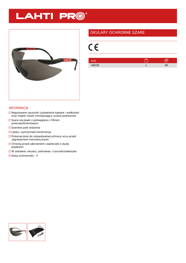 Powered by TCPDF (www.tcpdf.org) OKULARY OCHRONNE SZARE Kod 46038 INFORMACJE Regulowane zauszniki (ustawienie kątowe i wzdłużne) oraz miękki nosek zmniejszający ryzyko podrażnień Szare soczewki z poliwęglanu z filtrem przeciwolśnieniowym Szerokie pole widzenia Lekka i wytrzymała konstrukcja Przeznaczone do indywidualnej ochrony oczu przed zagrożeniami mechanicznymi Chronią przed uderzeniem cząsteczek o dużej prędkości W zestawie: okulary, pokrowiec i sznurek/zawieszka Klasa ochronności - F x 48